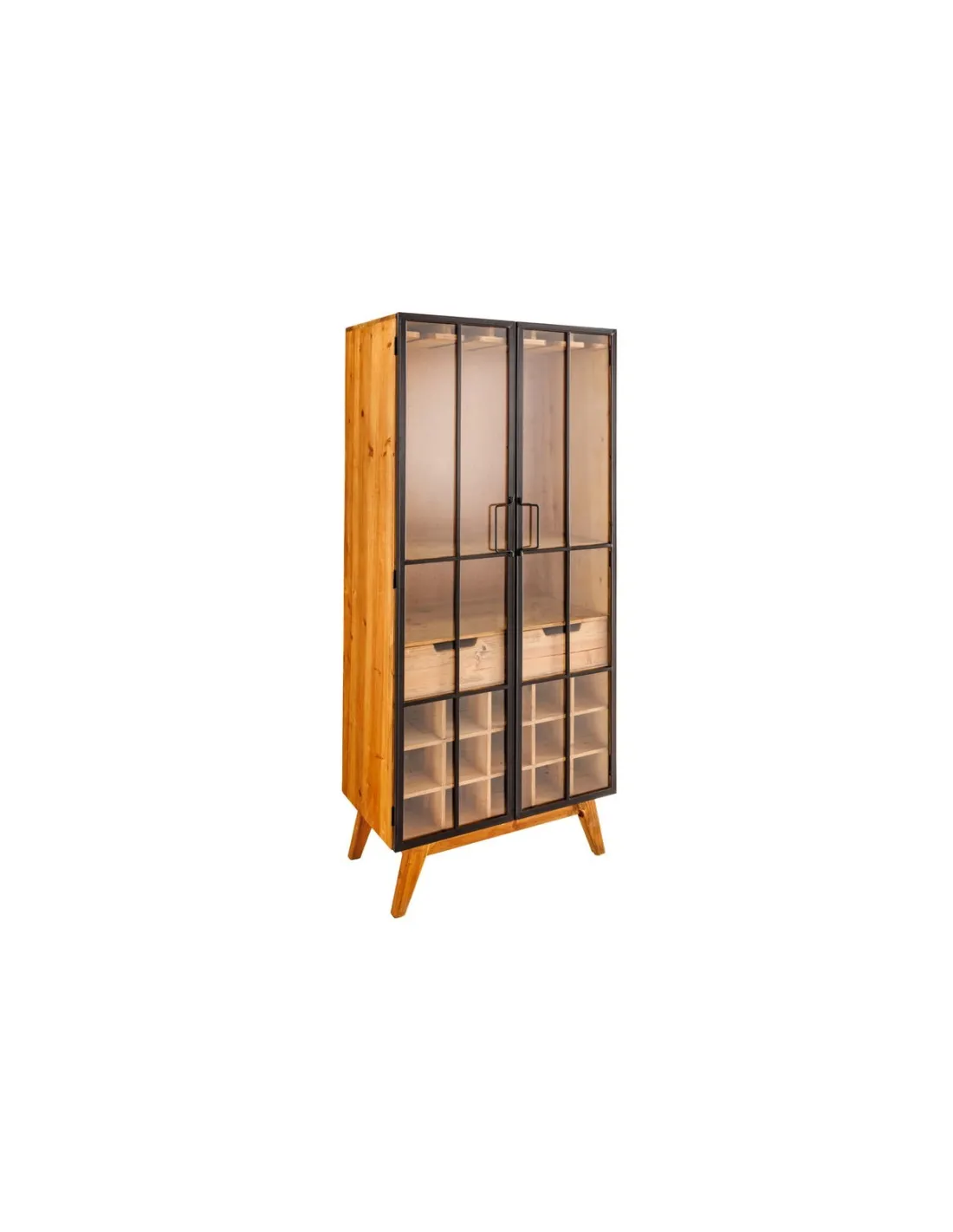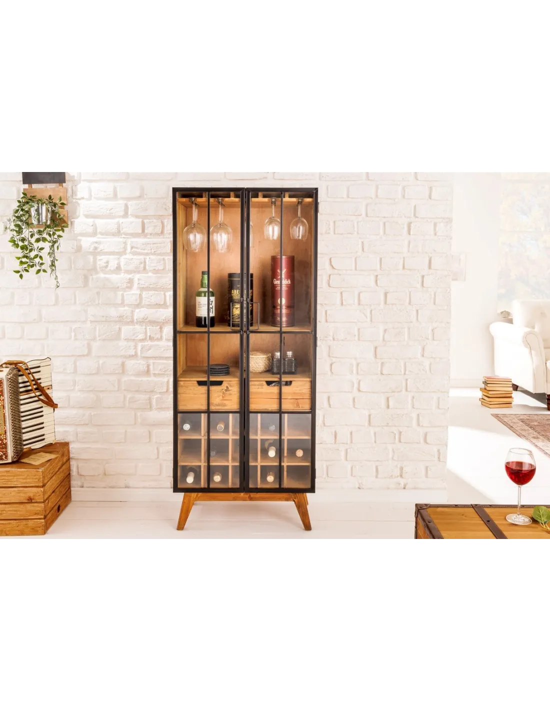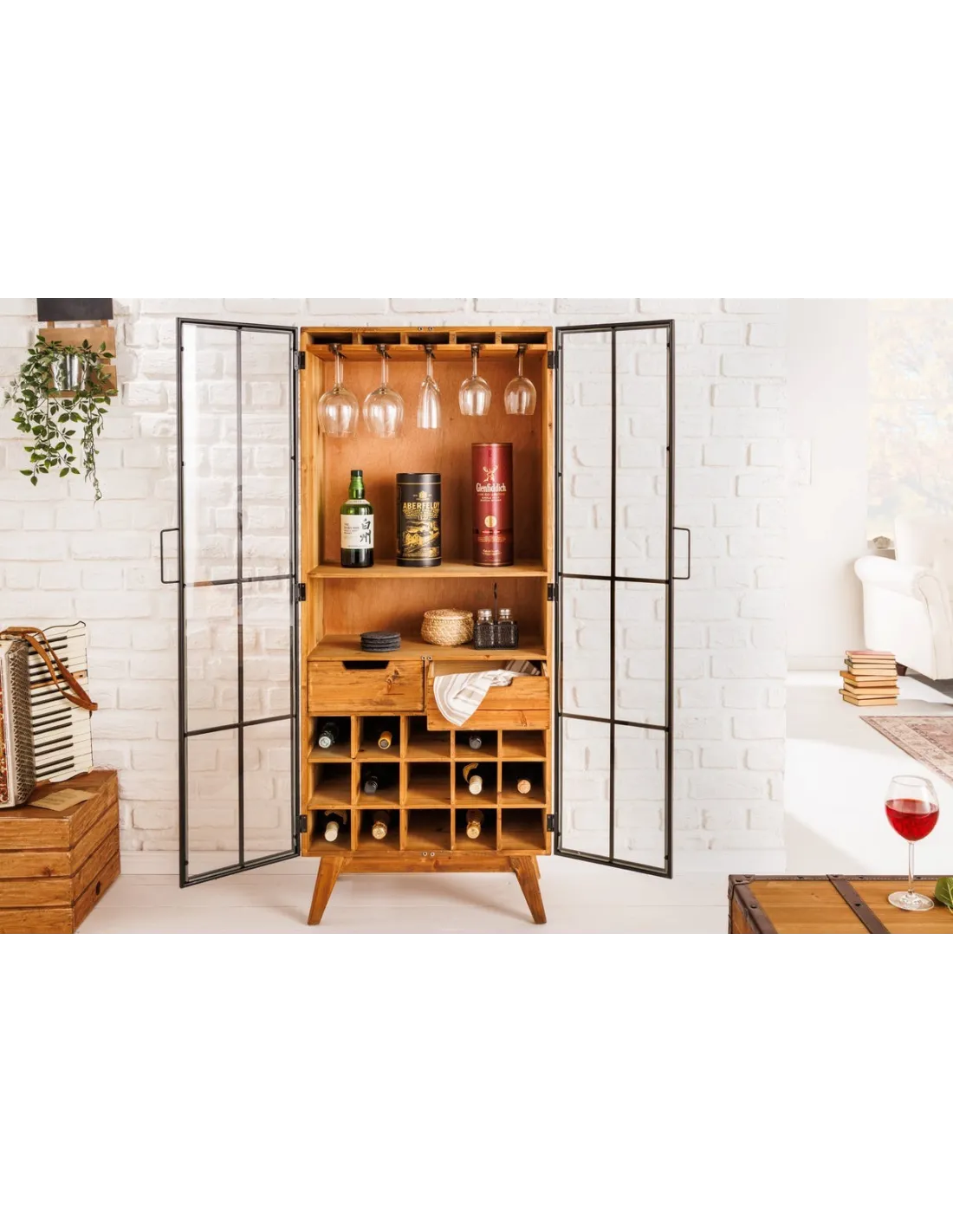 Ce meuble bar est une combinaison parfaite de fonctionnalité et de design élégant, idéal pour mettre en valeur vos bouteilles et accessoires de bar dans un style rétro industriel.