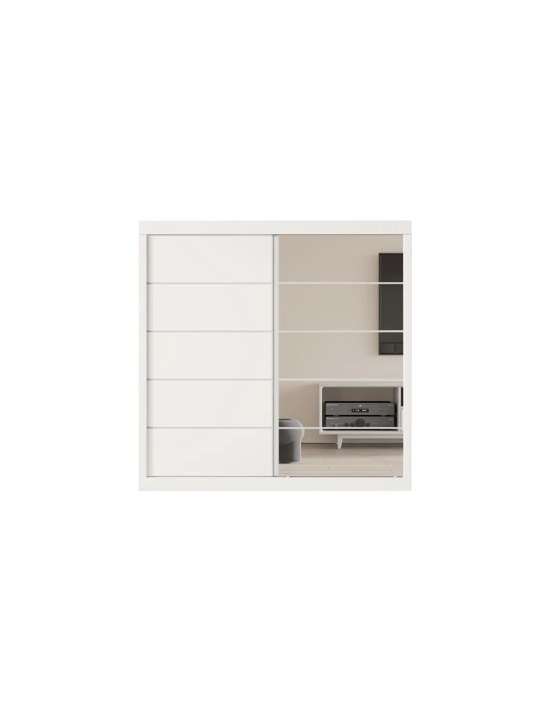 - Fonctionnalité élégante : L’association de portes coulissantes et du miroir central confère à cette armoire une touche de sophistication discrète.