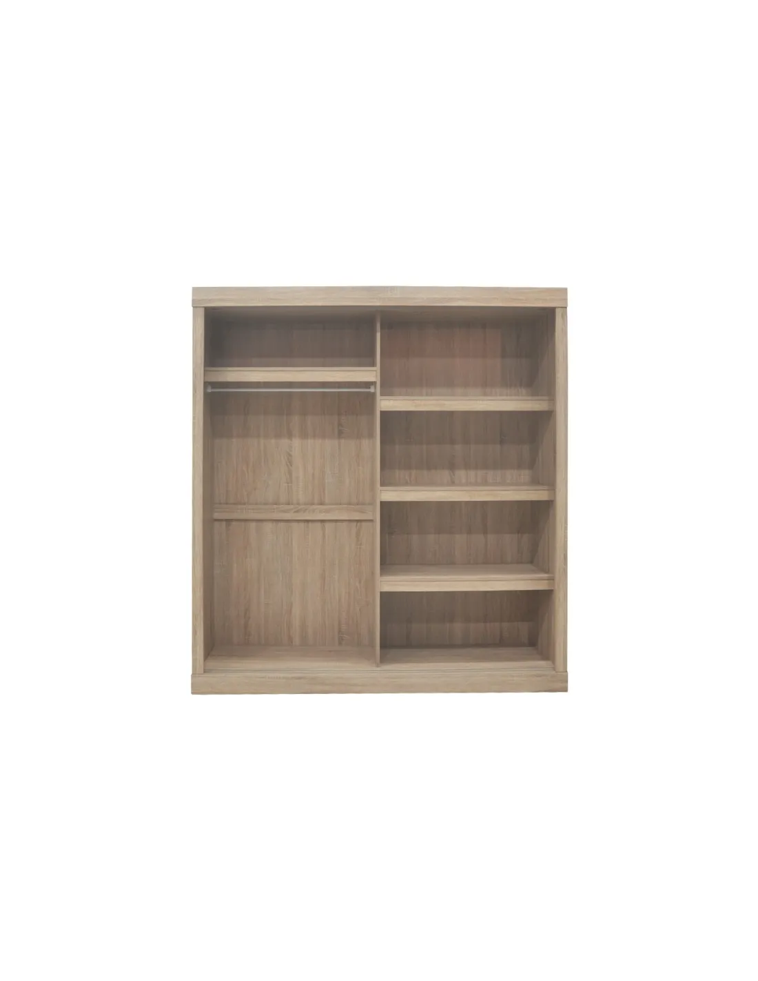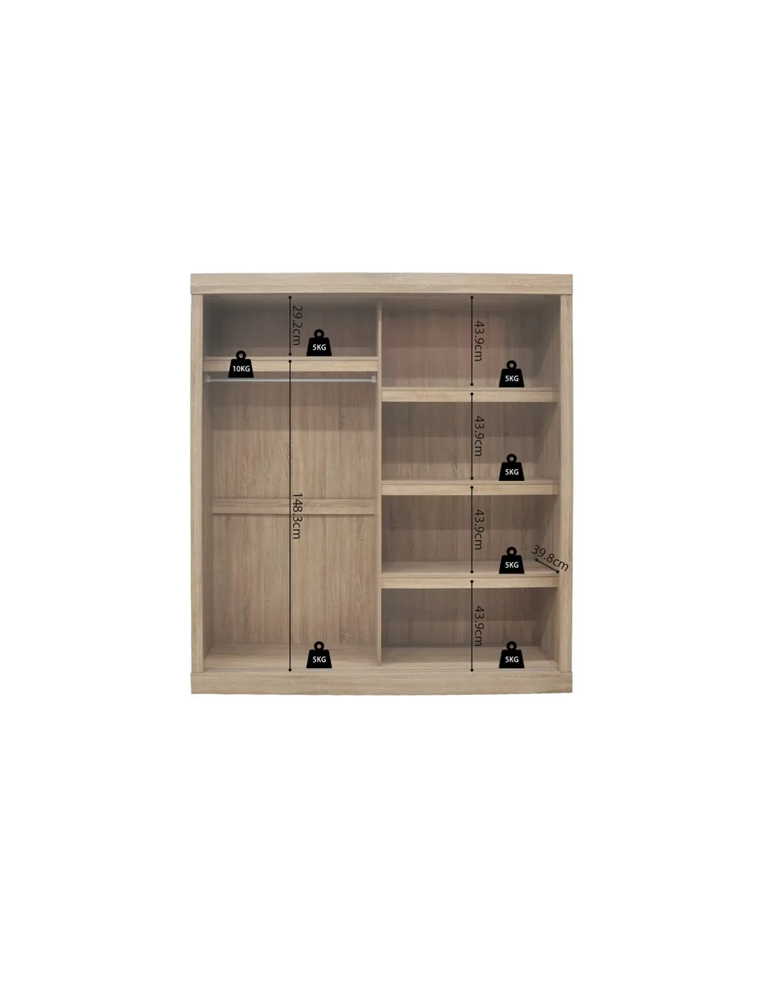 - Portes coulissantes pratiques et élégantes : Les 2 portes coulissantes offrent un accès facile et sans effort aux différents compartiments de l'armoire. Elles sont idéales pour les espaces plus réduits, car elles ne nécessitent pas d'espace pour l'ouverture.