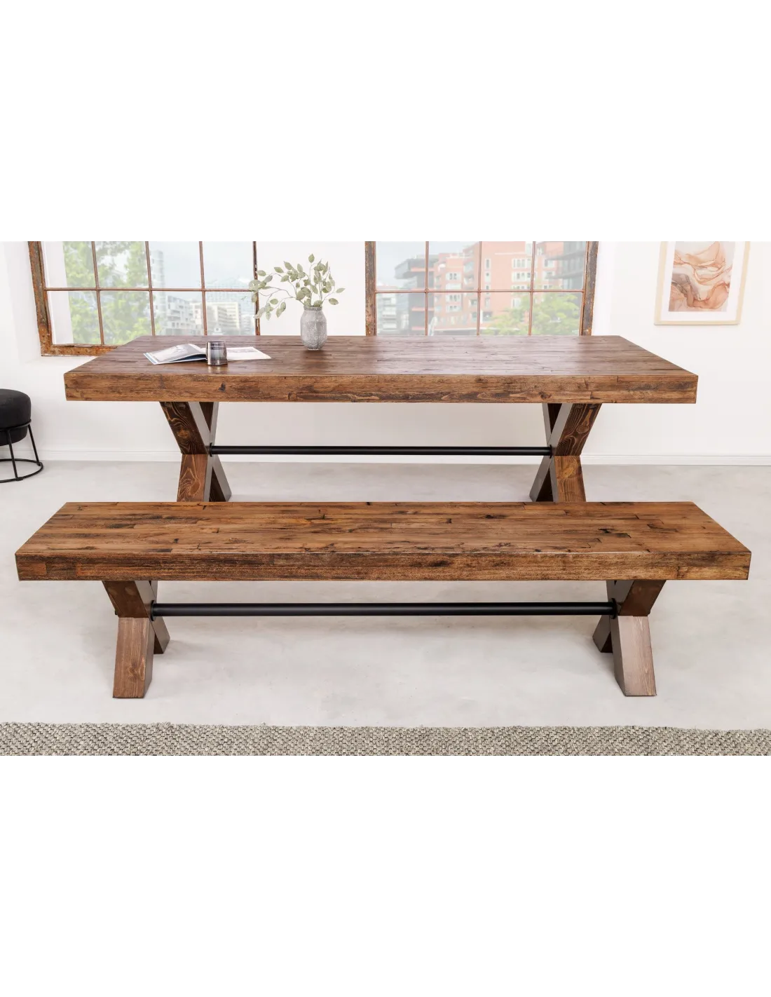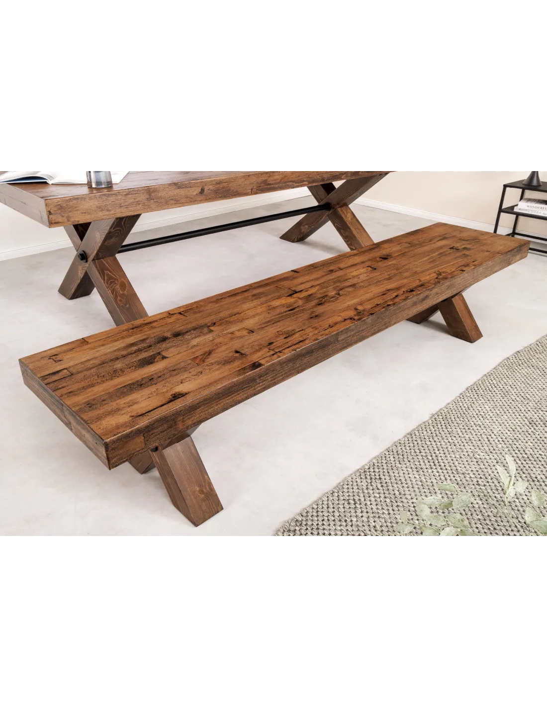 Apportez style et authenticité à votre intérieur avec le banc industriel GOLIATH 180 cm. Son assise en pin naturel et sa structure en X métal noir créent un équilibre parfait entre solidité et design, pour une touche chaleureuse et contemporaine.