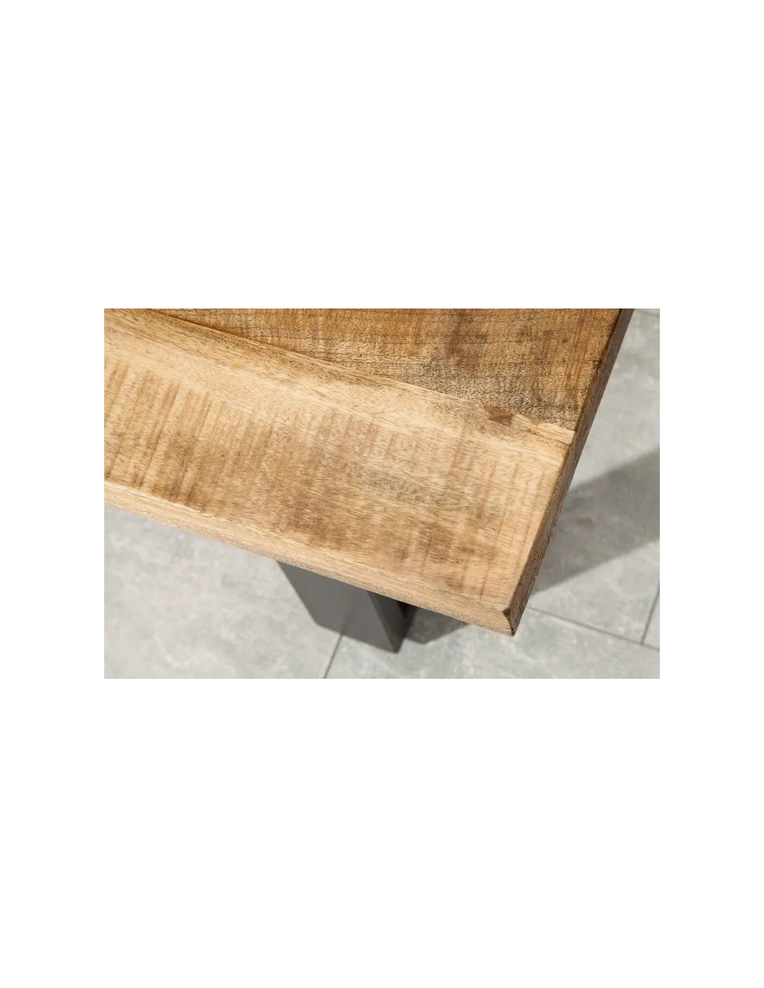 La structure métallique solide contraste avec la texture authentique du bois massif, créant une pièce au caractère brut et raffiné à la fois.
