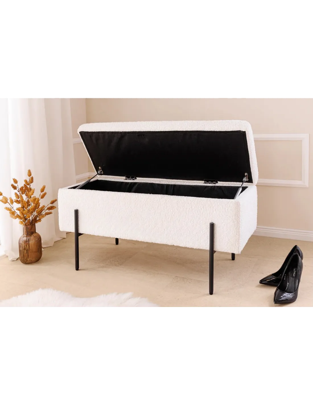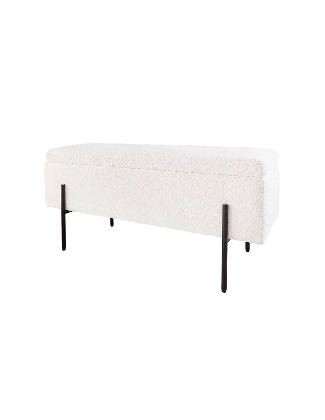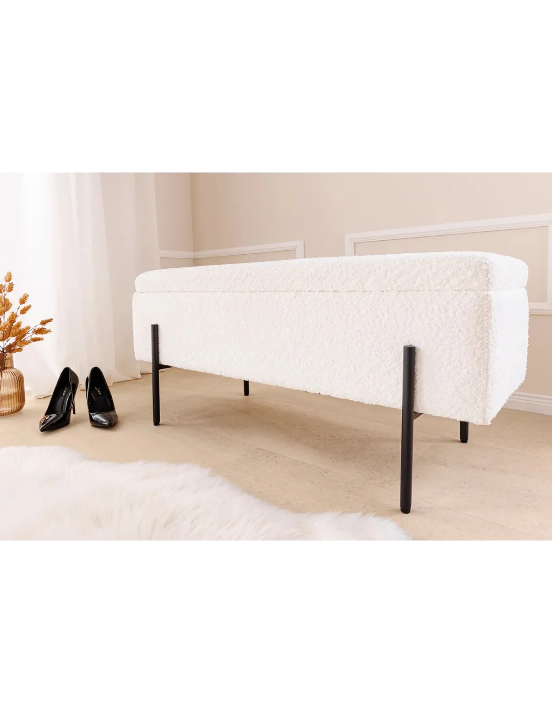 Banc SCARLETT 100 cm en bouclé blanc et métal noir – Élégance et praticité pour votre intérieur