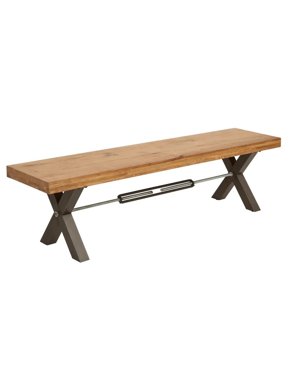 Le piètement en X, en métal noir poudré, confère au banc une allure industrielle affirmée et une stabilité à toute épreuve. Ce contraste entre le bois clair et le métal foncé souligne un style fort et contemporain, parfait pour les intérieurs modernes, lofts ou ambiances rustiques revisitées.