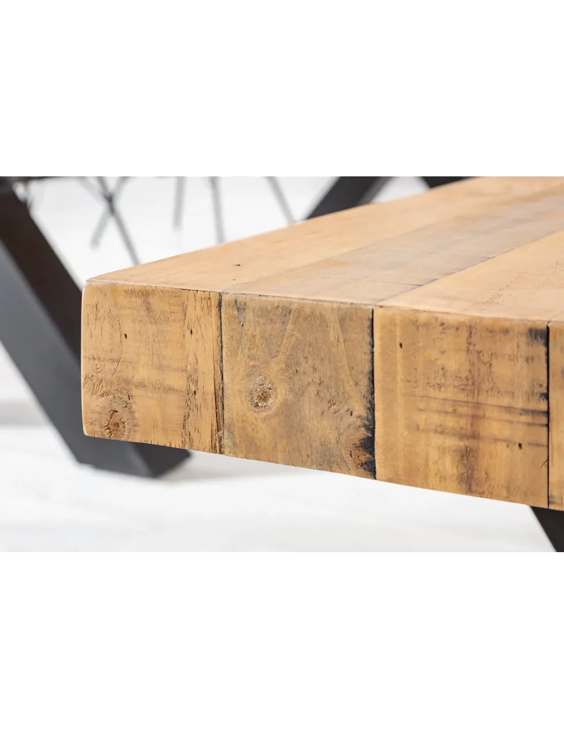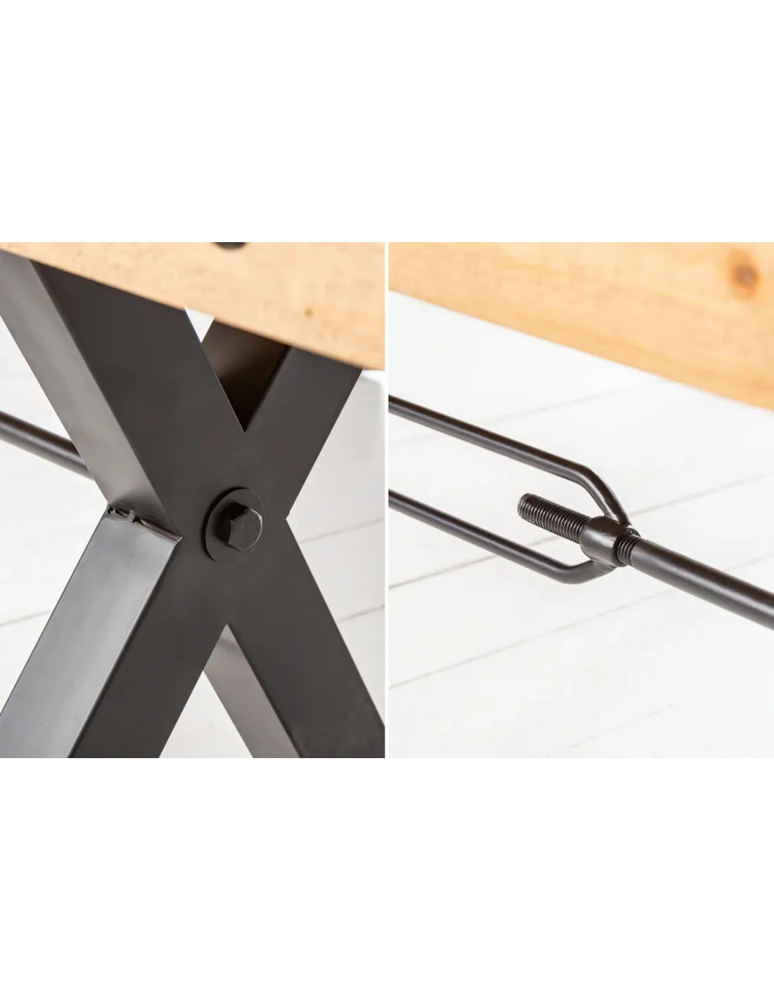 Son piètement en fer à la forme croisée emblématique assure une stabilité irréprochable et souligne son style industriel affirmé. Le contraste entre le bois clair et le métal noir crée un équilibre visuel harmonieux, idéal pour sublimer un intérieur moderne, loft ou rustique chic.