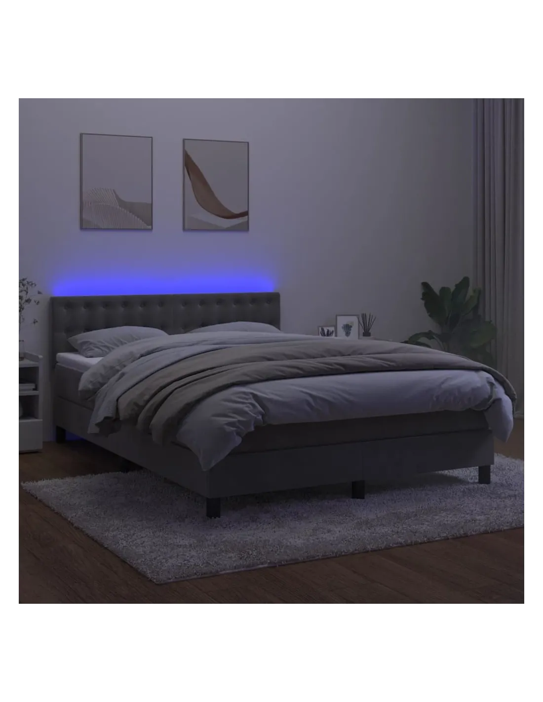 Utilisez ce sommier tapissier avec matelas et LED pour profiter d'un sommeil réparateur ! C'est le point central de votre chambre à coucher. Velours doux : le velours est un tissu doux et luxueux qui se reconnaît à son tas dense de fibres uniformément coupées qui ont une touche lisse. Le tissu en velours présente un toucher doux distinctif, ce qui le rend confortable au toucher.Tête de lit pratique : la tête de lit est réglable en hauteur selon vos préférences. La tête de lit vous offre un excellent soutien du dos lorsque vous êtes assis dans votre lit pour lire ou regarder la télévision.Bande LED colorée : apportez de l'éclairage dans l'obscurité avec des lumières LED colorées !Matelas à ressorts ensachés : le ressort ensaché individuel intégré est connu pour sa très haute qualité tout en assurant un haut niveau de durabilité et d'adaptabilité. Il peut absorber efficacement le bruit et les chocs causés par les sauts et les rotations.Protège-matelas doux pour la peau : le protège-matelas est recouvert d'un tissu résistant et doux pour la peau, ce qui le rend souple et confortable. Remarque :Pour des raisons d'hygiène, le matelas ne peut pas être retourné si l'emballage est retiré ou ouvert.Chaque produit est livré avec un manuel de montage dans la boîte pour un montage facile.Seule la partie avec un symbole de ciseaux peut être coupée et seule la partie avec l'USB continuera à fonctionner comme avant.Ce produit est doté d'un connecteur USB, mais la source d'alimentation certifiée de USB 5V n'est pas incluse.
