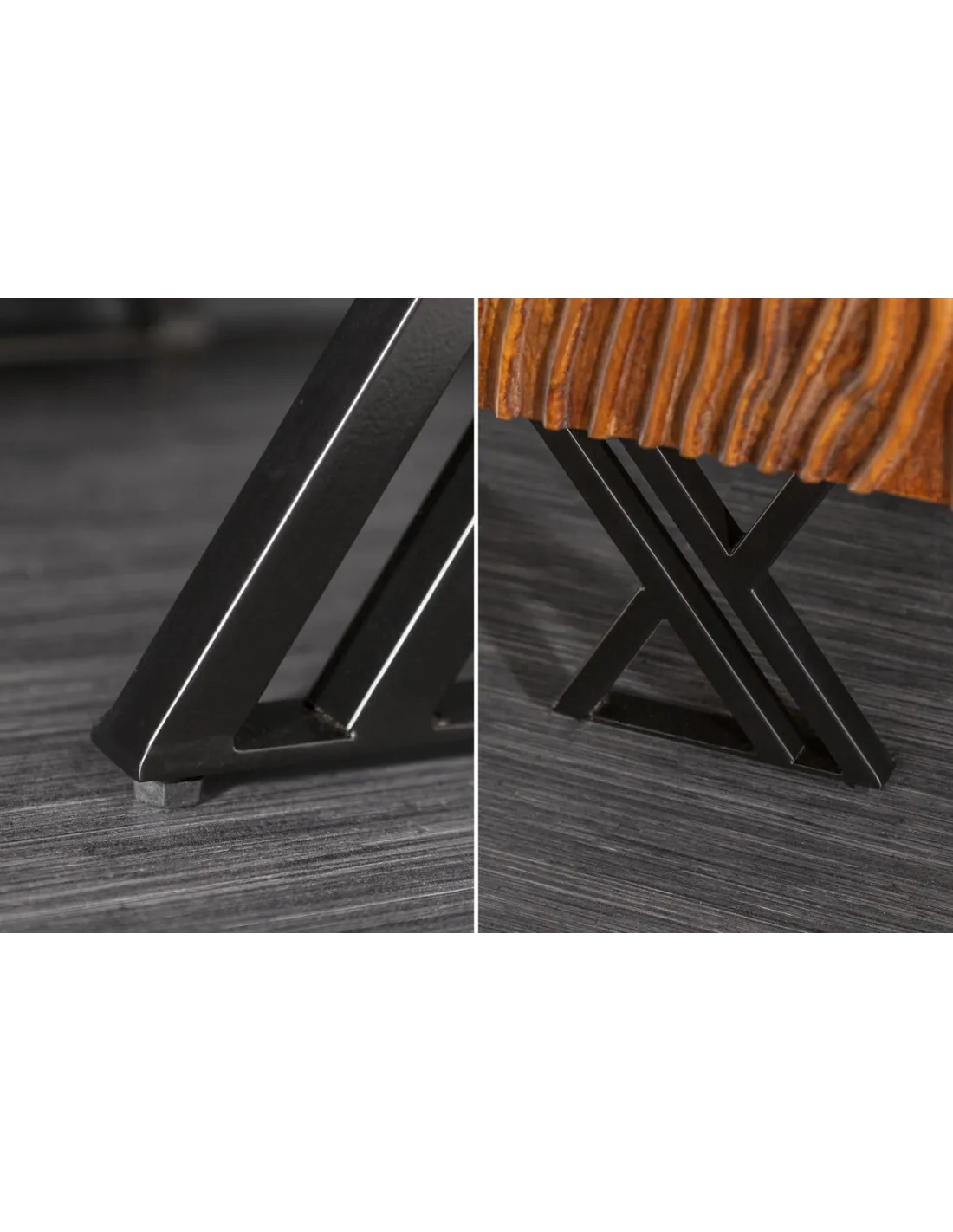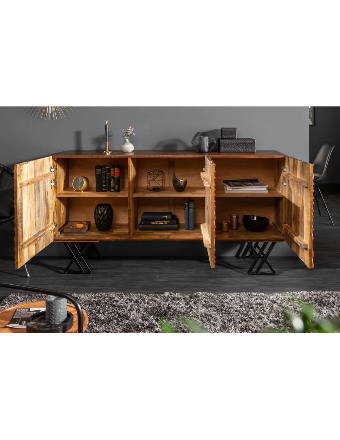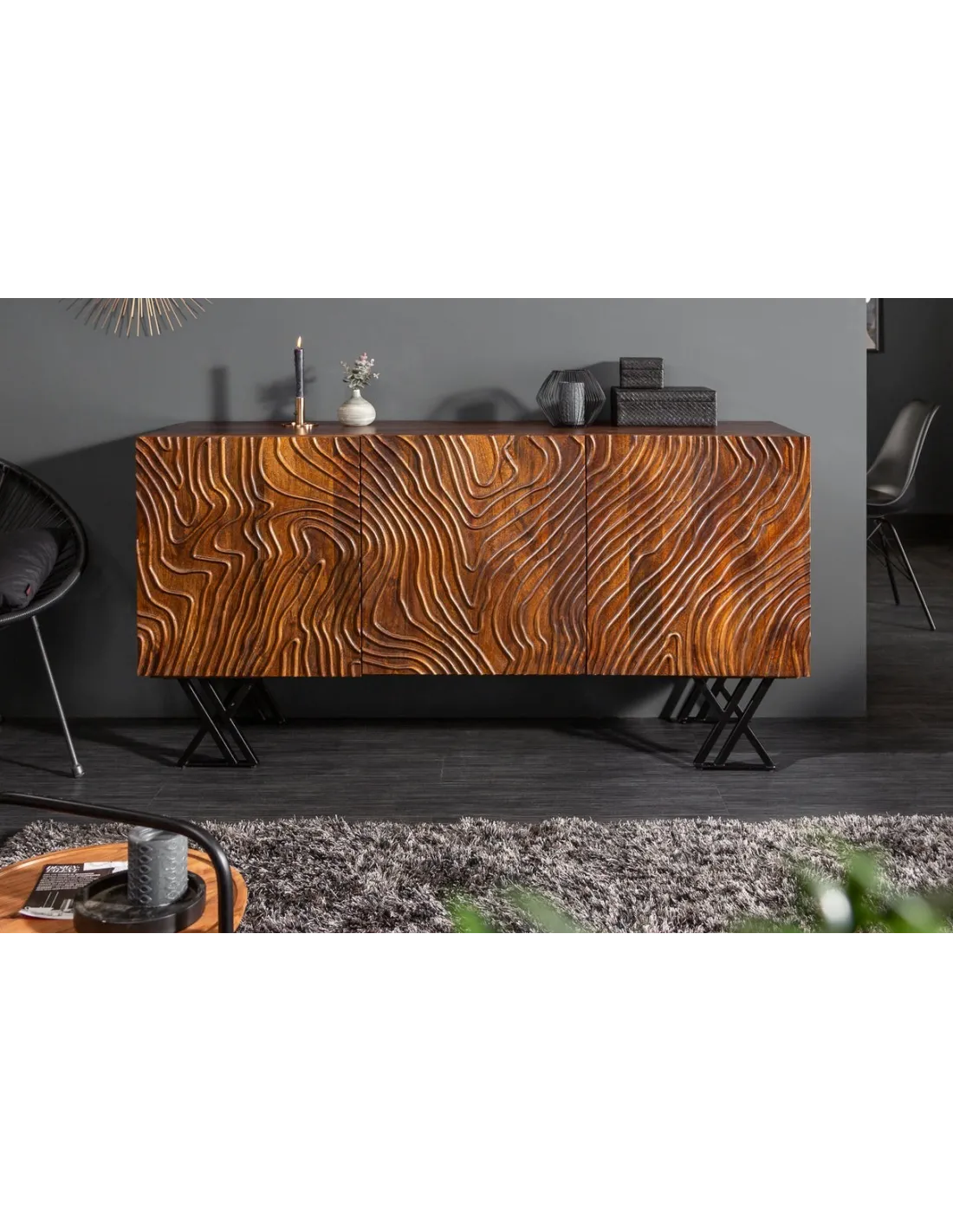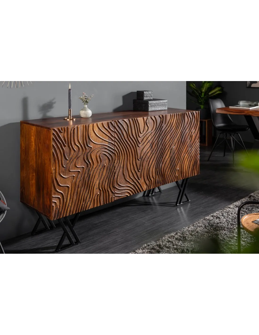 Le buffet Fluid s'inscrit dans un style industriel moderne, parfait pour les intérieurs contemporains et rustiques. Ses portes en bois massif sont sculptées avec soin, et les finitions en métal noir mat ajoutent une touche urbaine sophistiquée. Les pieds en métal surélevés apportent à l’ensemble une légèreté tout en garantissant une stabilité parfaite.
