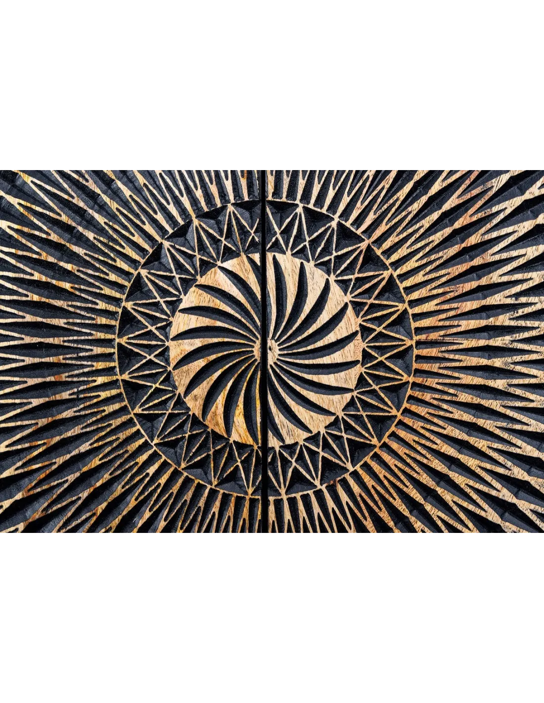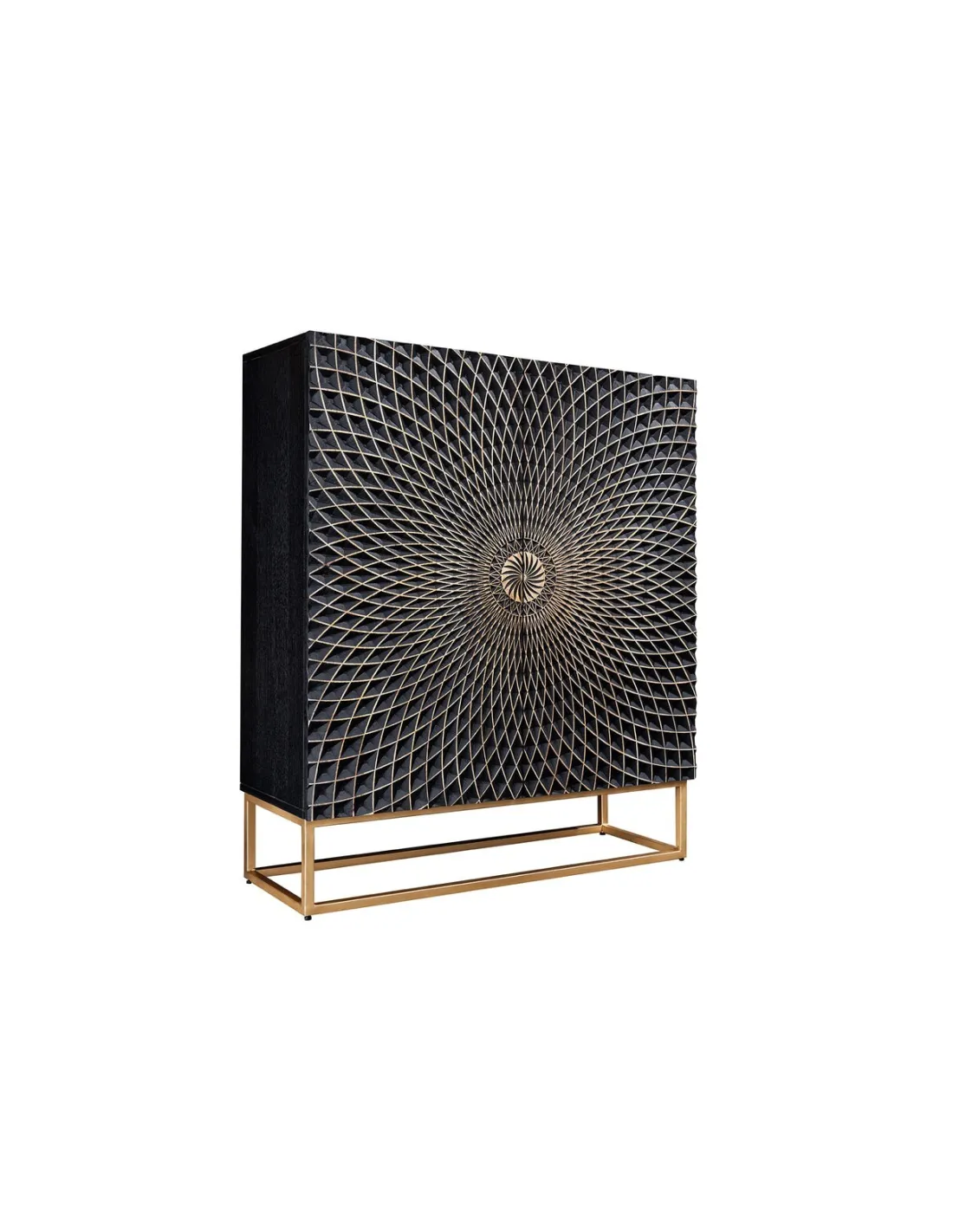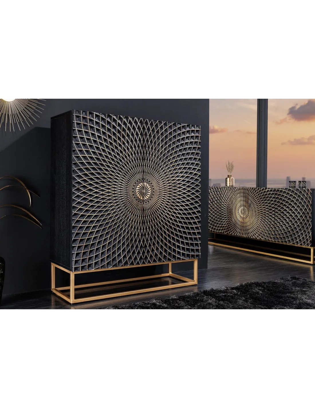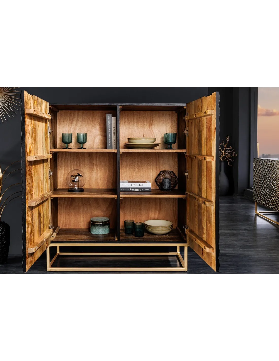 Son façade sculptée en bois de manguier massif révèle un effet 3D spectaculaire, tandis que la structure en métal doré apporte une touche subtile de luxe.