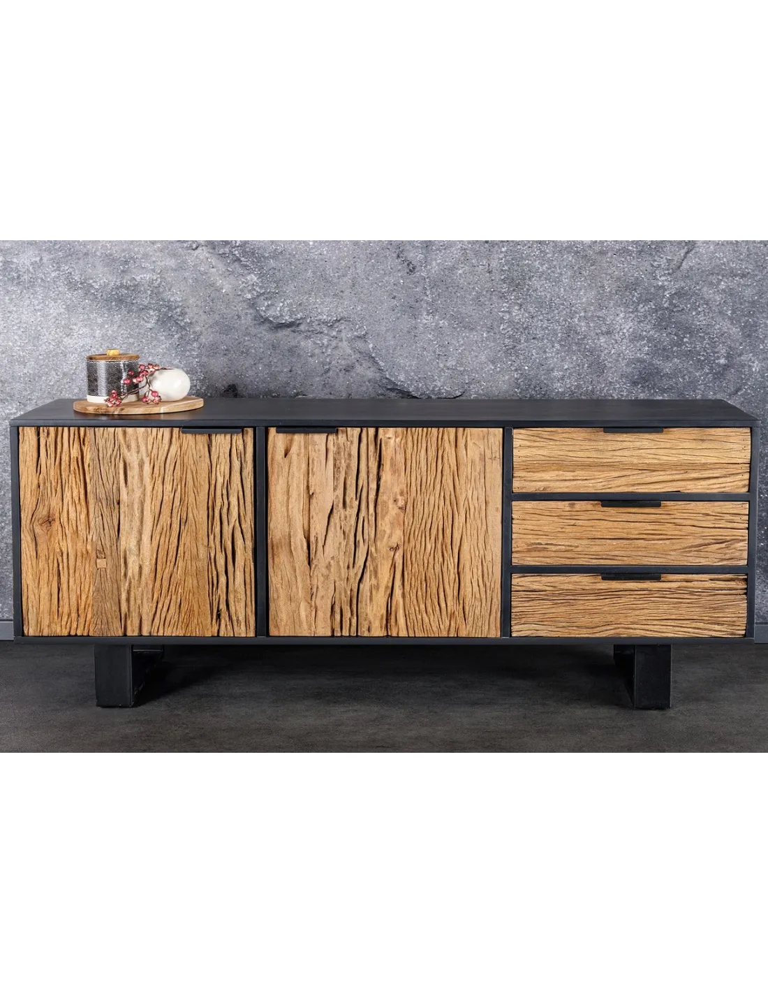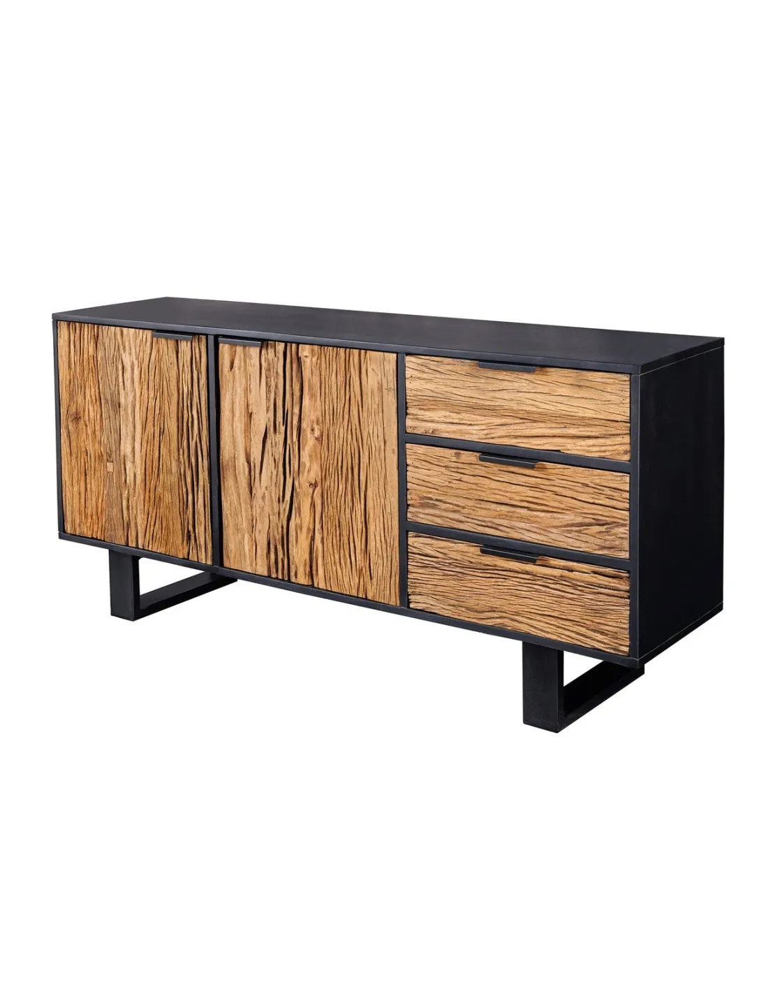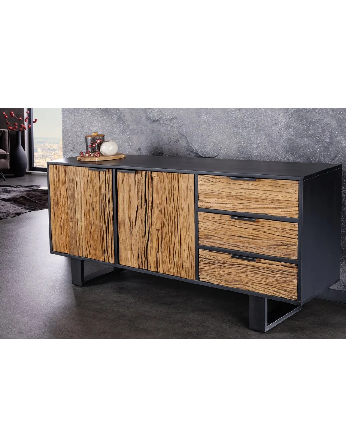 Le buffet BARRACUDA se distingue par ses façades en teck à la texture naturelle et son mélange harmonieux de bois chaleureux et de métal noir. Les poignées intégrées et les pieds géométriques renforcent son allure minimaliste tout en offrant une grande praticité.