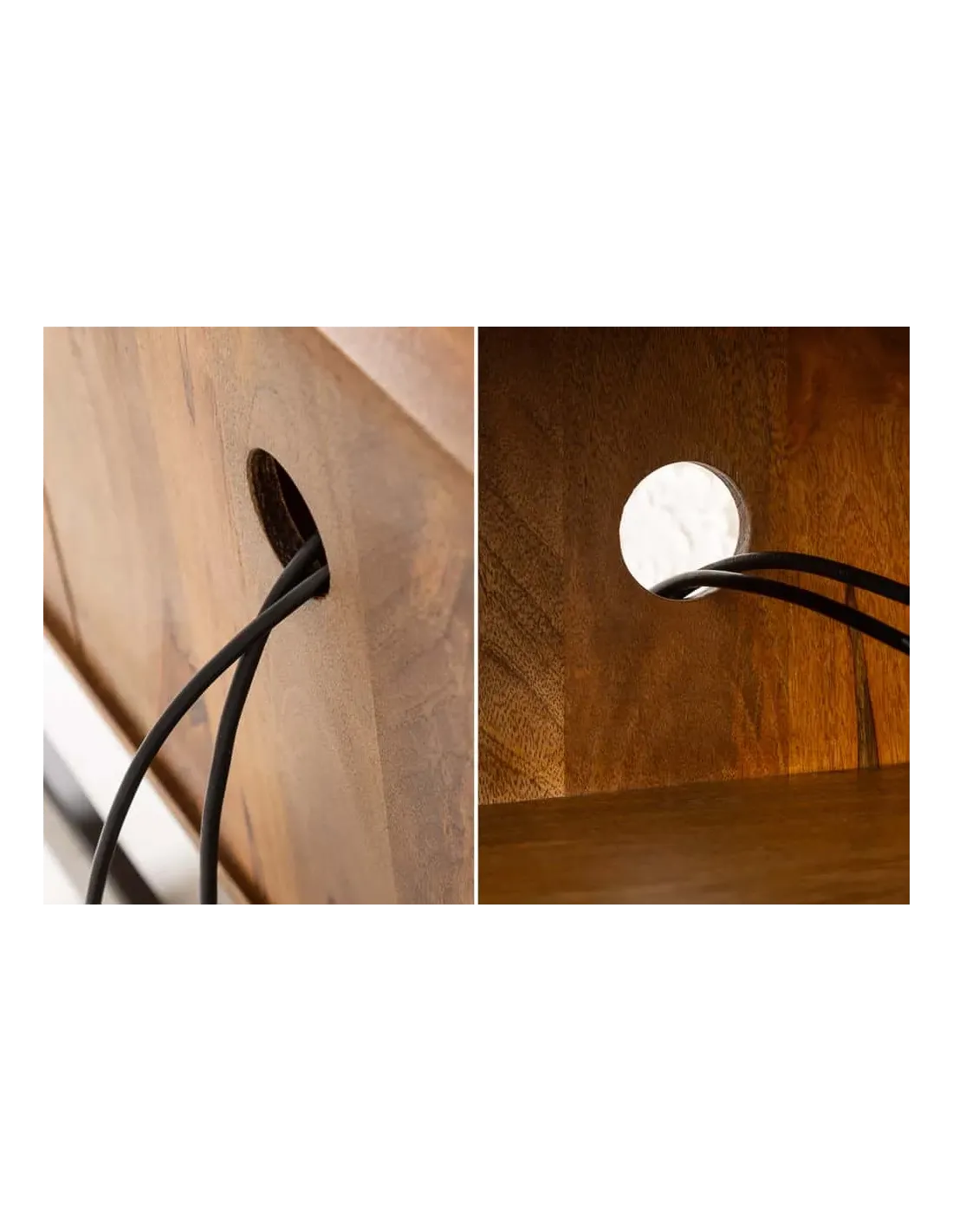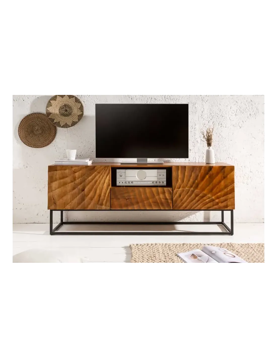 Derrière les portes décorées à la main se trouvent deux compartiments spacieux, parfaits pour ranger DVD, livres et autres objets. Au-dessus du tiroir central du meuble, vous trouverez également un compartiment ouvert pour vos objets, comme votre récepteur. Un passe-câbles pratique est situé à l'arrière du compartiment, permettant de ranger tous les câbles de manière ordonnée et discrète derrière le meuble.