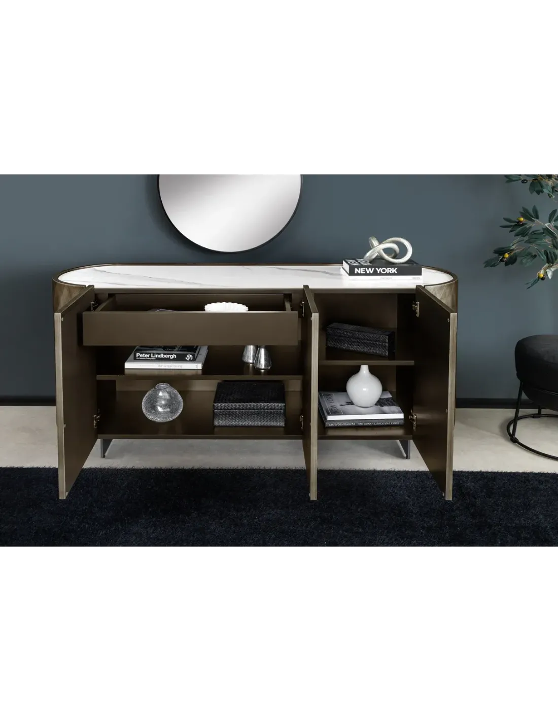 Alliant design contemporain, fonctionnalité et élégance, le buffet REFLECTION apporte une touche sophistiquée à votre salon ou salle à manger. Son effet 3D bronze combiné à un plateau en céramique effet marbre blanc crée un contraste raffiné qui illumine votre intérieur tout en offrant un grand espace de rangement pratique et organisé.