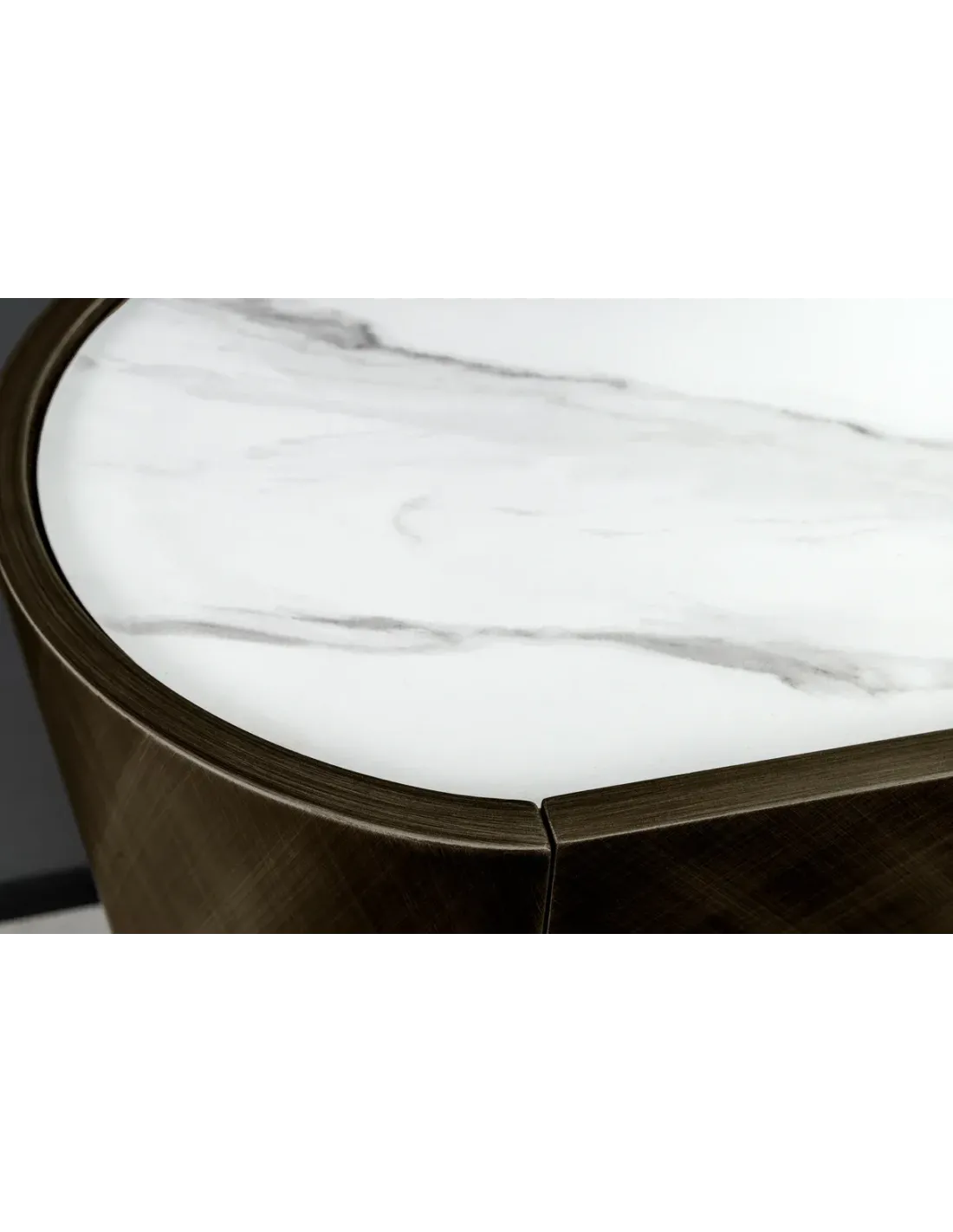Design moderne et raffiné : façade effet 3D brossée en bronze, plateau en céramique marbre blanc pour un style chic et contemporain.
