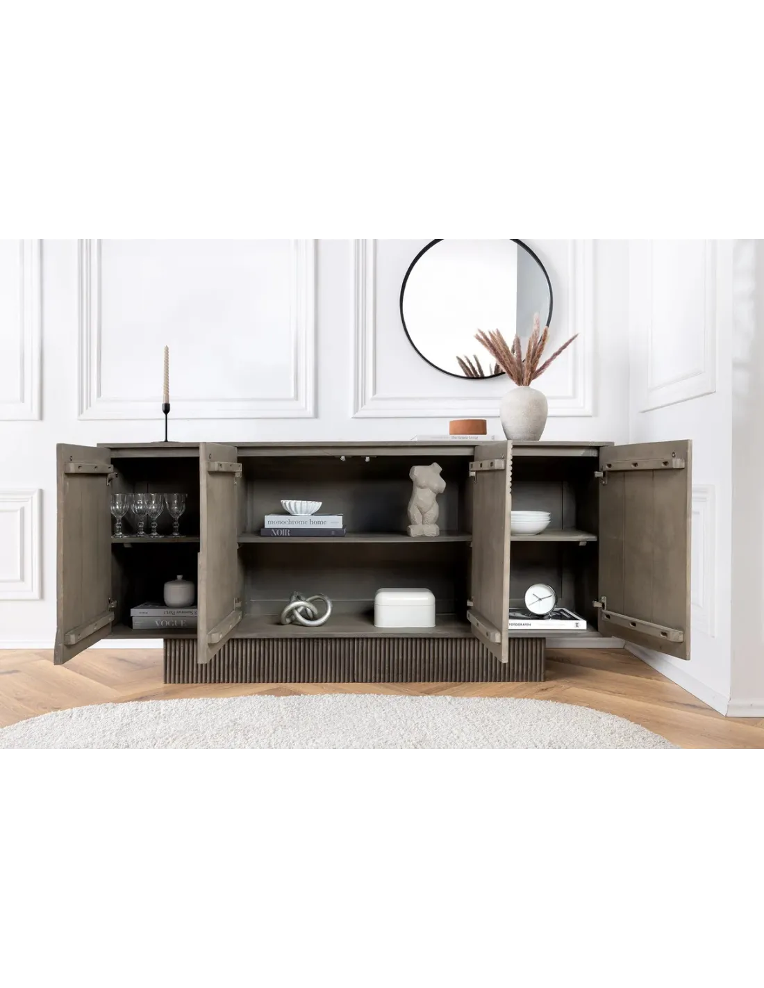 Derrière ses façades soignées, le buffet dissimule de larges compartiments fermés qui permettent de ranger vaisselle, linge de maison, verrerie ou objets du quotidien. Son format de 170 cm de largeur offre un bel équilibre : généreux en rangement, mais sans être encombrant.