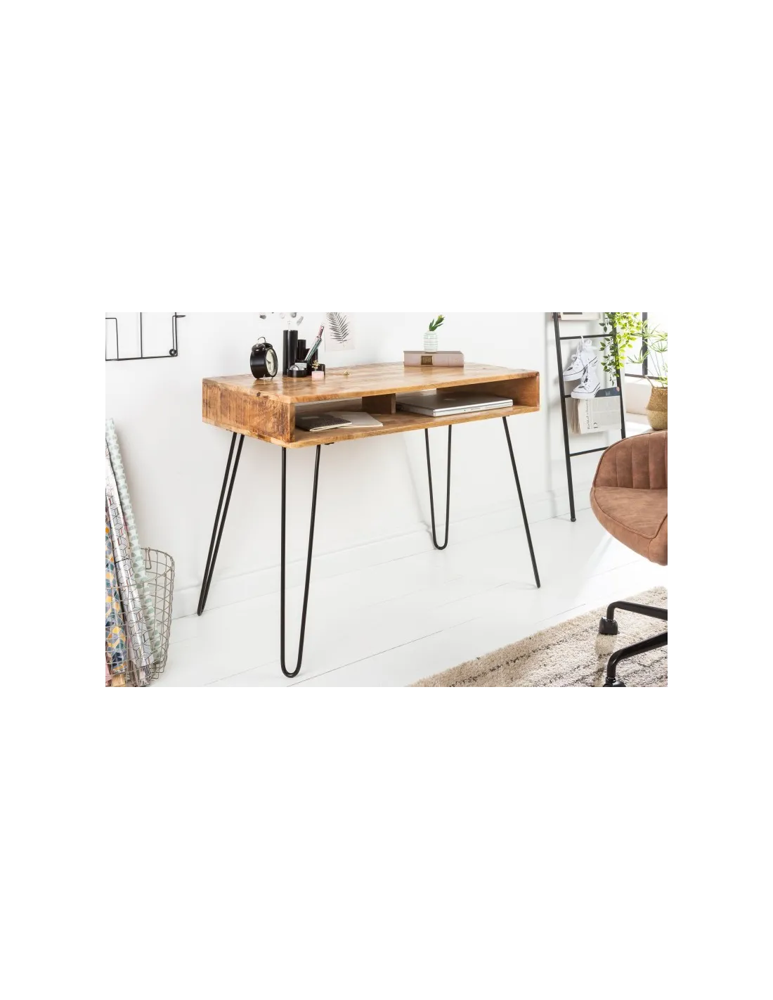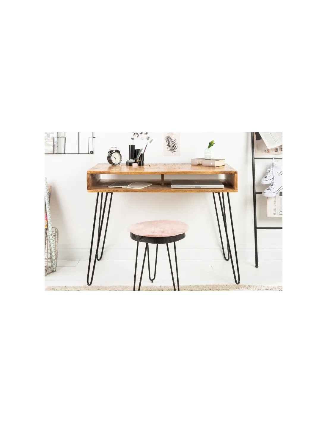 Optez pour le luxe et la modernité avec cette belle table de bureau coloris naturel et noir, très pratique et solide ! Sa fabrication à la main de haute qualité est faite en bois massif coloris naturel avec des pieds solide en métal noir ! De plus elle vous permettra de ranger vos livres et objets personnels à la faveur de sa niche extraordinaire ! Donc n'hésitez pas à profiter cet élégant meuble avec un rapport qualité/prix excellent !