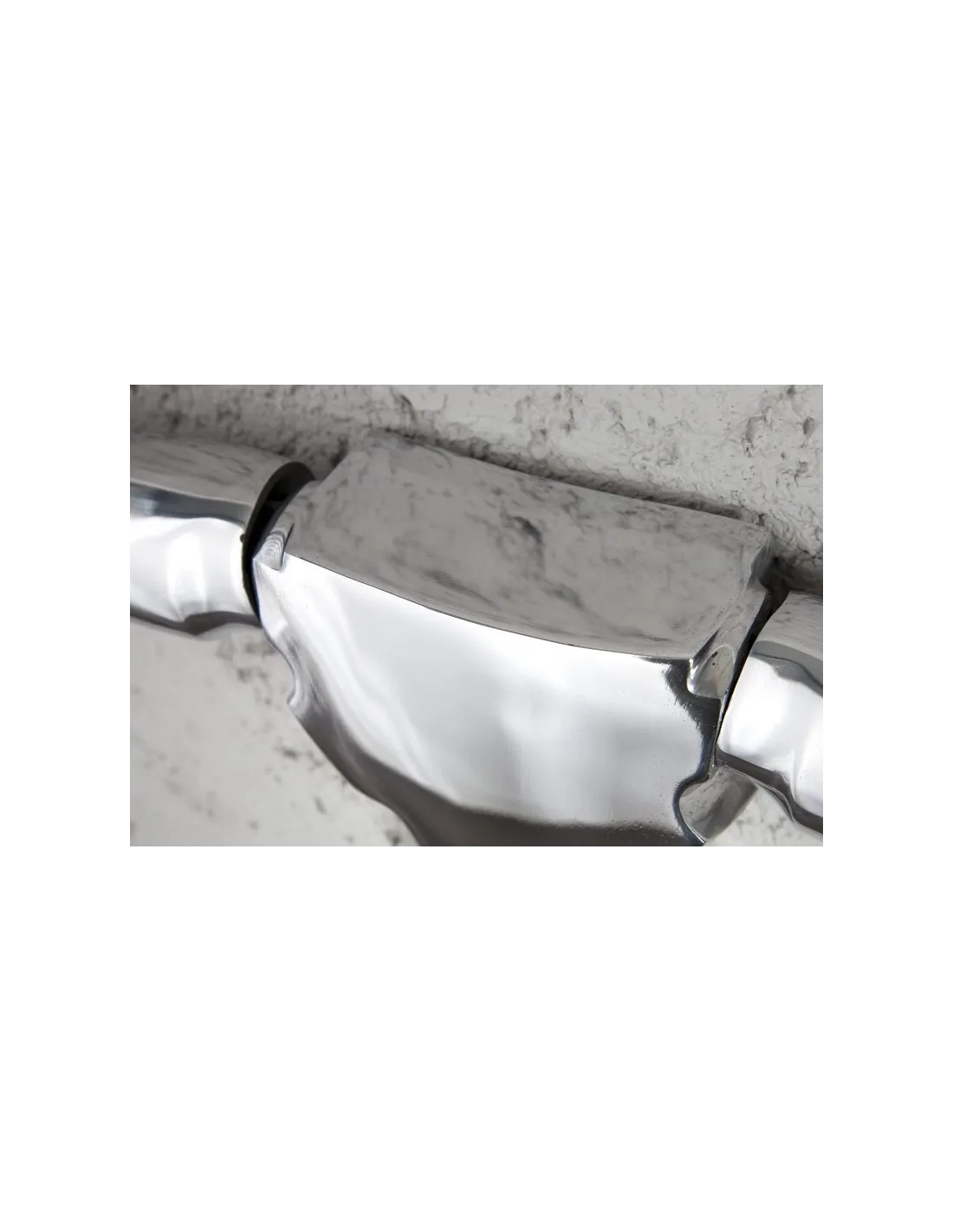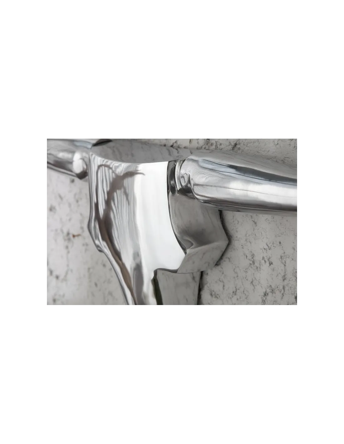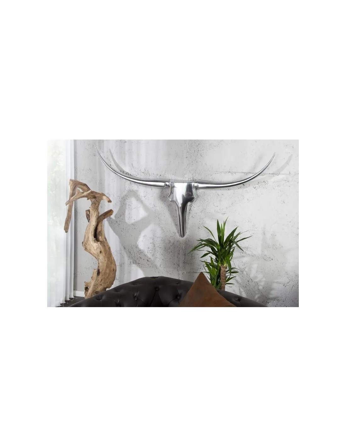 Super objet décoration de 125 cm en aluminium coloris argent, ce formidable trophée présentera un air merveille et sa forme en tête de taureau aux cornes apportera un style original à votre salon ou votre chambre.