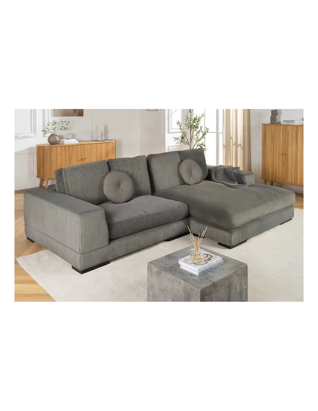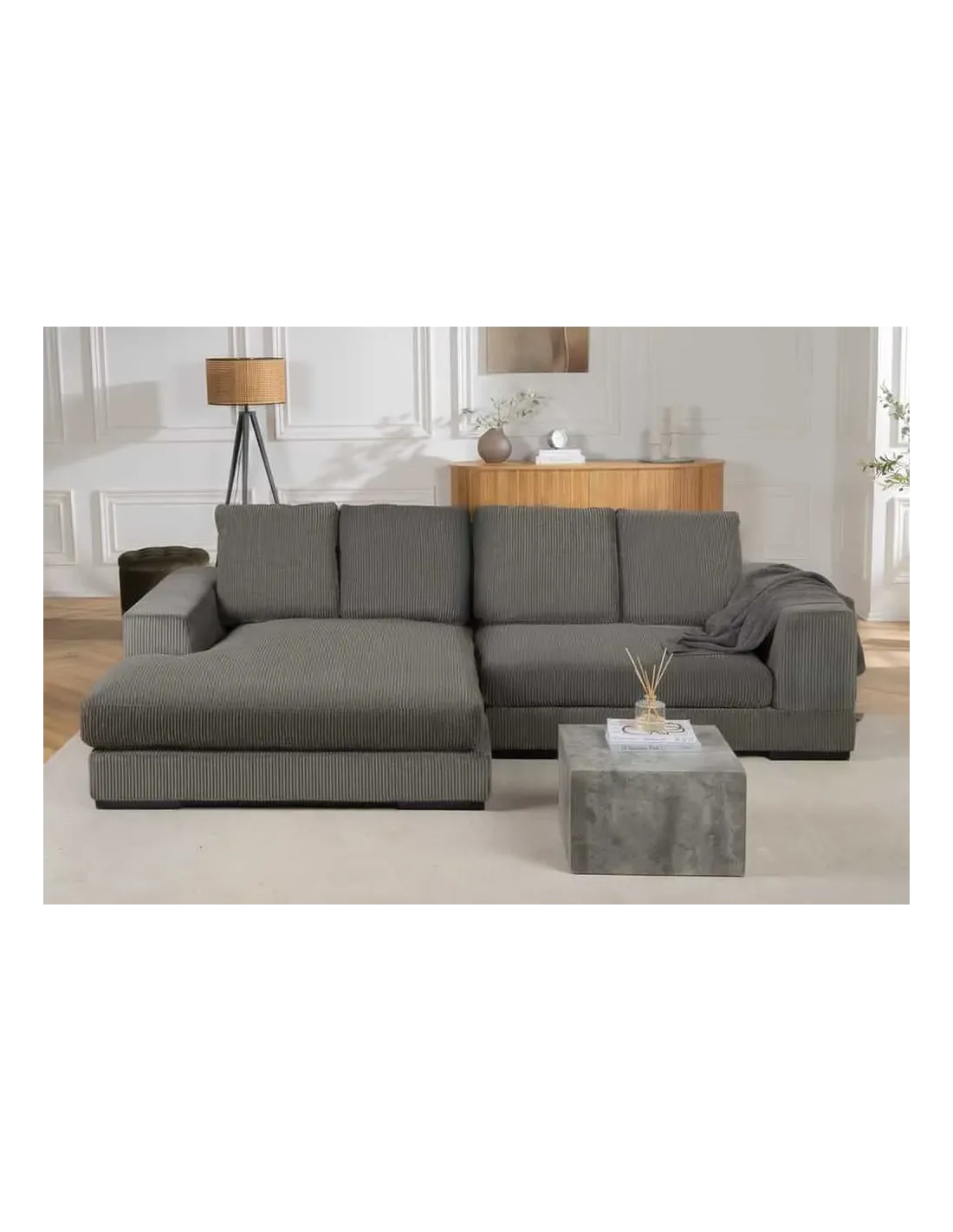 Alliant design moderne, confort XXL et modularité, le canapé d’angle BABYLON 270 cm est parfait pour créer un coin salon spacieux et accueillant. Son revêtement en cordon gris apporte un style contemporain et élégant, idéal pour tout intérieur.