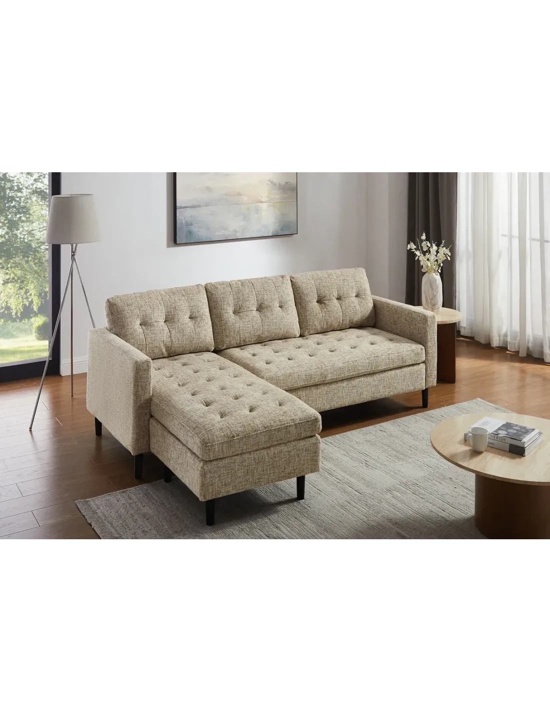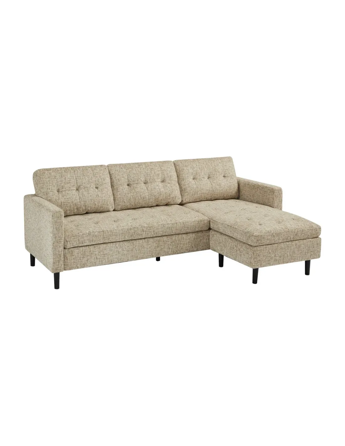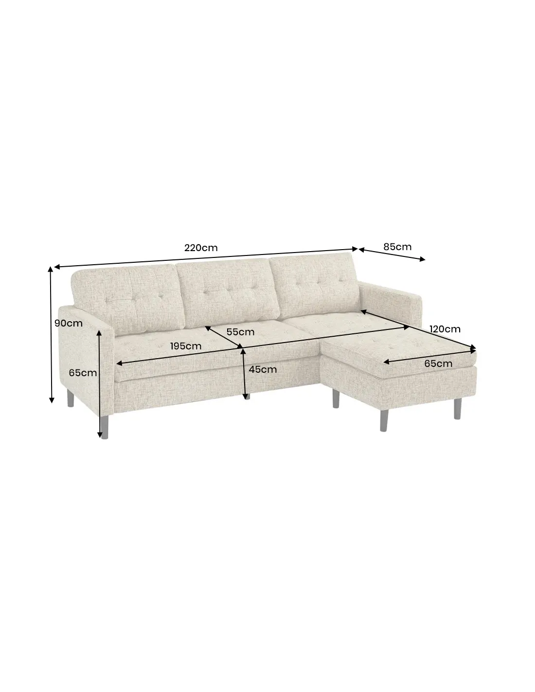 Le canapé d’angle STOCKHOLM 220 cm en tissu texturé beige combine style, confort et modularité, transformant votre salon en un espace chic, convivial et pratique.