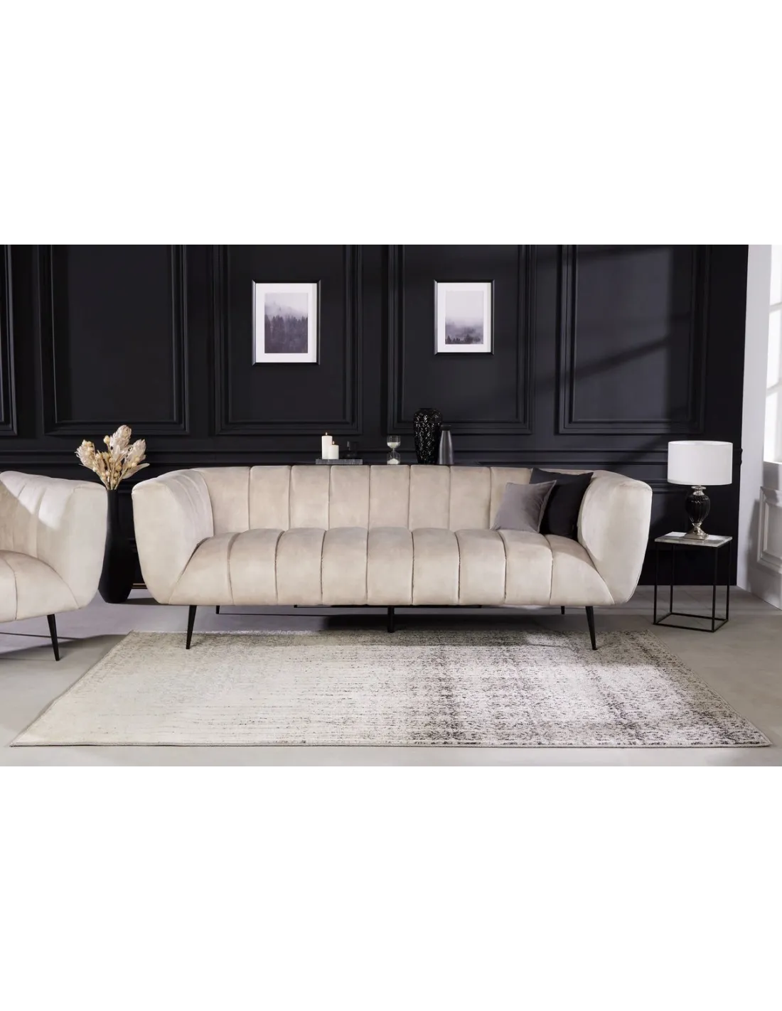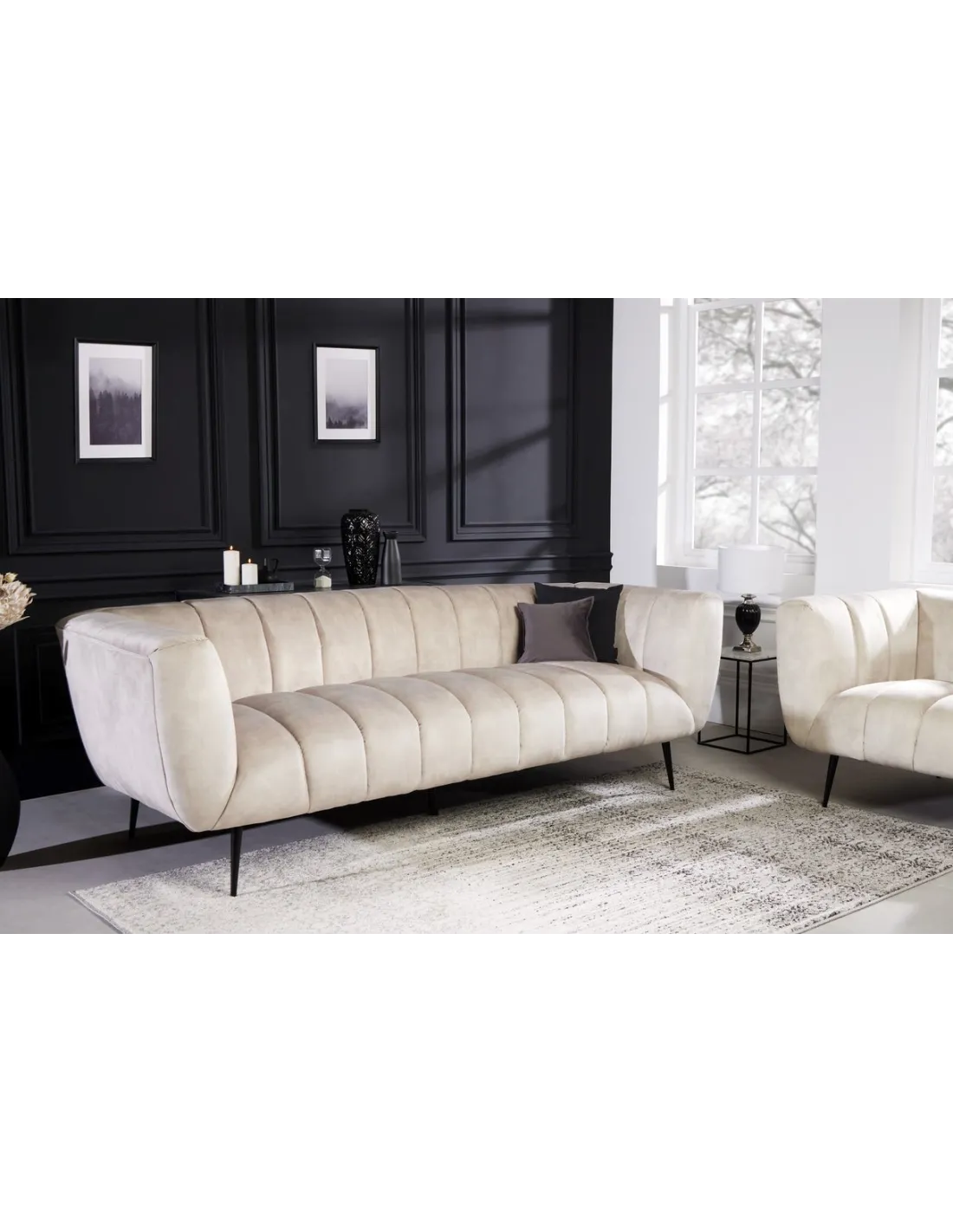 Ajoutez une touche d'élégance rétro à votre intérieur avec ce somptueux canapé Noblesse en velours champagne. Le matelassage décoratif sur le dossier et l'assise ainsi que les pieds noir créent un look distinctif et raffiné, idéal pour compléter votre décoration.