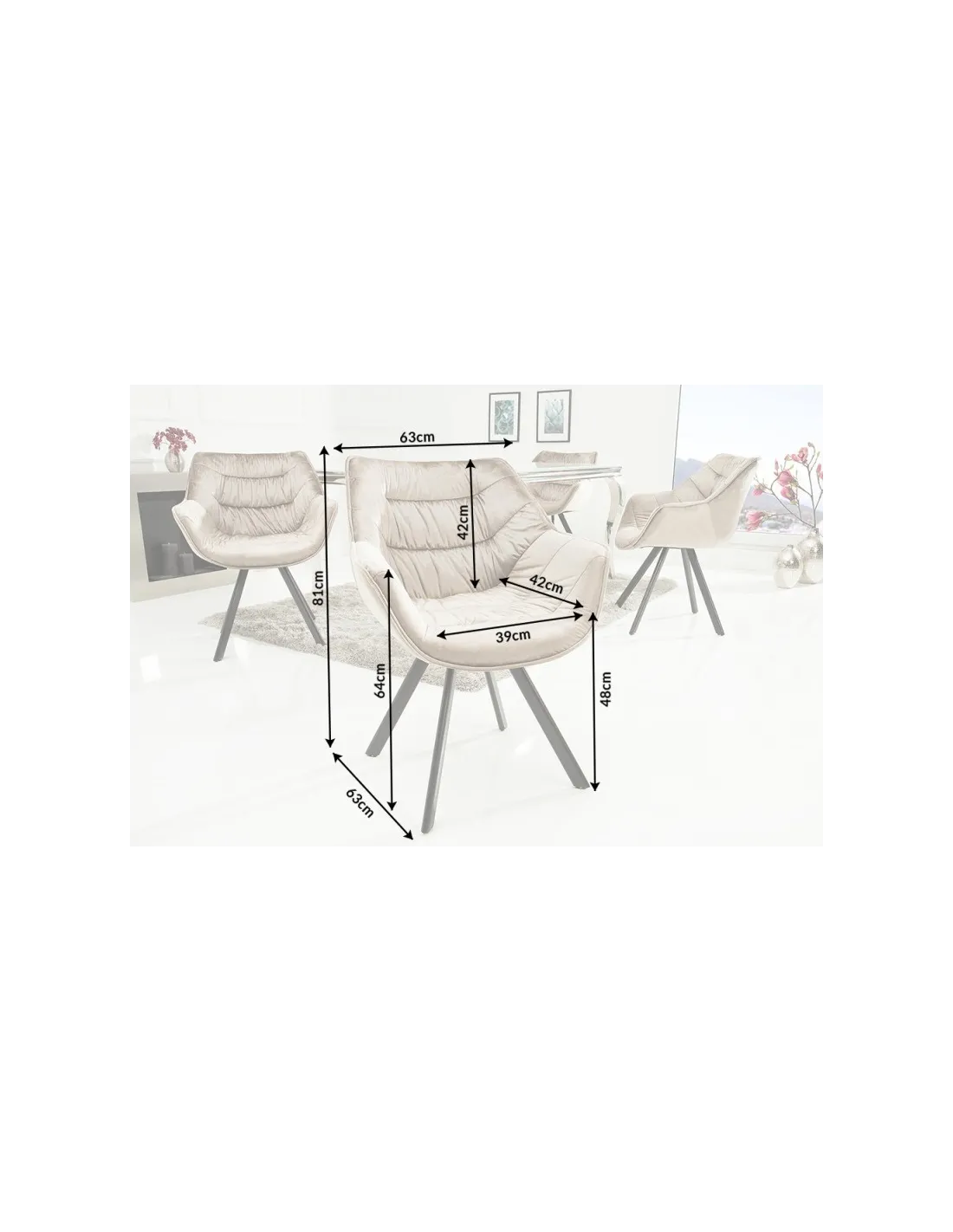 - 67cm x 82cm x 63cm (LxHxP) Assise: 34cm x 47cm x 45cm (LxHxP) Hauteur du dossier: 39cm Hauteur accoudoir: 19cm