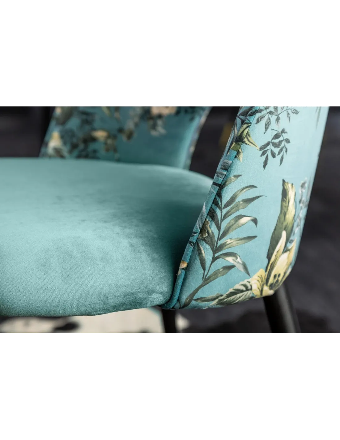 Apportez une touche de raffinement et de style à votre espace avec cette magnifique chaise en velours turquoise ornée d'un motif floral élégant.