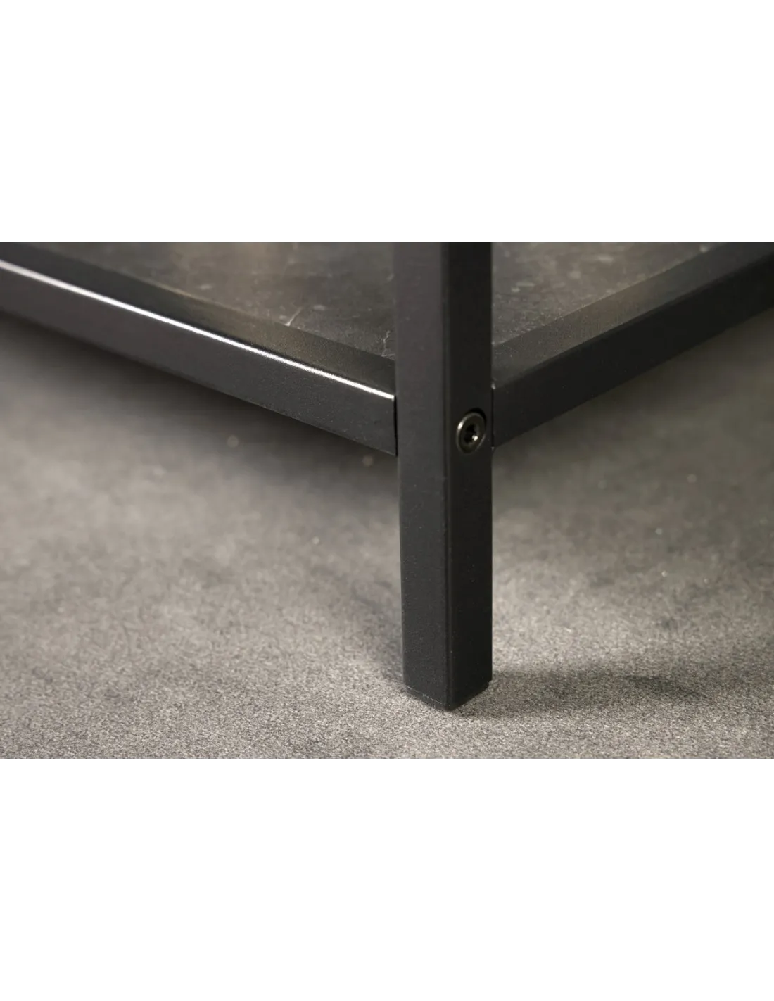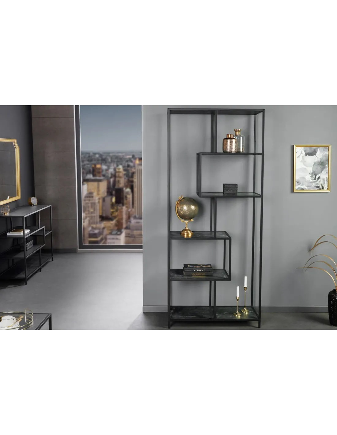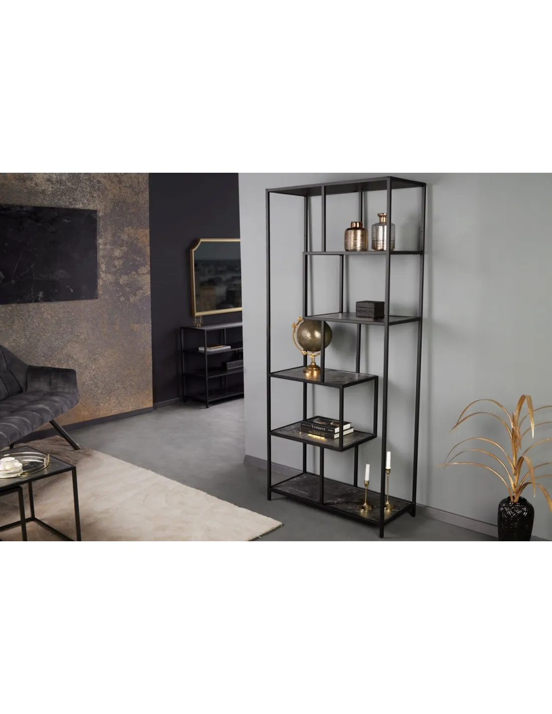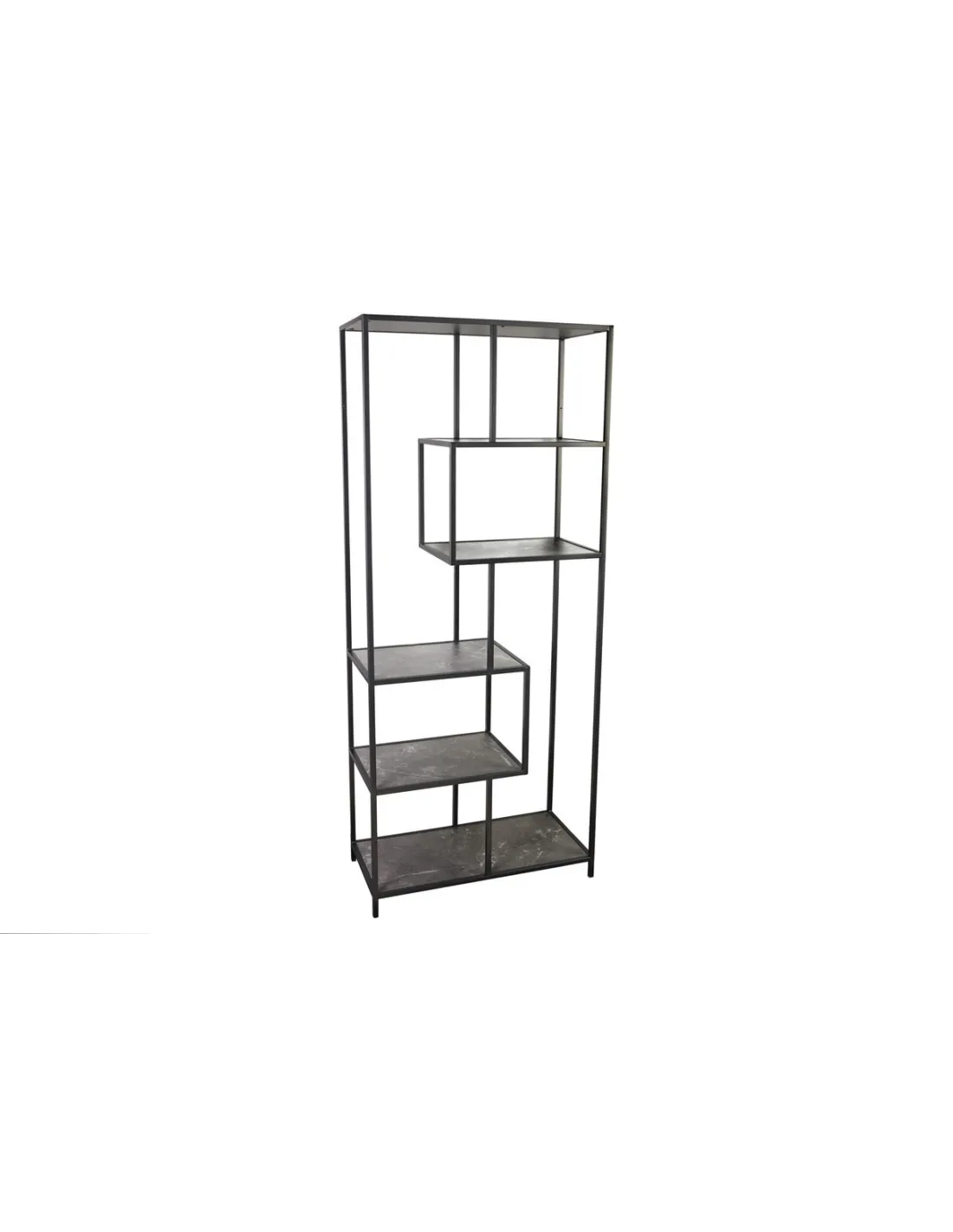 Ce meuble allie élégance et fonctionnalité avec ses étagères au fini marbre anthracite et son cadre noir en métal enduit de poudre, parfait pour un style moderne et sophistiqué. Chaque étagère peut supporter jusqu'à 10 kg, offrant un espace de rangement solide et design pour vos livres, décorations ou autres objets.