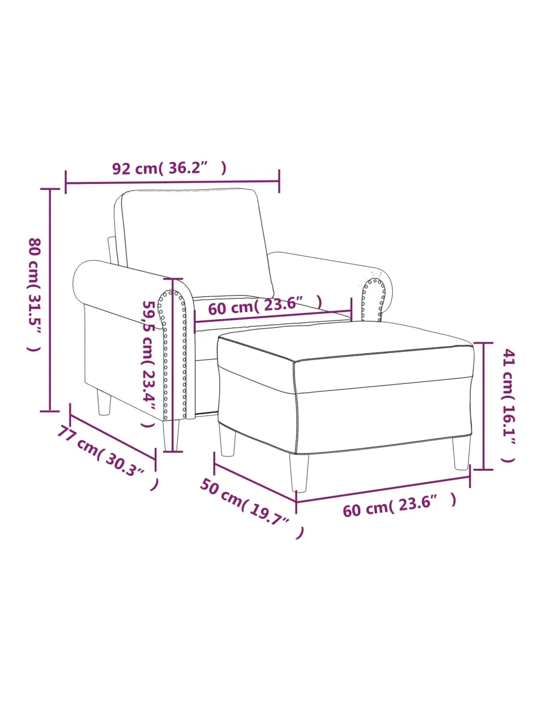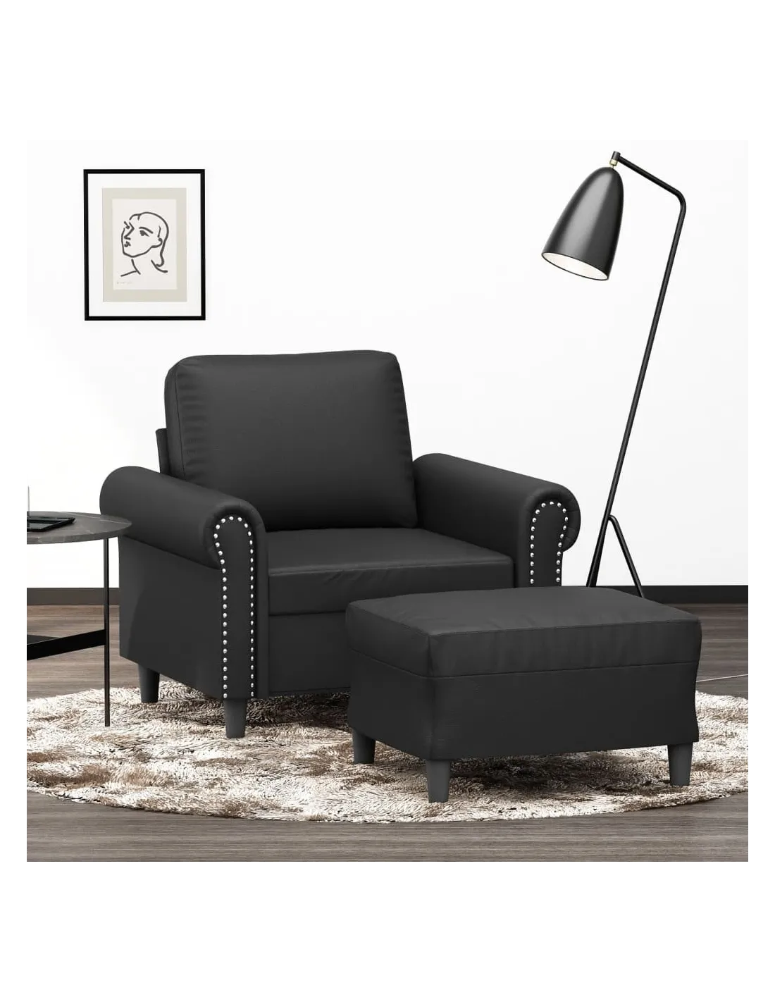 Ce fauteuil avec repose-pied est un excellent endroit pour discuter, lire, regarder la télévision ou simplement vous détendre. Il est destiné à être un point central de votre maison. Similicuir durable : le similicuir de qualité supérieure est un matériau très durable. Il est résistant aux taches, ce qui le rend facile à nettoyer avec un chiffon humide. La surface lisse donne également un aspect luxueux et la beauté du cuir véritable.Structure robuste et stable : la structure en contreplaqué et en métal du canapé avec repose-pieds assure robustesse et stabilité.Expérience d'assise confortable : le fauteuil est très confortable avec le siège, les accoudoirs et le coussin de dossier bien rembourrés.Repose-pied polyvalent : ce repose-pied convient pour reposer vos pieds lorsque vous êtes allongé dans un canapé ou un fauteuil inclinable, ou pour vous offrir un siège supplémentaire dans votre pièce. De plus, le design simple et la taille compacte le rendent idéal pour presque tous vos espaces de vie.Design accrocheur : doté d'un design simple mais moderne, ce canapé avec repose-pied est destiné à attirer l'attention dans votre pièce.