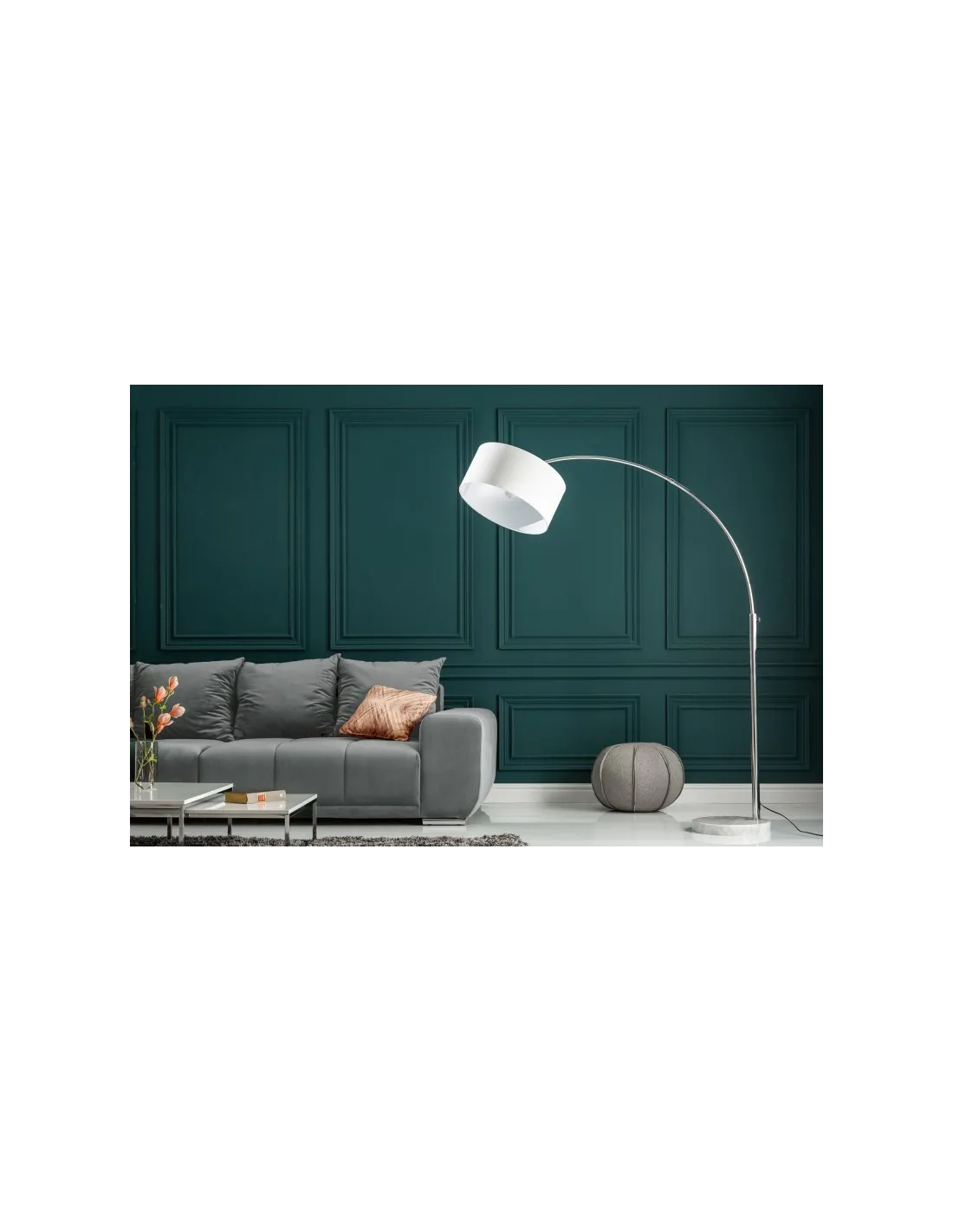 Splendide lampadaire blanc de design arqué avec un abat-jour de tissu toile de lin blanc, placé sur une base en marbre blanc ajoutera une touche distingué à votre intérieur.