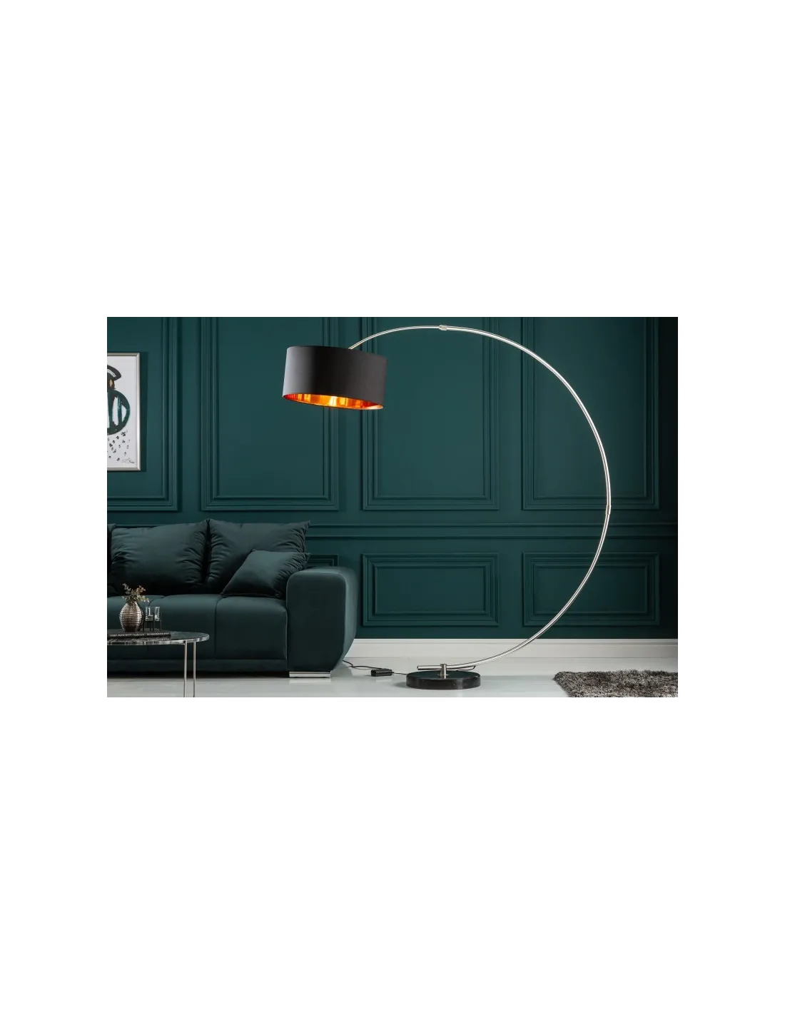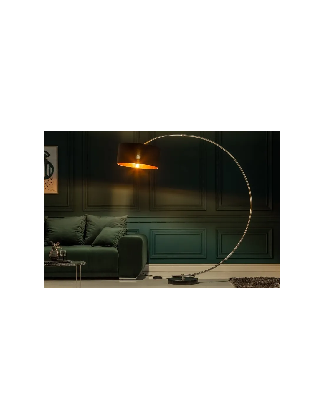 Lampadaire original apporte une touche glamour à votre intérieur, avec un support métallique sous forme d’arc, un socle rond solide en pierre de marbre noir, et un abat-jour en tissu noir à l'extérieur et doré à l'intérieur.
