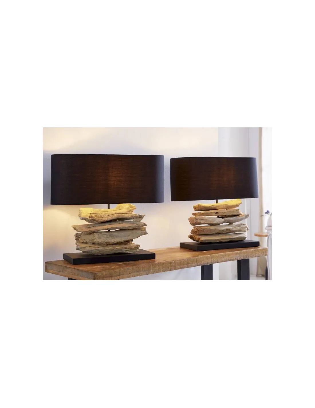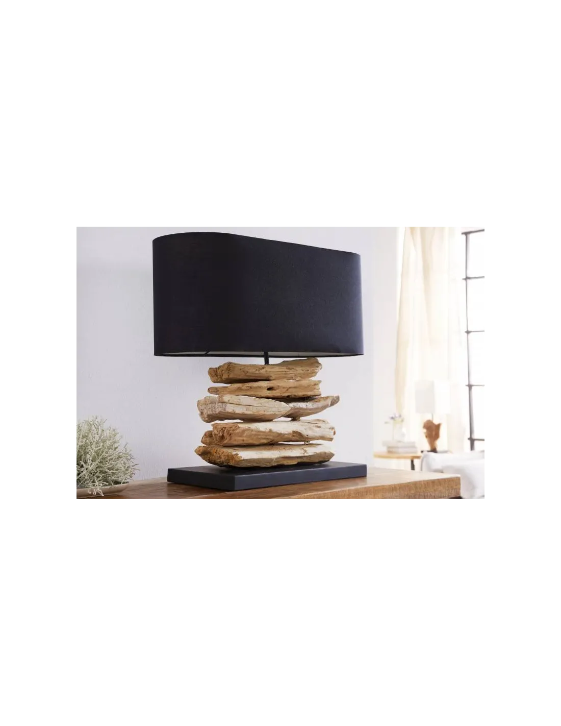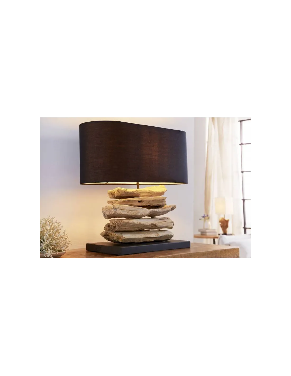 Pour ajouter une touche naturelle très charmante à votre intérieur, nous vous présentons cette magnifique lampe à poser conçue en bois massif flotté avec un abat jour de couleur noire en toile ! Elle apportera à votre intérieur un aspect élégant et une lumière luxueuse ! Pratique, décorative et de haute qualité à un prix parfait !