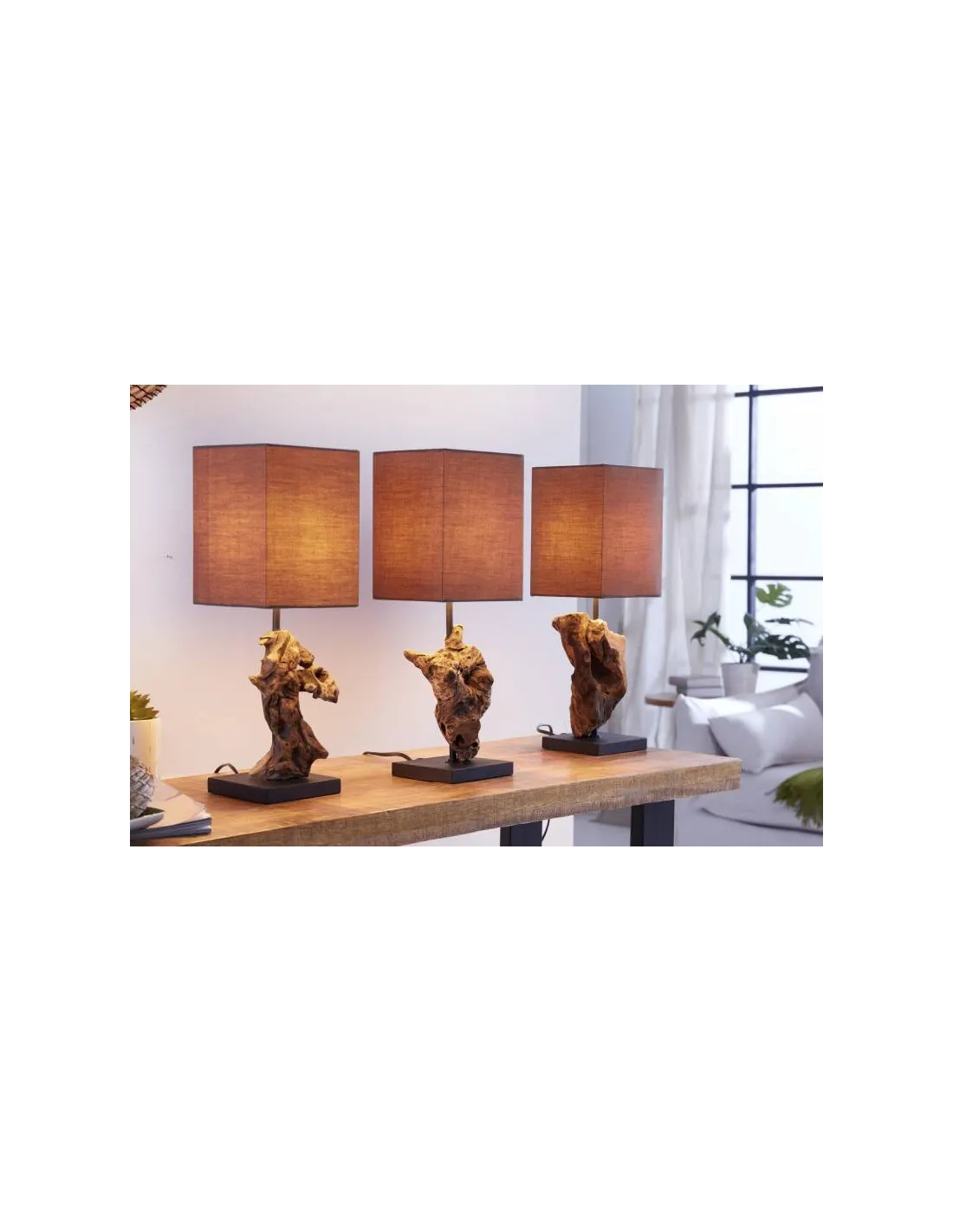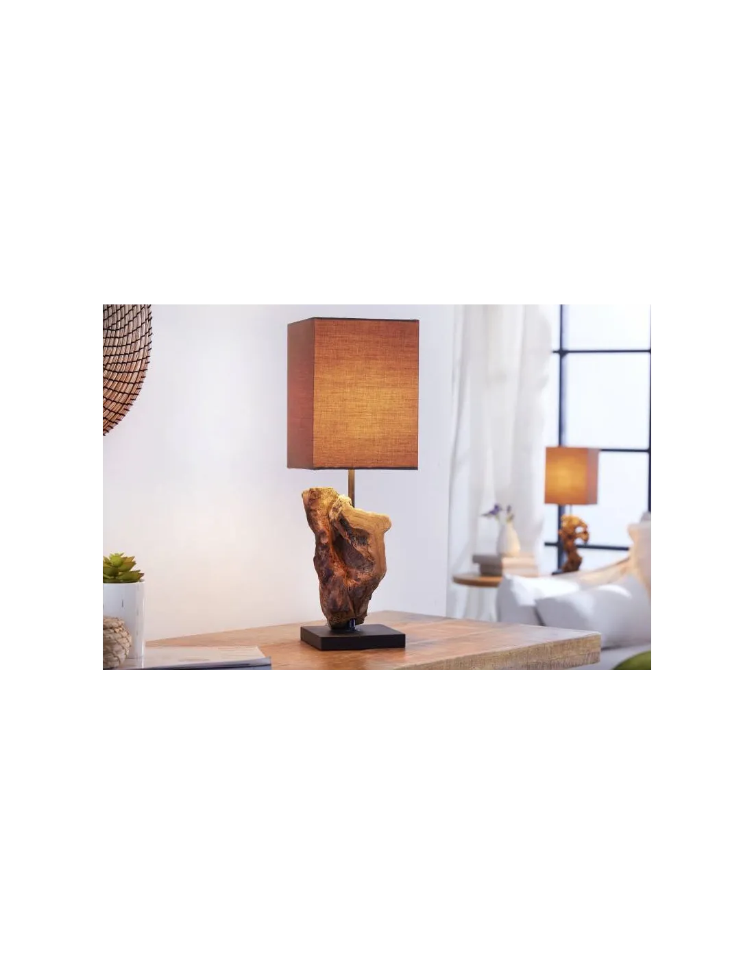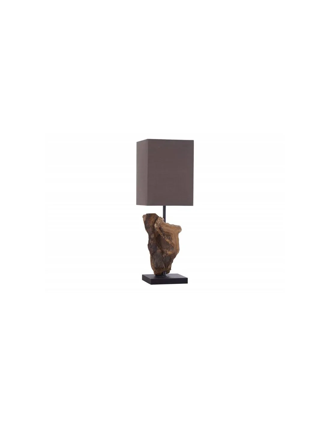 Magnifique lampe avec un abat-jour en tissu de lin marron et un socle carré en bois flotté artisanal, ajoutera une atmosphère naturelle et chic à votre intérieur.