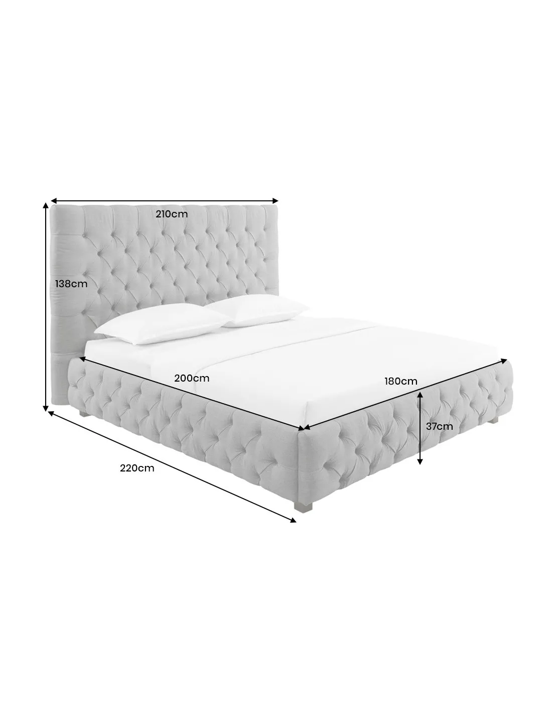 Pensé pour accueillir un couchage 180x200 cm, ce lit allie robustesse grâce à sa structure en bois massif, et raffinement, grâce à ses finitions soignées et son style Chesterfield indémodable.