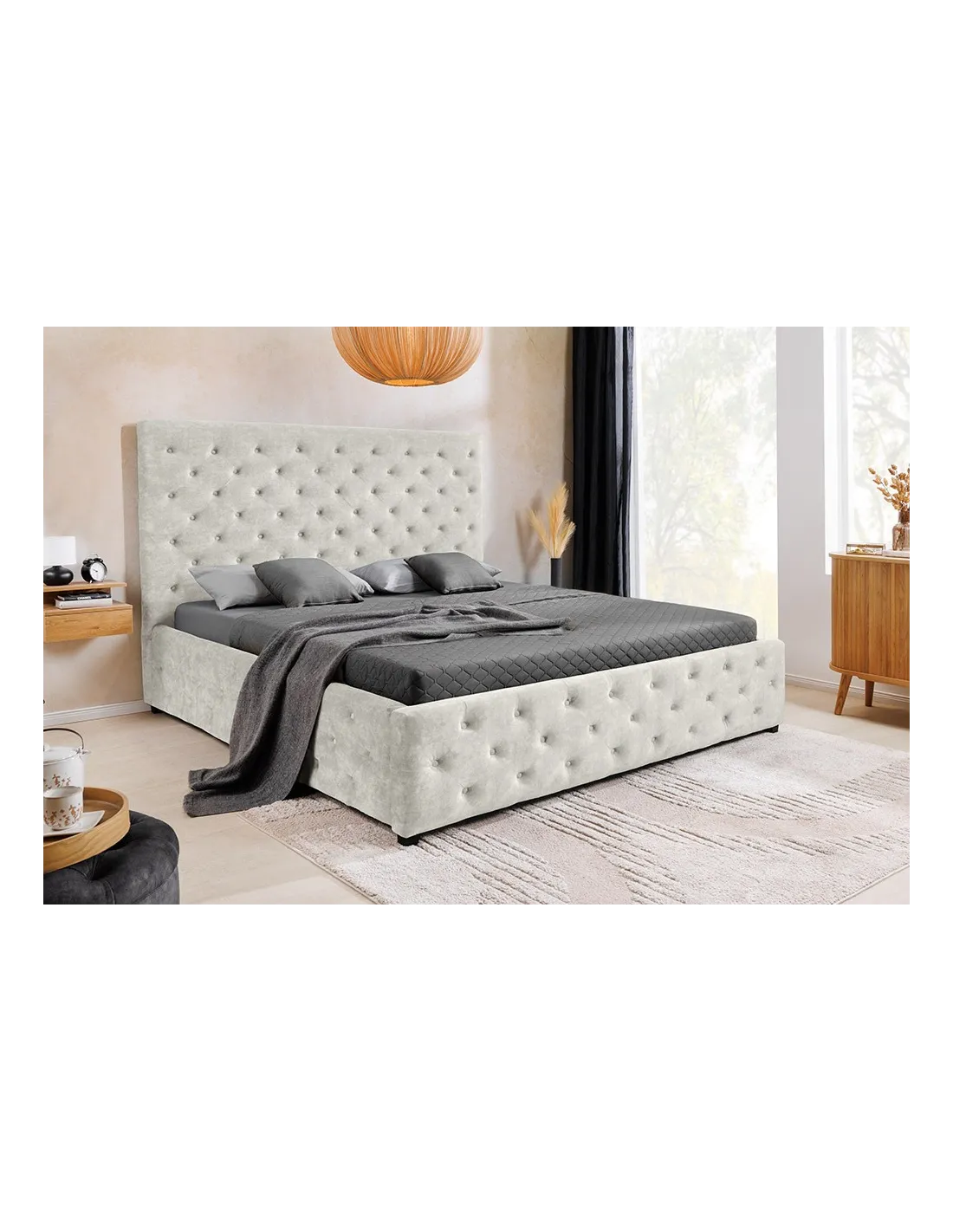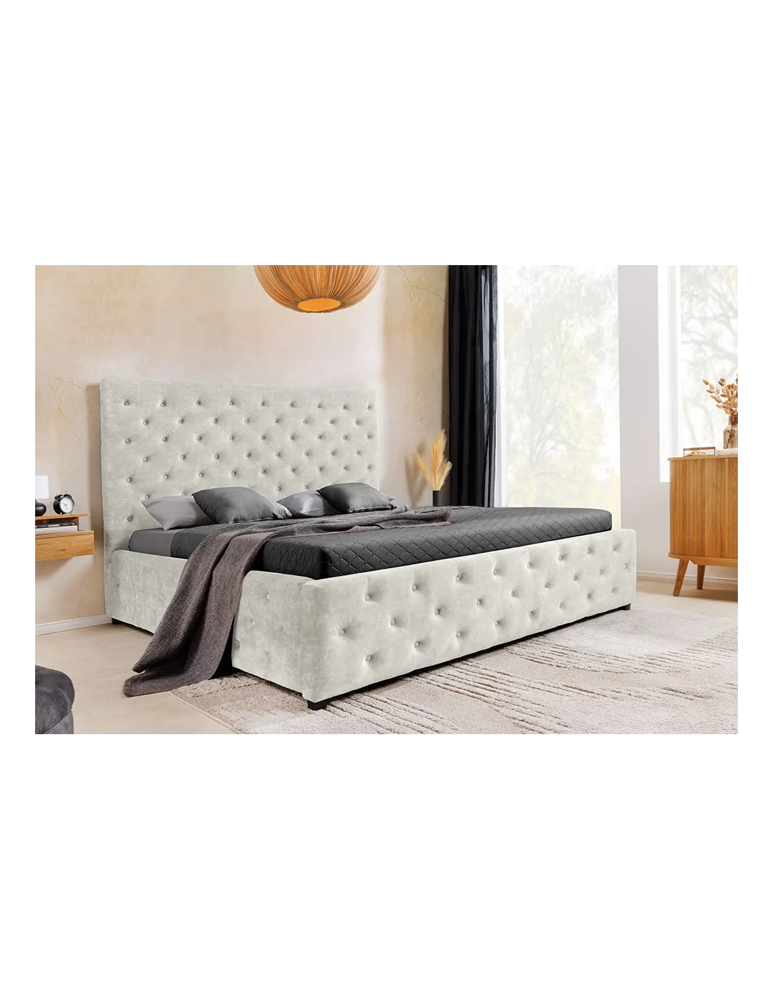 Le lit PARIS combine l’élégance classique du style Chesterfield avec un revêtement en velours beige champagne doux et lumineux. Avec son design moelleux et ses rangements astucieux, il transforme votre chambre en un véritable refuge chic et confortable, parfait pour se détendre avec style.