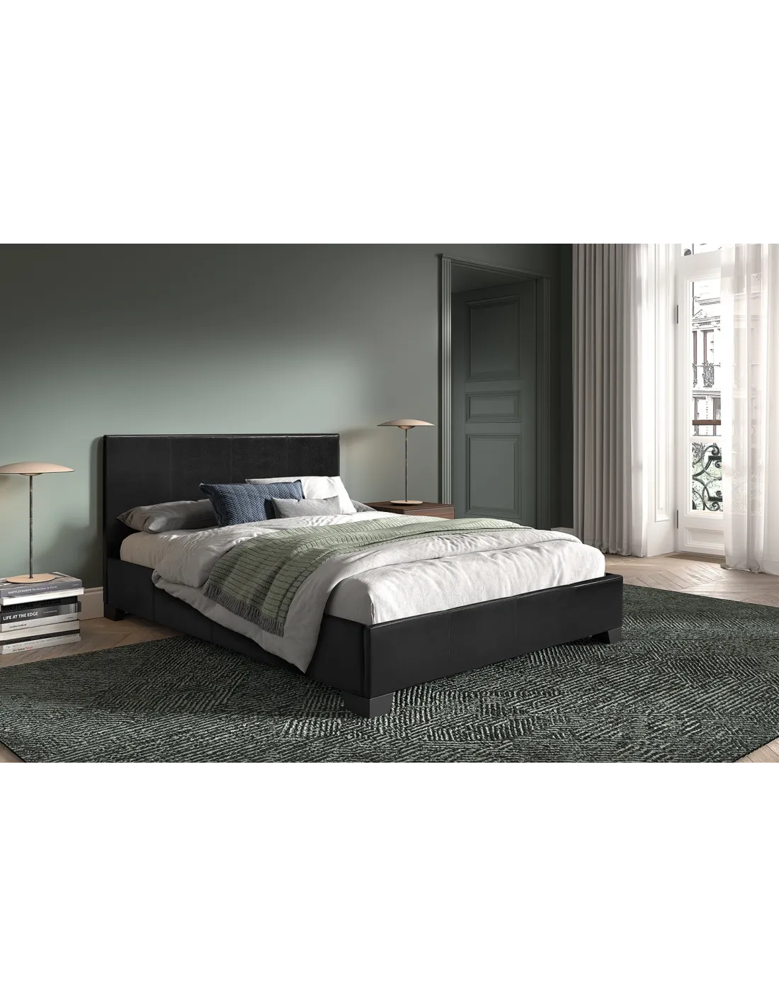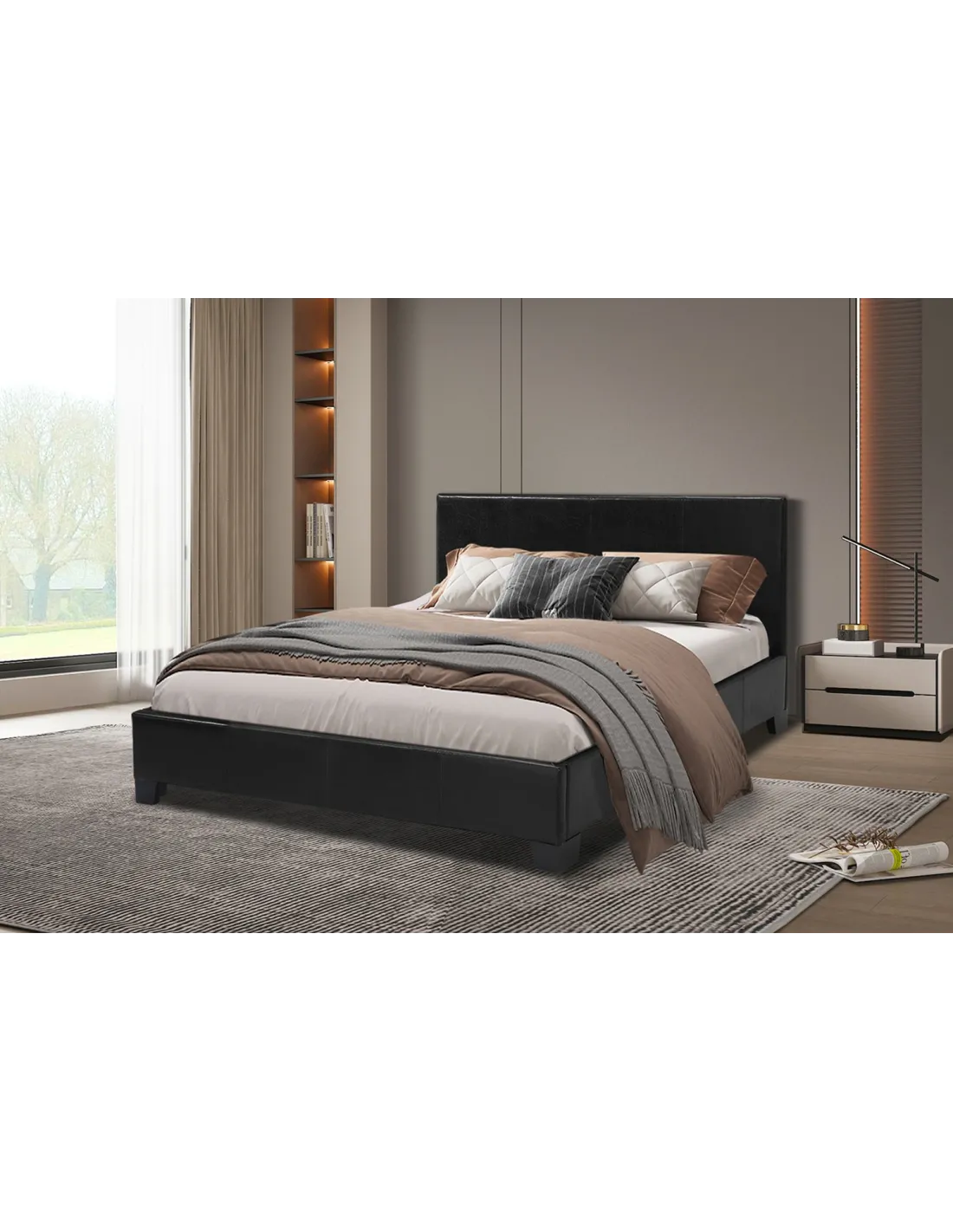 Chic et élégant le lit adulte entièrement revêtu de simili cuir de coloris noir.