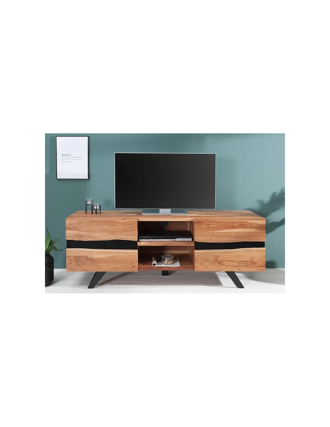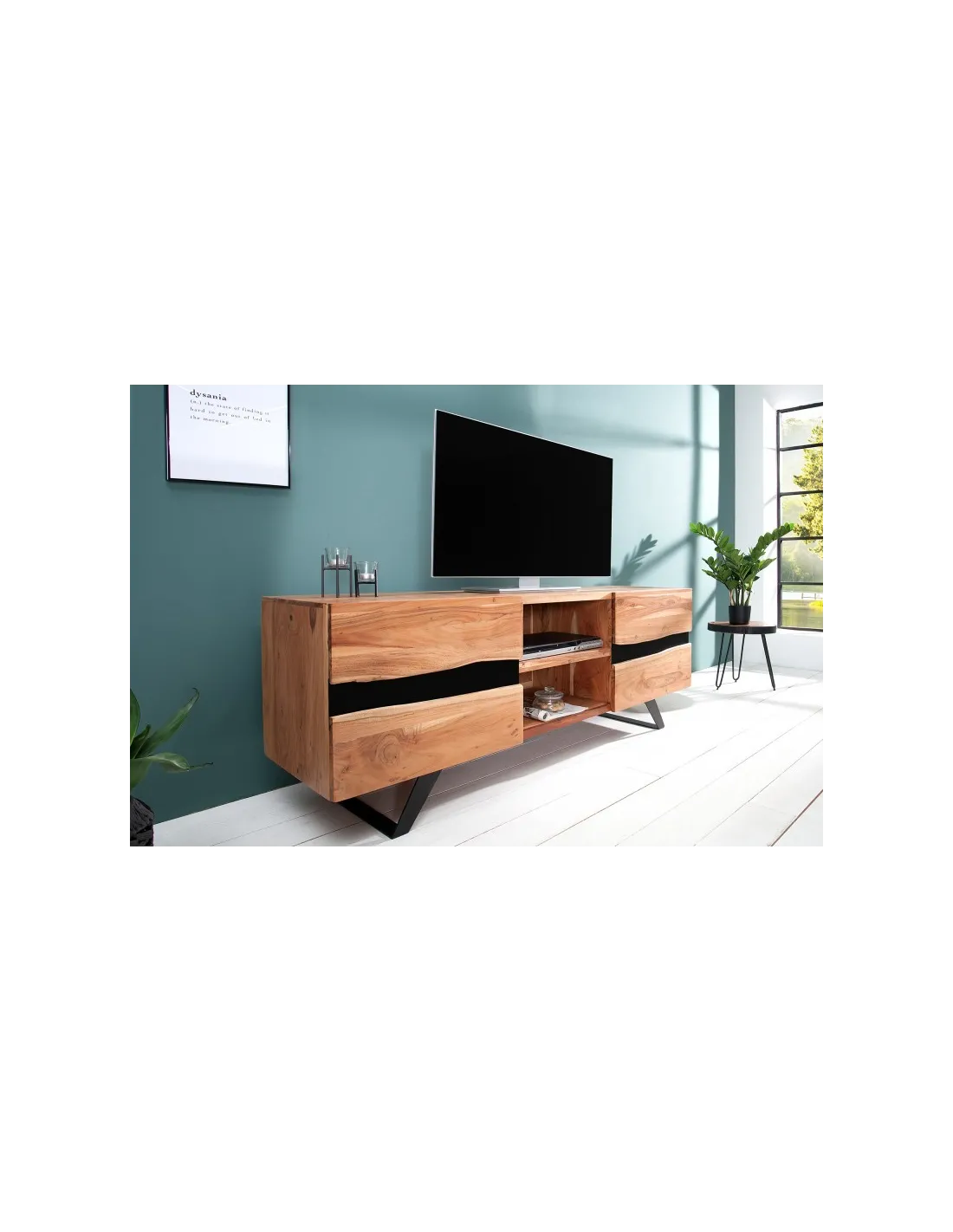 Sa structure équilibrée et ses lignes épurées s’intègrent parfaitement dans tous les styles d’intérieur – du contemporain au rustique chic. Grâce à ses espaces de rangement ouverts et fermés, il offre une solution pratique pour organiser vos appareils multimédias, vos accessoires ou vos objets décoratifs.