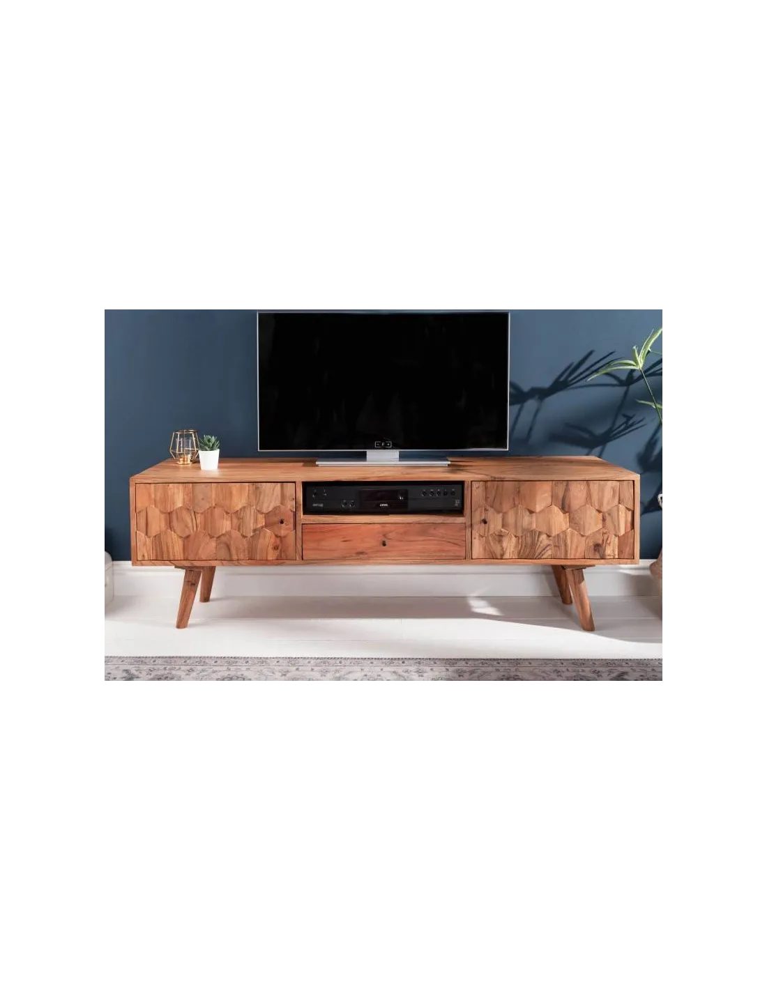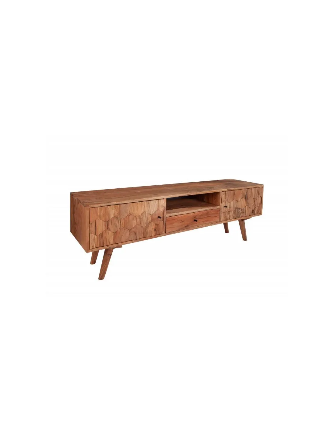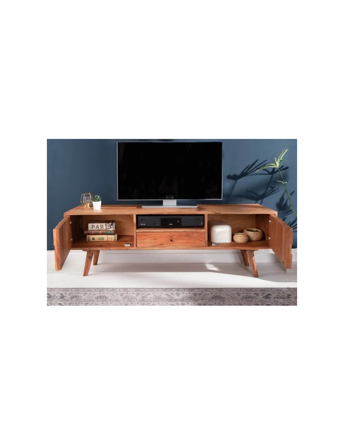 Meuble tv design scandinave coloris naturel en bois massif à 2 portes, une niche et un tiroir