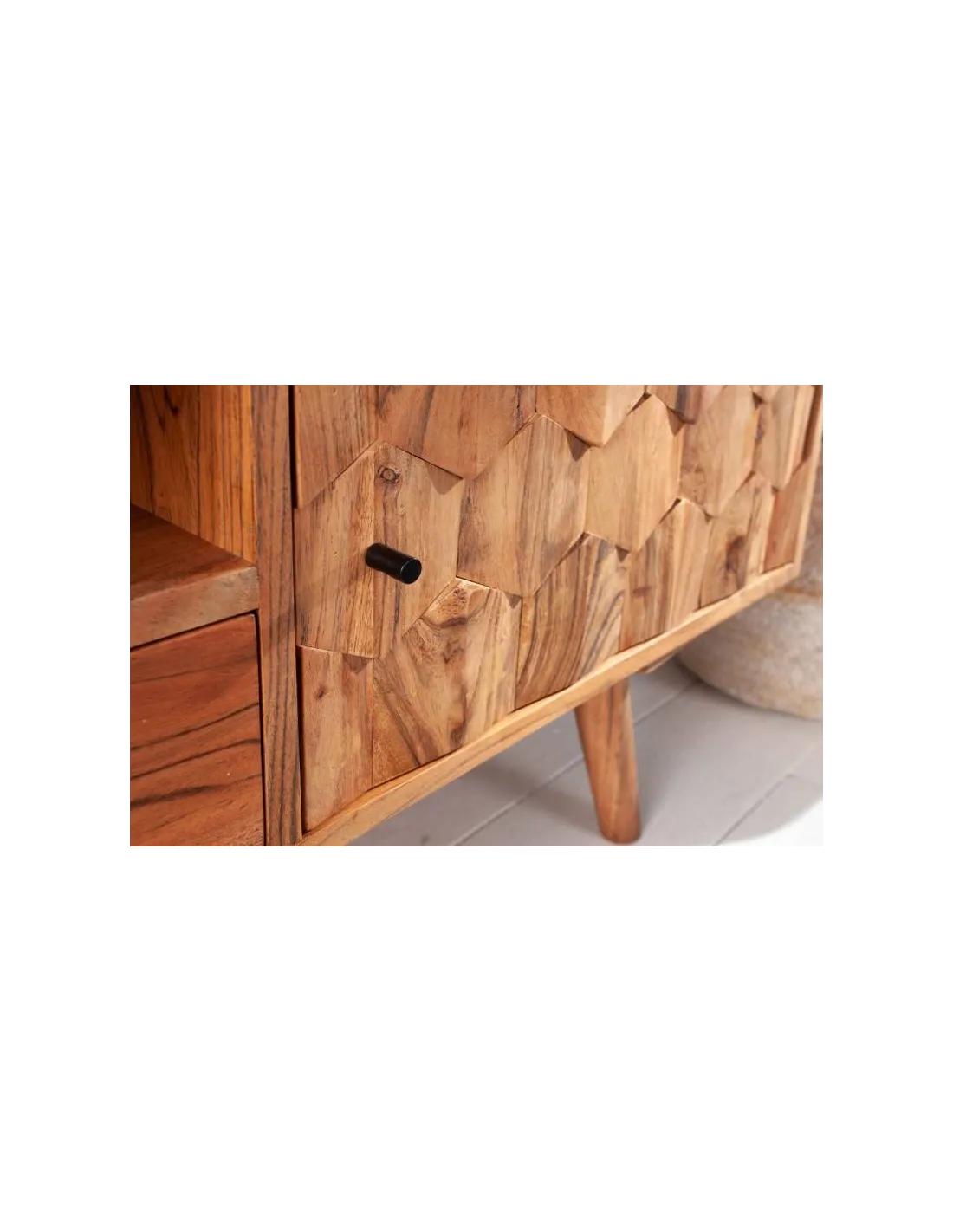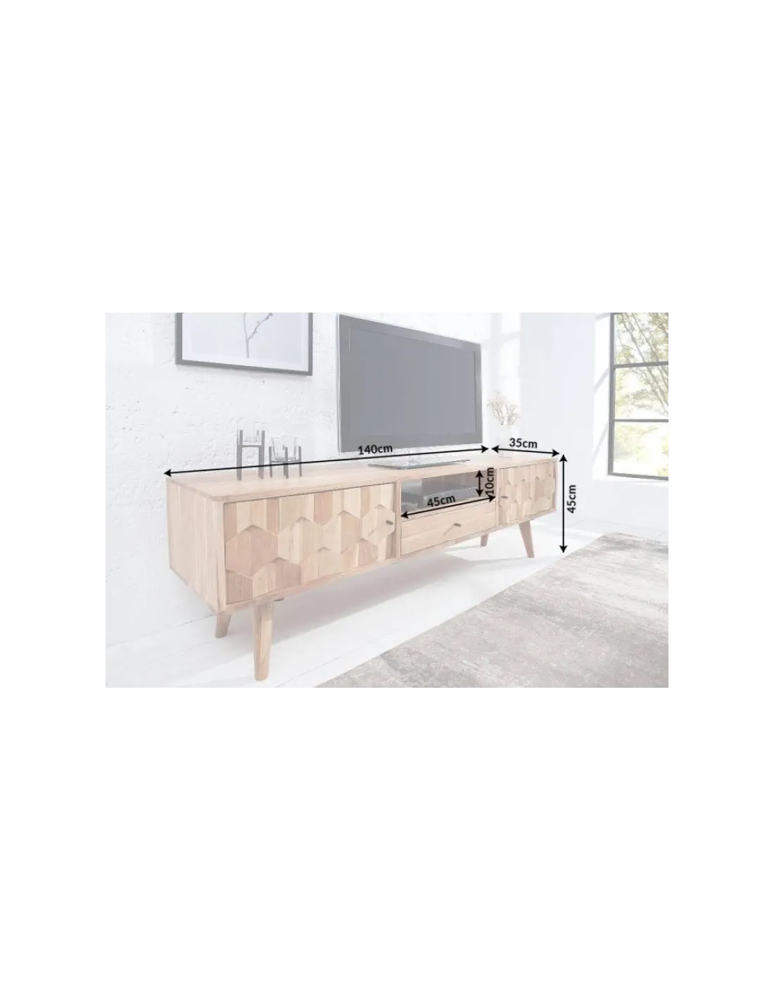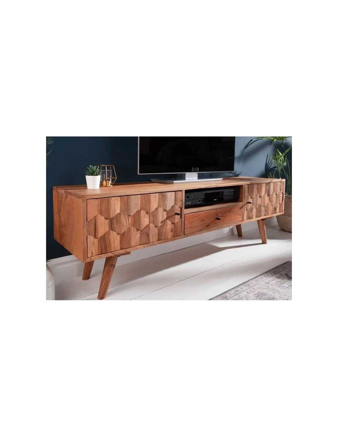 Meuble tv design scandinave coloris naturel en bois massif à 2 portes, une niche et un tiroir