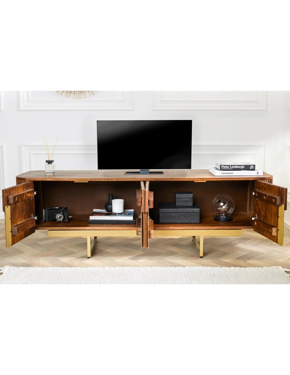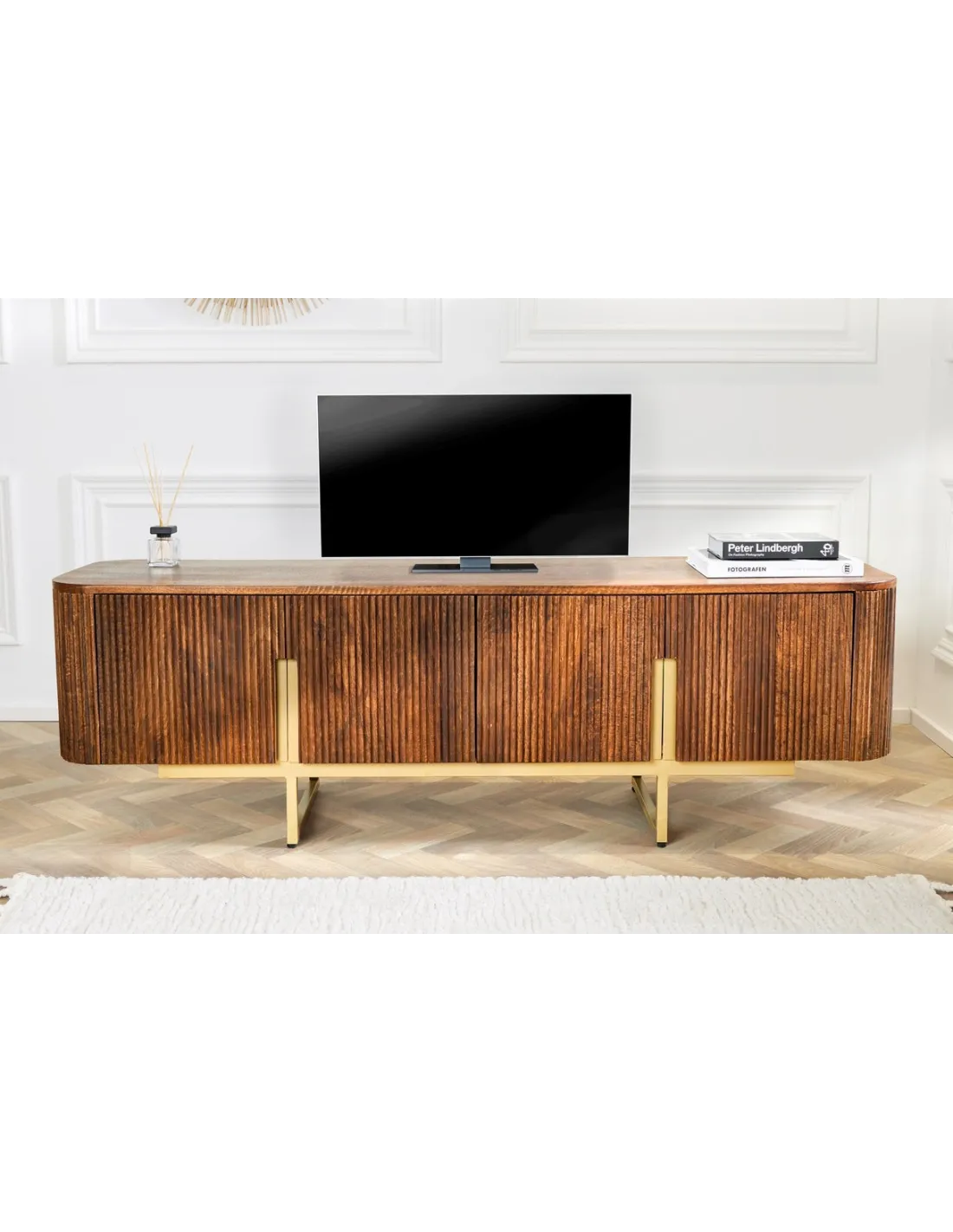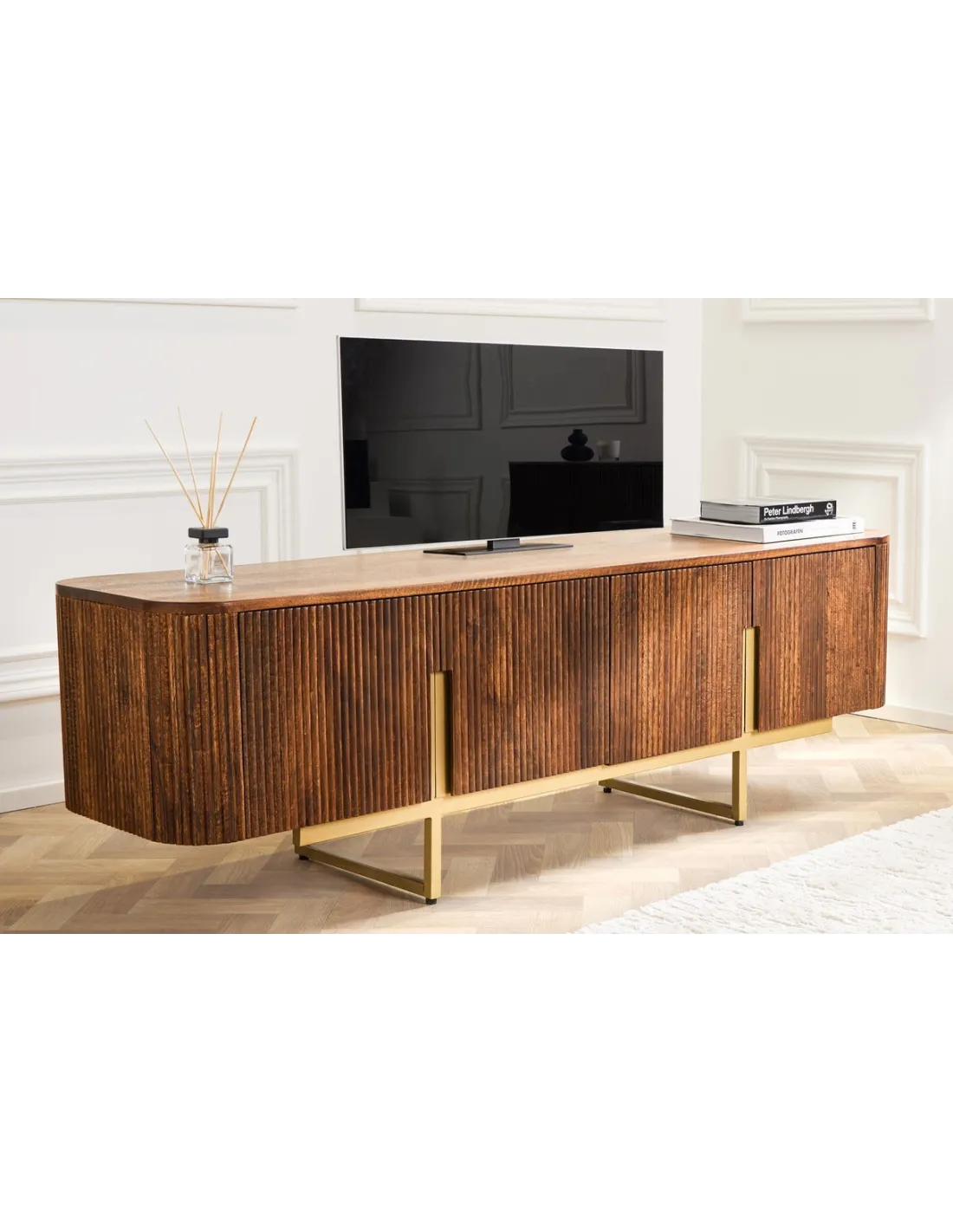 Le meuble TV en bois massif rainuré est une pièce maîtresse du design rétro qui ajoutera du charme à votre espace de divertissement. Fabriqué avec soin à partir de bois de manguier laqué et doté d'un cadre en métal doré, ce meuble TV combine élégance et fonctionnalité avec une finition naturelle.