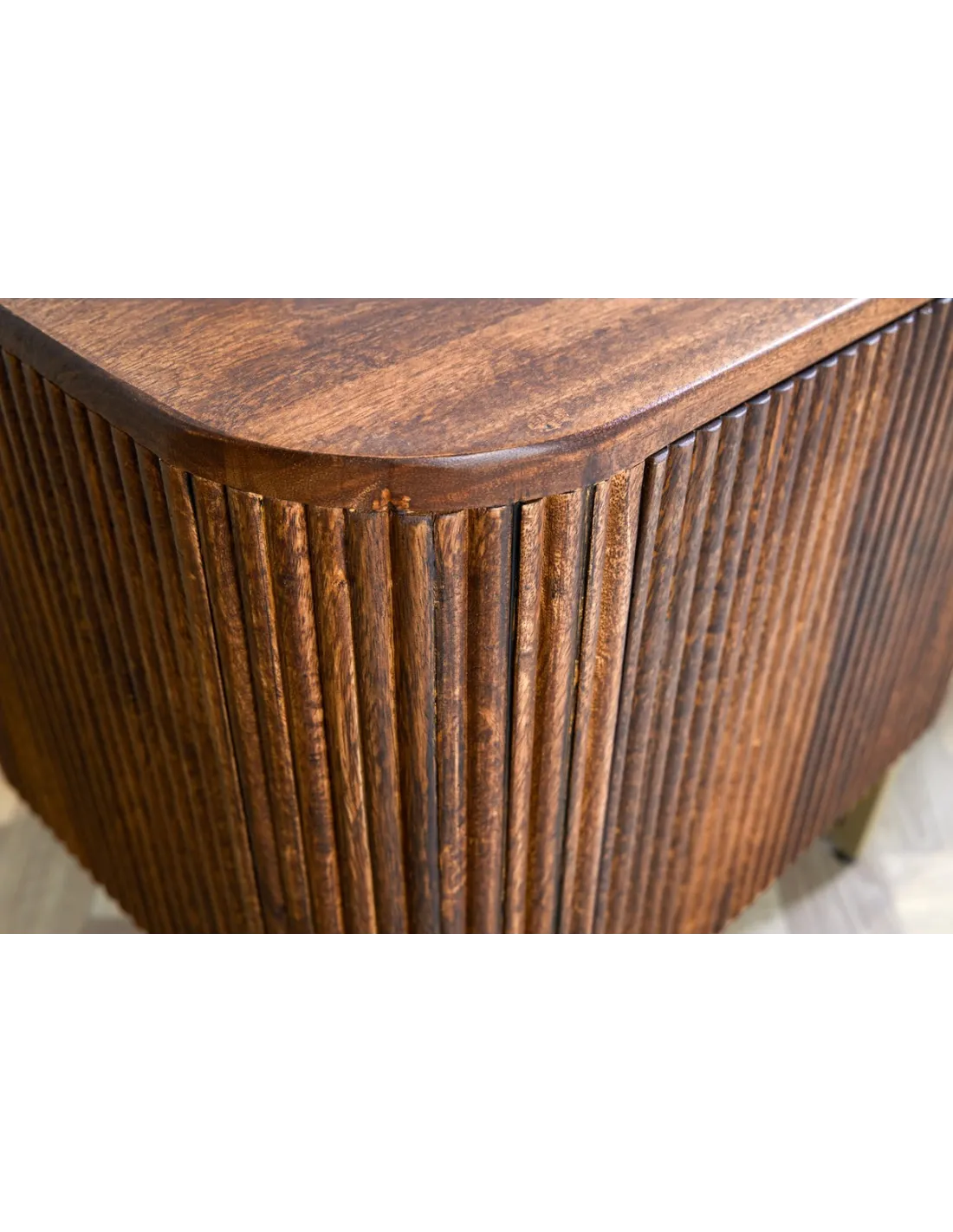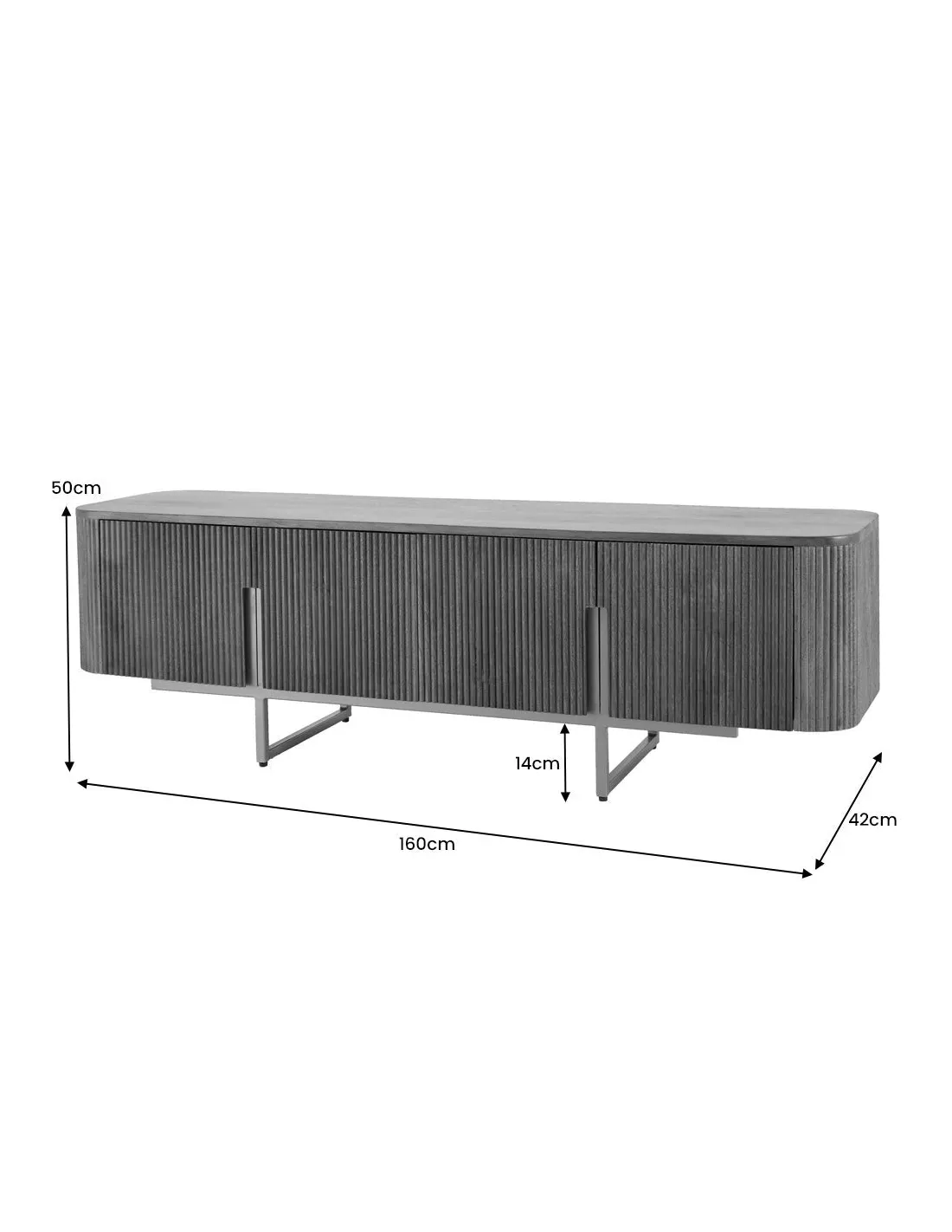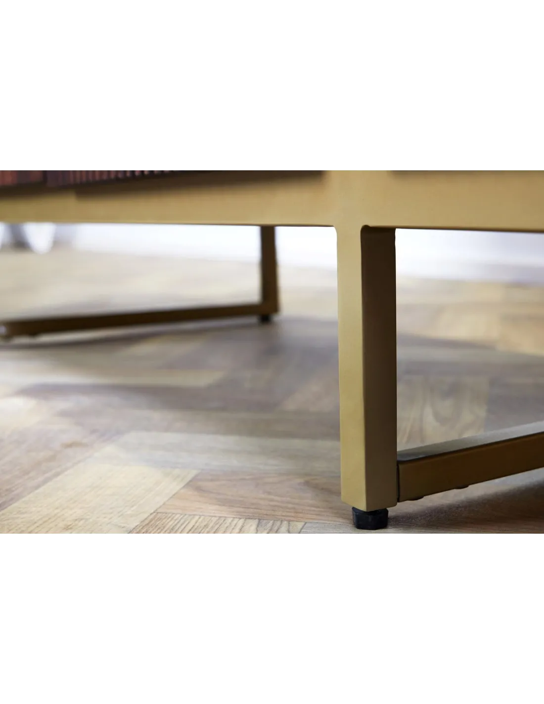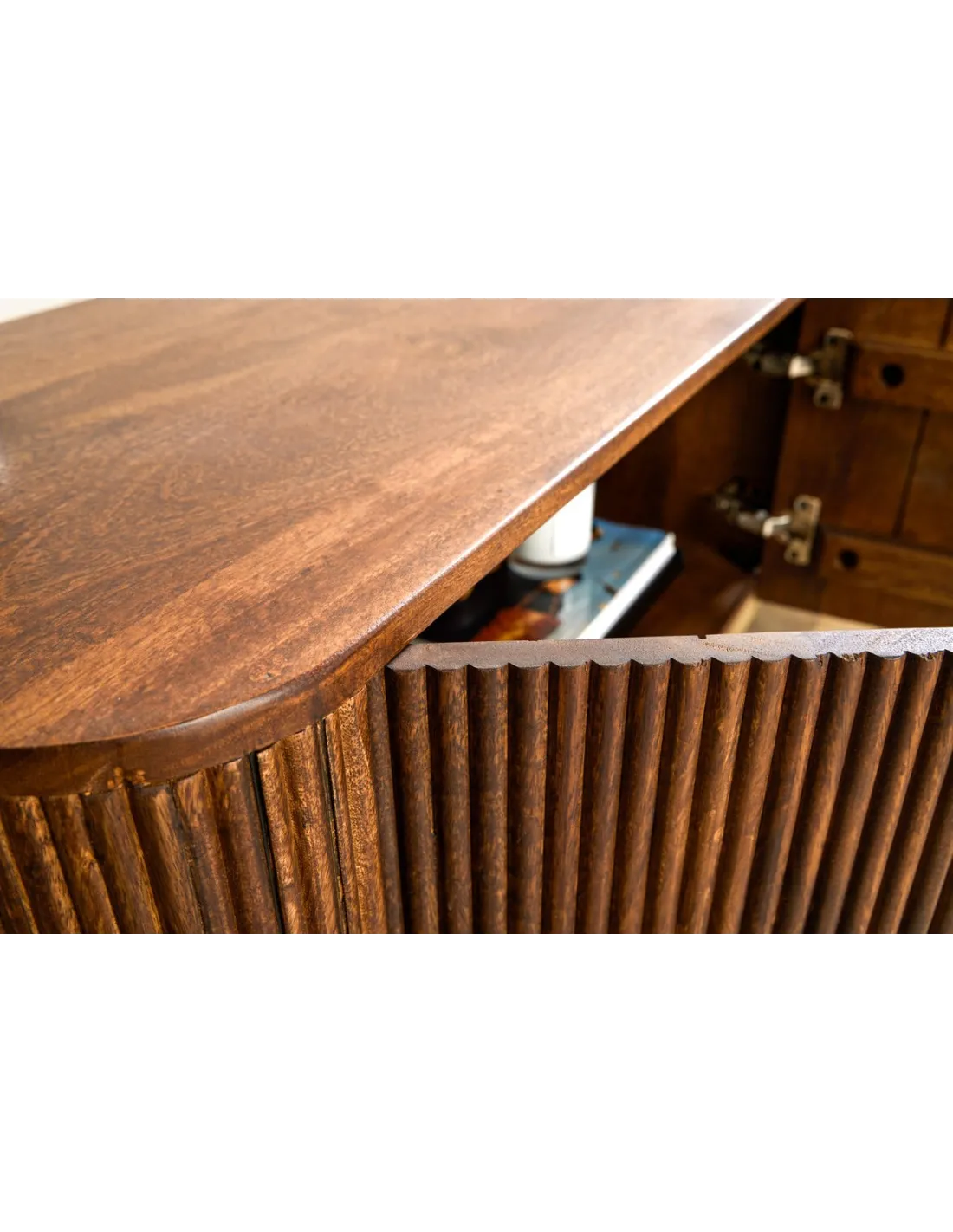 Le meuble TV en bois massif rainuré est une pièce maîtresse du design rétro qui ajoutera du charme à votre espace de divertissement. Fabriqué avec soin à partir de bois de manguier laqué et doté d'un cadre en métal doré, ce meuble TV combine élégance et fonctionnalité avec une finition naturelle.