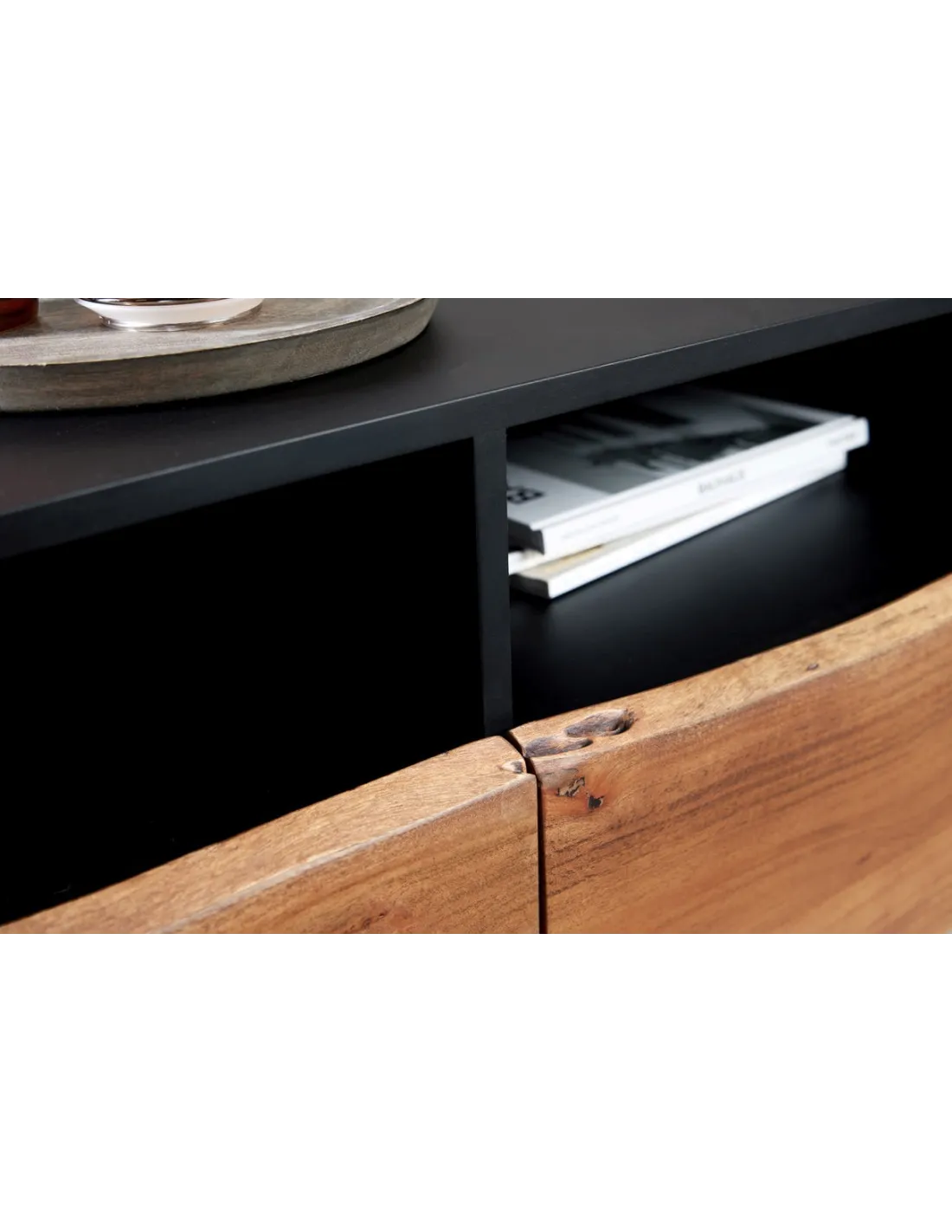 Design élégant et naturel : Les façades et le tiroir sont en acacia naturel, ajoutant une touche organique et chaleureuse à l’ensemble. Les variations naturelles du bois d'acacia, qui peuvent inclure des différences de couleur et de légères irrégularités, confèrent à chaque meuble un caractère unique et authentique.