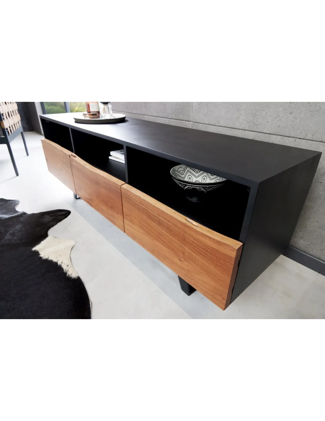 Matériaux durables : Le corps du buffet et les façades sont fabriqués en MDF solide et durable, tandis que le cadre en fer, peint par poudrage dans une teinte anthracite, ajoute une touche industrielle moderne tout en offrant une stabilité renforcée. La finition en anthracite sur le cadre et le corps se marie harmonieusement avec le bois naturel, créant un contraste subtil et élégant.
