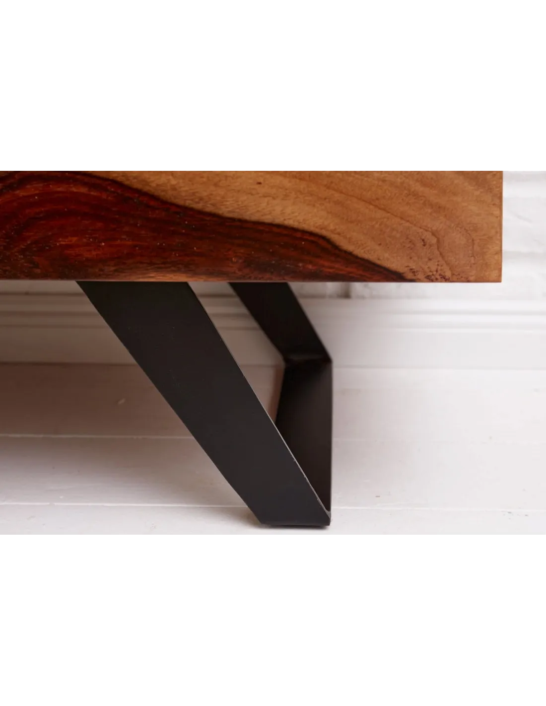 - Structure Robuste : La construction en bois massif de sheesham garantit une stabilité et une longévité exceptionnelles, tandis que le cadre métallique assure un soutien solide et ajoute une touche de modernité.