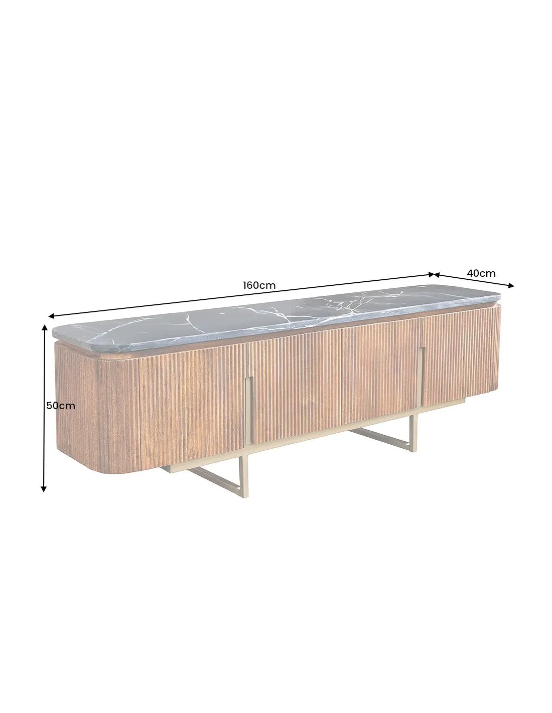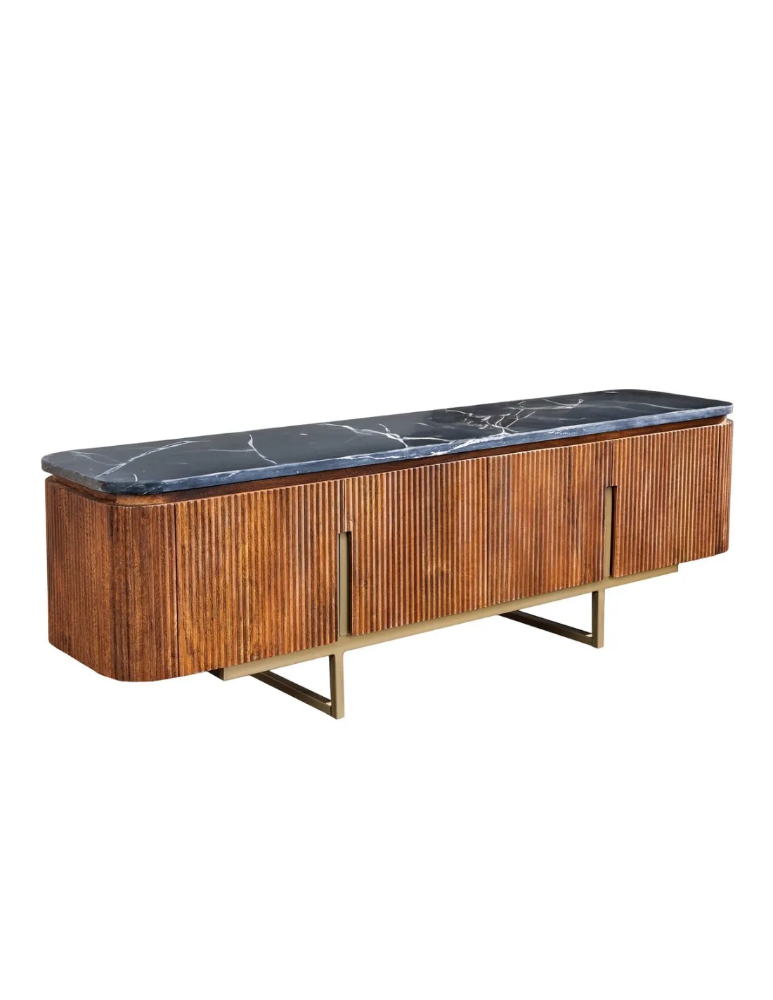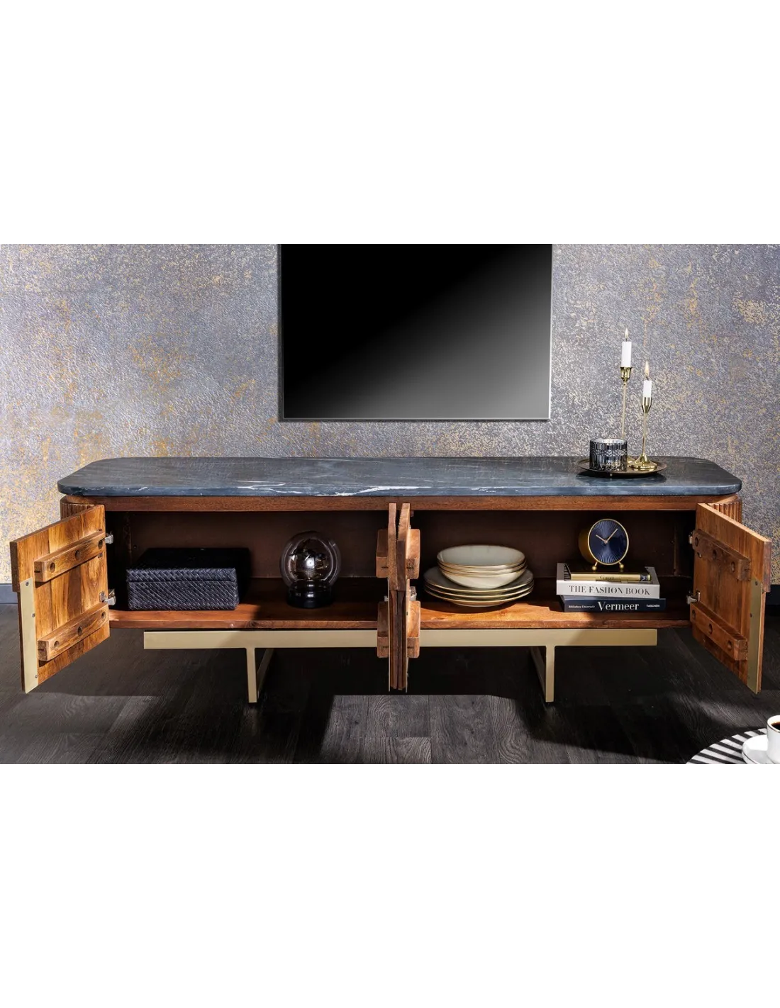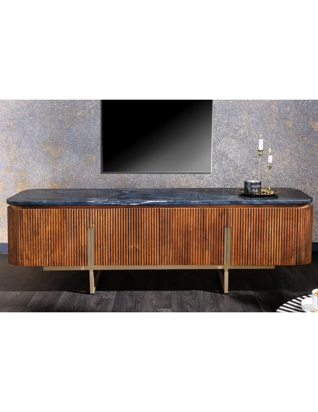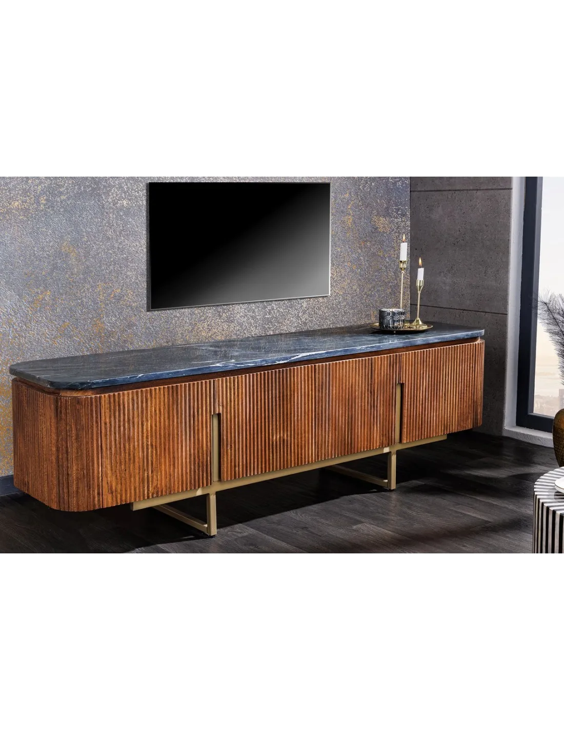 Meuble TV Gatsby 160cm en bois de manguier plateau marbre noir piètement doré
