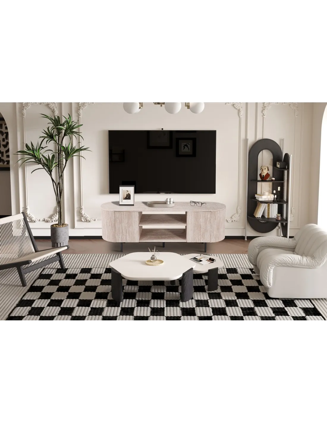 Ce meuble TV allie fonctionnalité et style : il offre un espace optimisé pour votre téléviseur et vos équipements multimédia, tout en apportant une touche décorative élégante à votre pièce.
