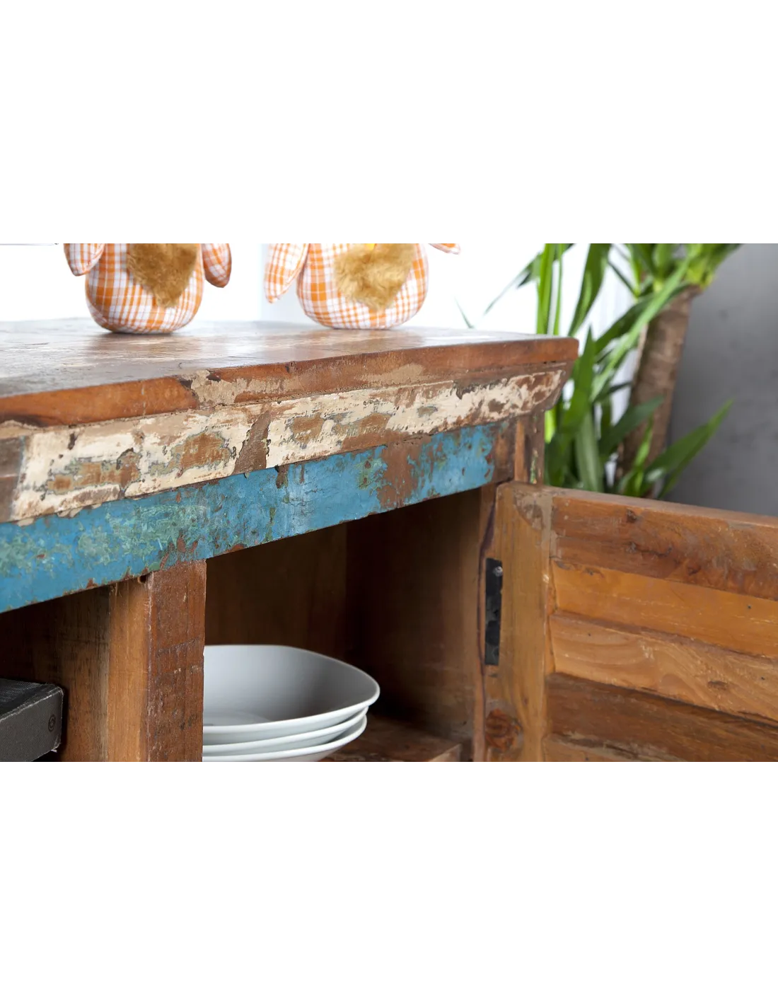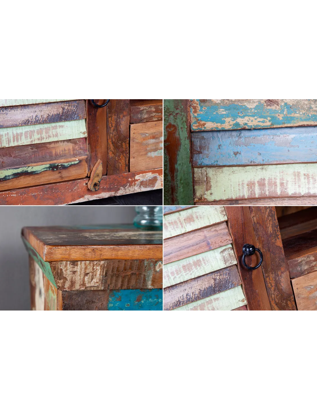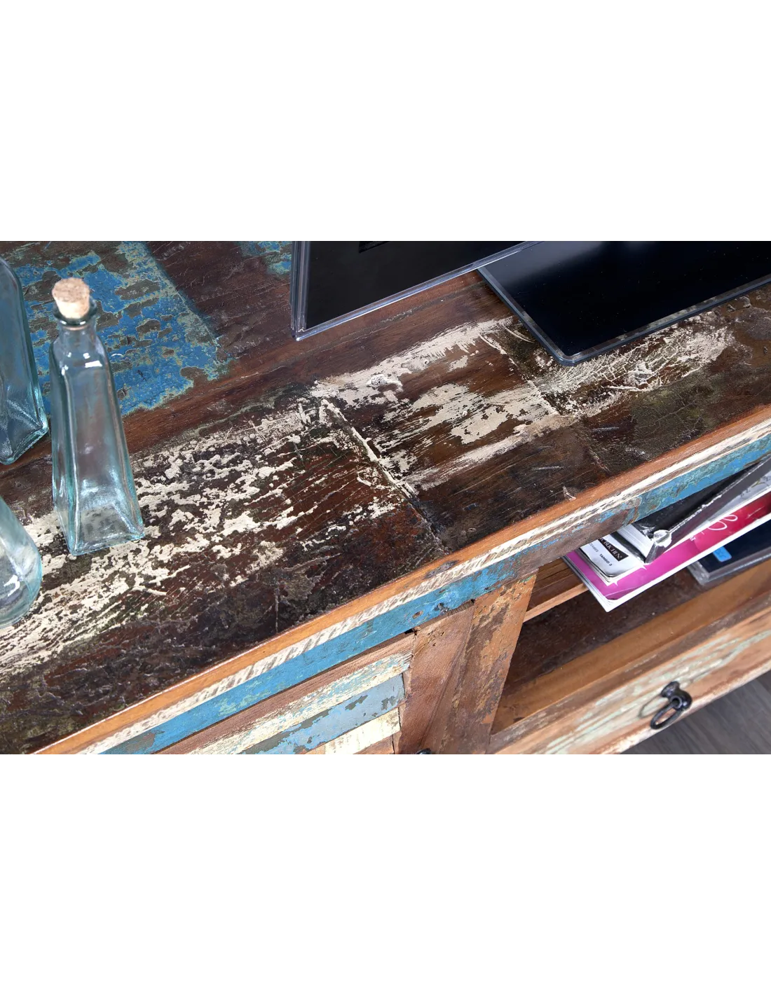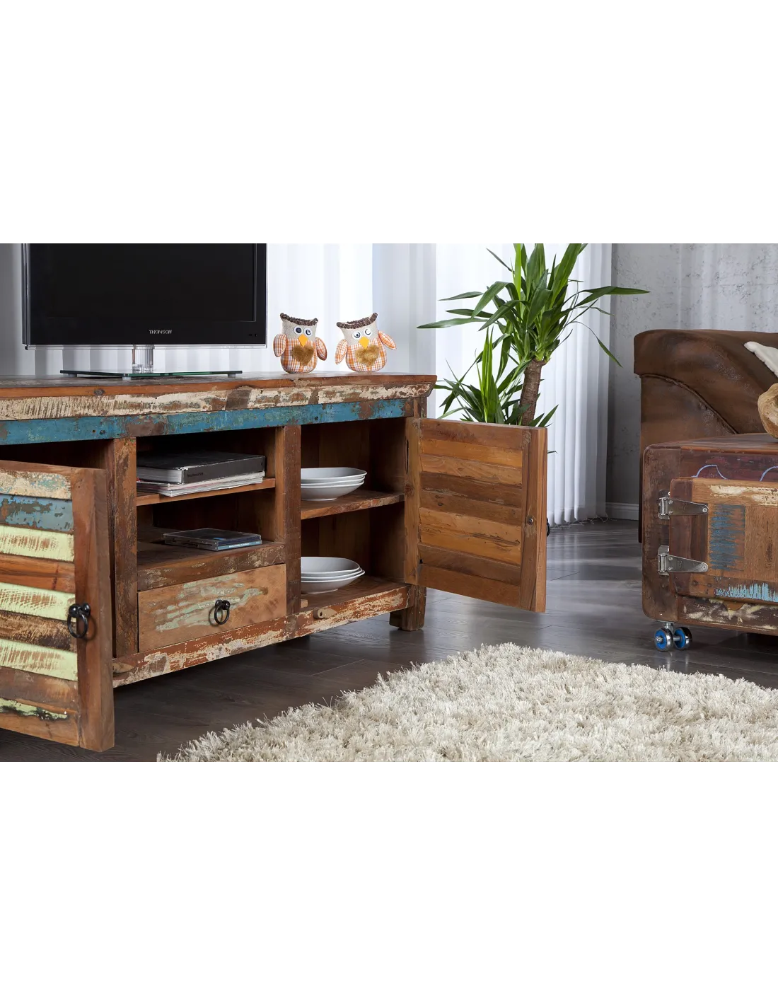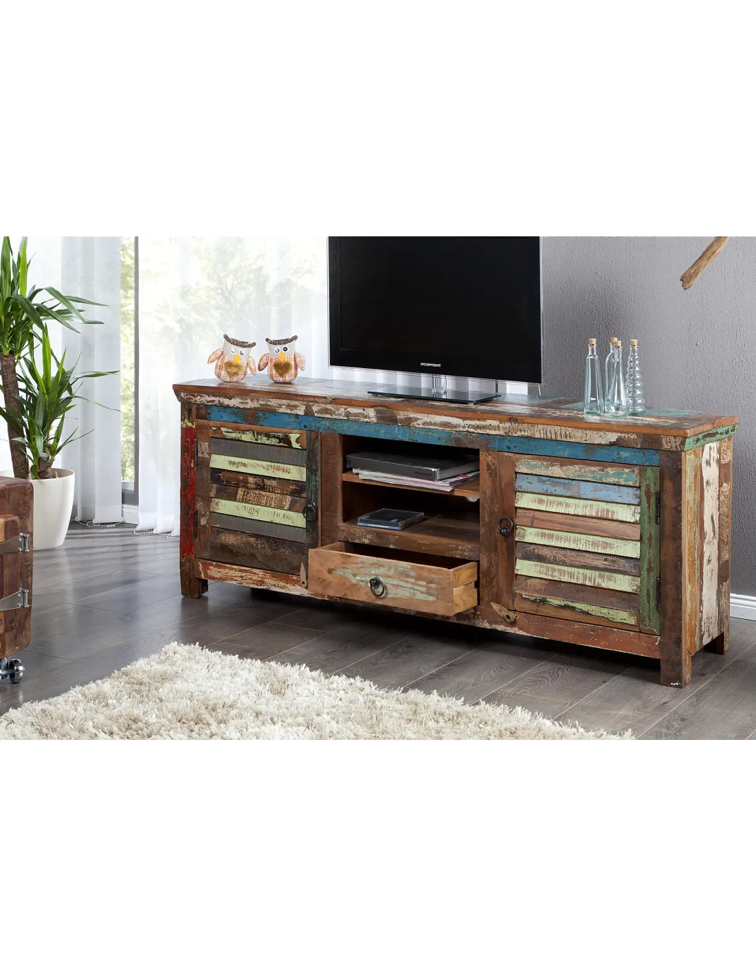 Meuble TV chic aux multiples couleurs, solide en bois massif, présente les biens faits du recyclage.