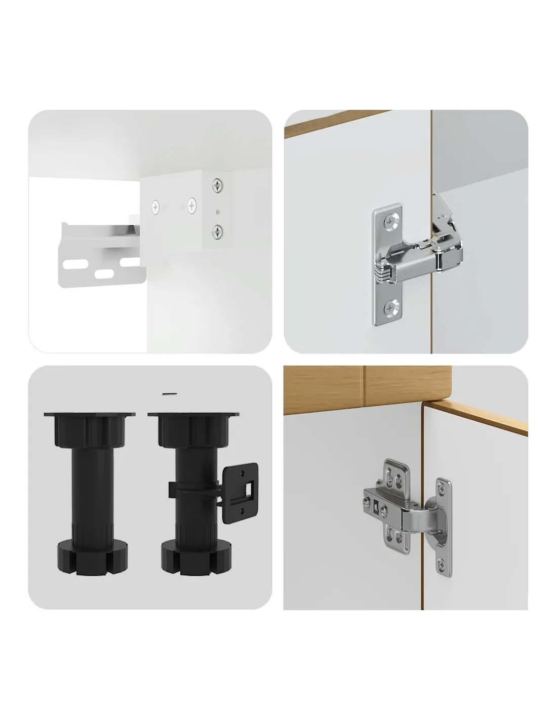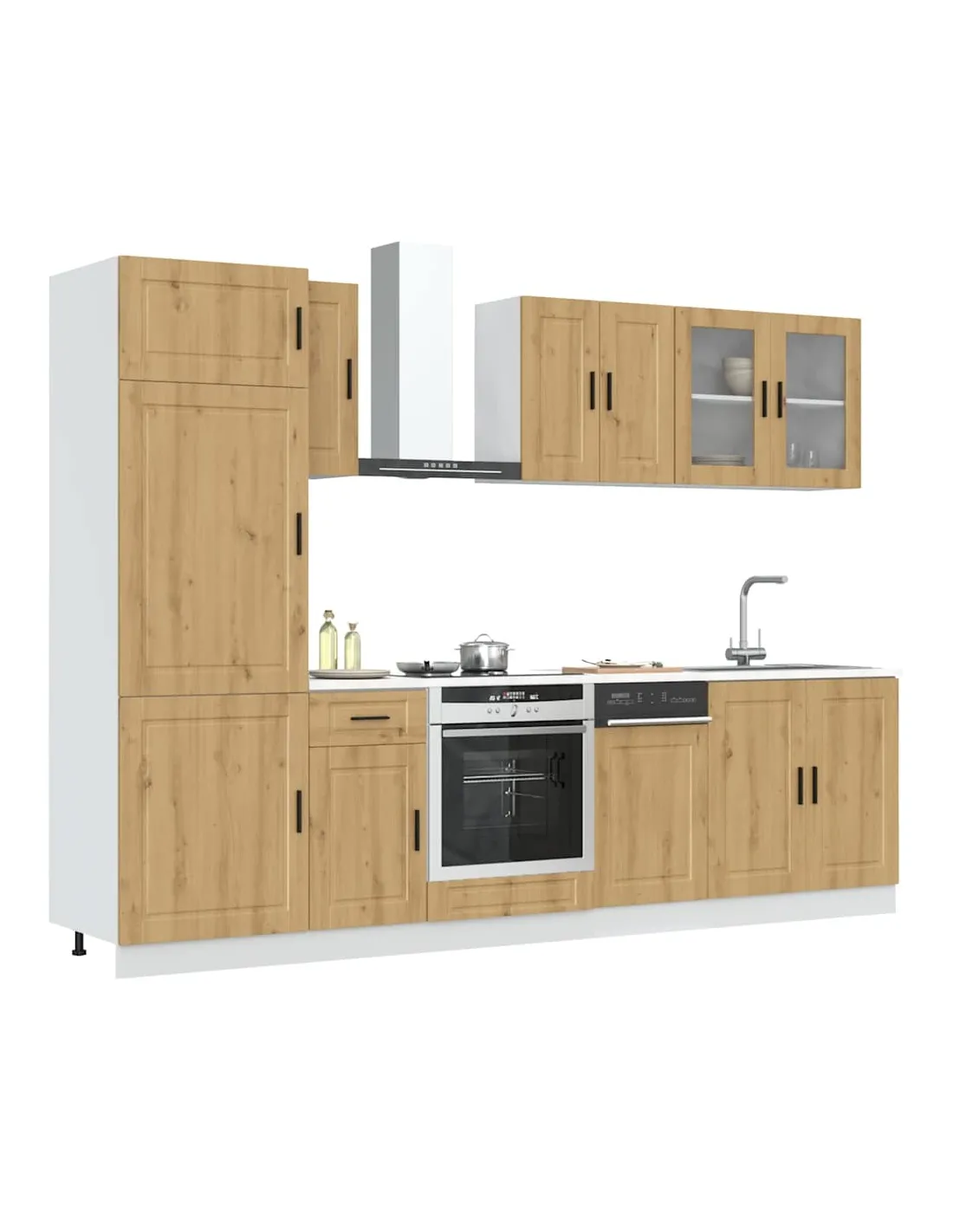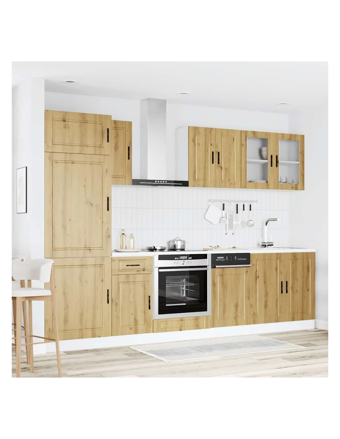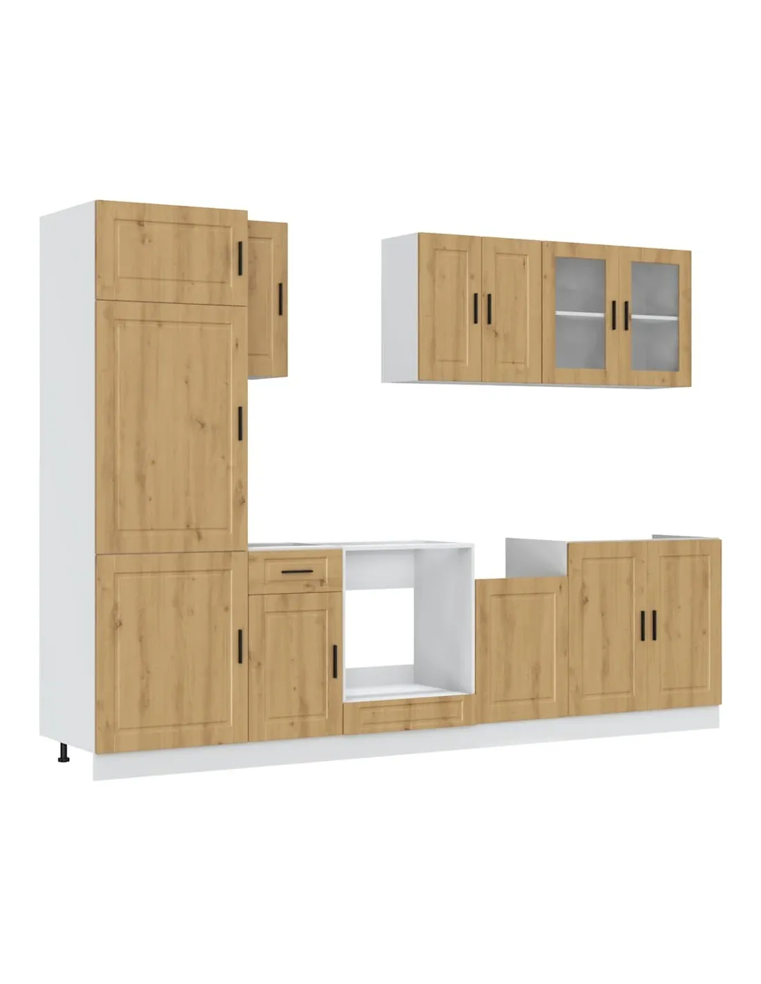 Cet ensemble de meubles de cuisine de 8 pièces, au design élégant, optimise votre espace de cuisine et offre un espace de rangement suffisant pour vos effets personnels ! Matériau stable et durable : le bois d'ingénierie est un matériau durable et stable dont la surface lisse résiste à l'humidité, à la déformation et au fendillement, ce qui en fait un choix fiable pour une grande variété de projets.Grand espace de rangement : l'ensemble d'armoires de cuisine comporte de nombreux compartiments et offre suffisamment d'espace pour ranger bols, assiettes, casseroles et autres appareils de cuisine.Pieds réglables : Les armoires inférieures sont dotées de pieds réglables qui peuvent être ajustés en hauteur pour s'adapter à l'agencement de votre cuisine.Facile à entretenir : grâce à leur surface lisse, ces armoires de cuisine sont faciles à nettoyer avec un chiffon humide et nécessitent moins d'entretien. Attention :Pour éviter qu'il ne bascule, ce produit doit être utilisé avec le dispositif de fixation murale fourni. Bon à savoir :Les vis et les chevilles pour l'intérieur du mur ne sont pas incluses. Recherchez et utilisez des vis et des chevilles adaptées à vos murs. Si vous n'êtes pas sûr, demandez conseil à un professionnel. Lisez et suivez attentivement chaque étape des instructions.Le plan de travail, l'évier et le robinet ne sont pas inclus dans la livraison.