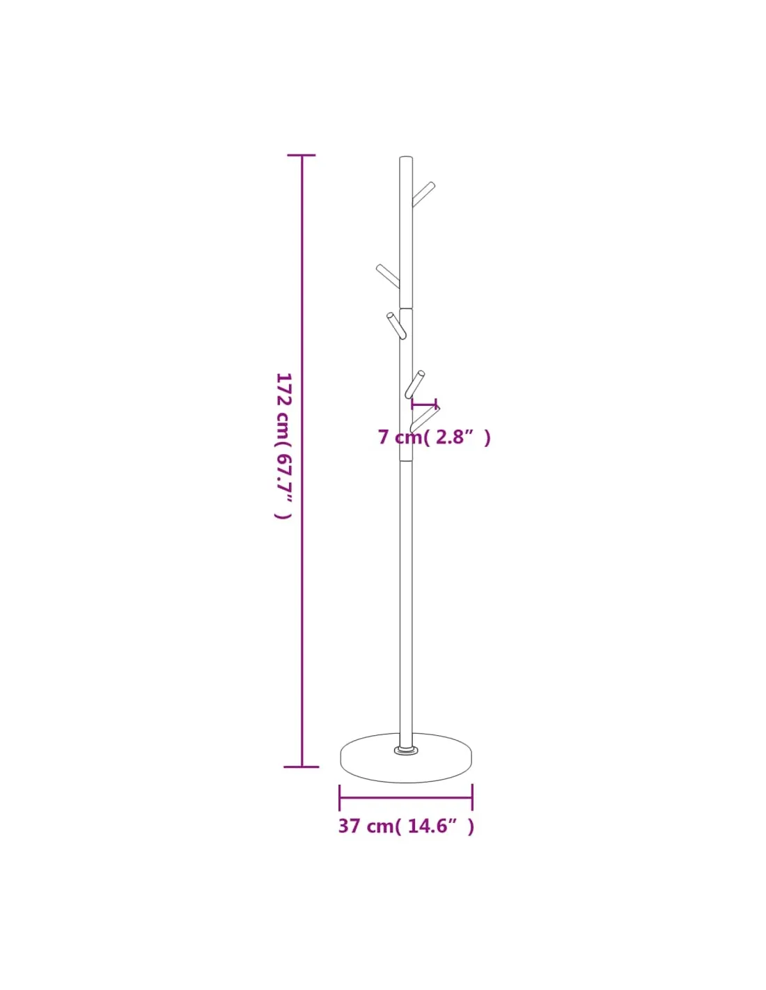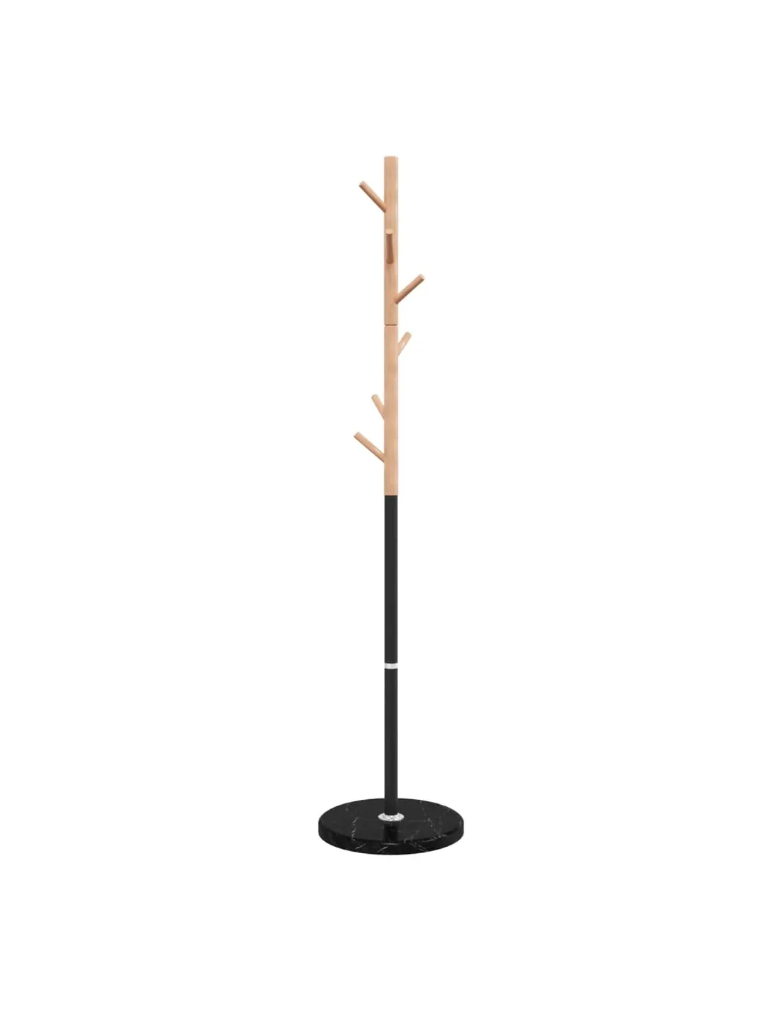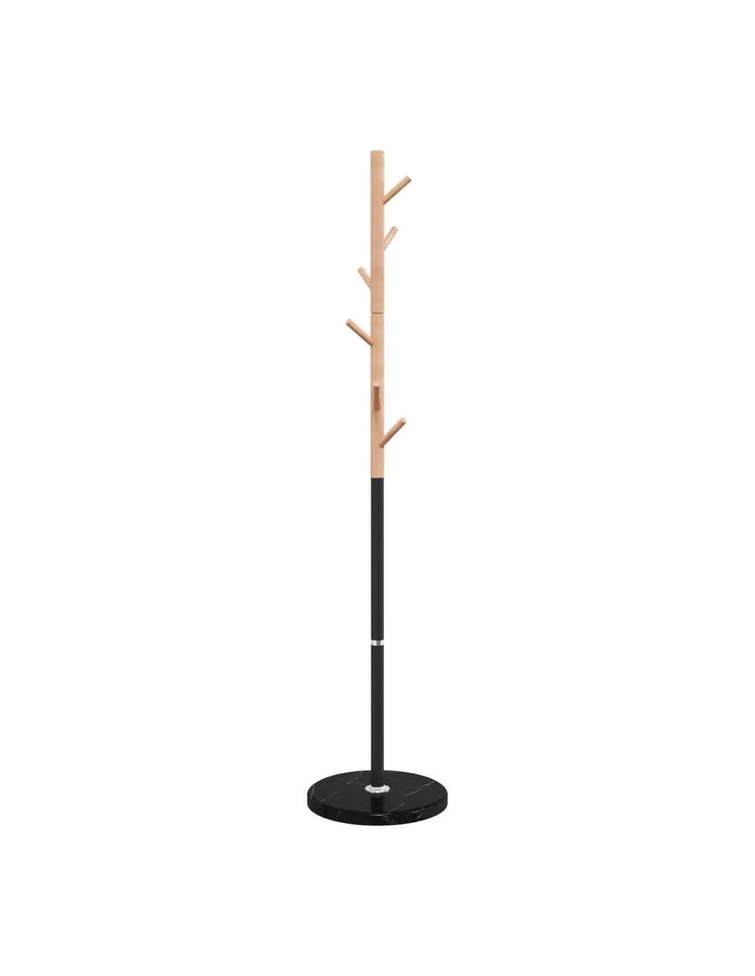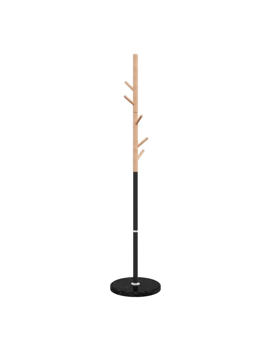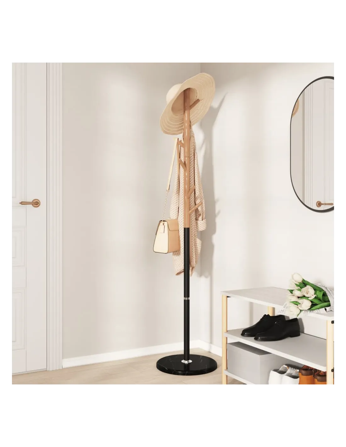 Ce porte-manteau pratique vous permettra d'organiser vos affaires et de les rendre facilement accessibles ! Cadre stable et robuste : le fer est un matériau solide et dur. C'est un solide favori dans la construction industrielle et la fabrication de meubles. Le bois de hêtre a un grain droit et est très durable. Fabriqué en fer et en bois de hêtre, ce porte-manteau est robuste et durable.Espace de rangement suffisant : le cintre comprend 6 patères de rangement pour offrir beaucoup d’espace pour accrocher des articles, notamment des vêtements, des sacs, des chapeaux, etc. Avec les patères à différents niveaux, le support aide à ranger vos affaires de manière ordonnée.Base robuste : la base est en marbre, elle est donc suffisamment lourde pour que le porte-manteau reste stable.Nombreuses applications : ce porte-manteau sur pied pratique est parfait pour être placé dans le couloir, le salon, la chambre à coucher ou tout autre endroit où vous avez besoin d'être mieux organisé pour garder votre maison propre et bien rangée ! Bon à savoir :Chaque base en marbre a un motif unique. La livraison est aléatoire, ce qui garantit l'exclusivité et l'individualité de votre produit.