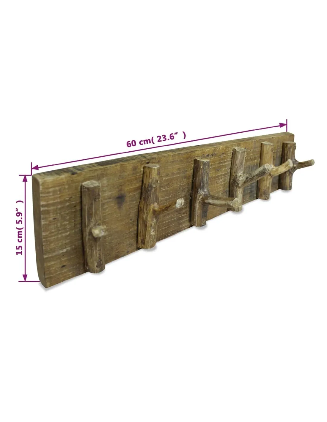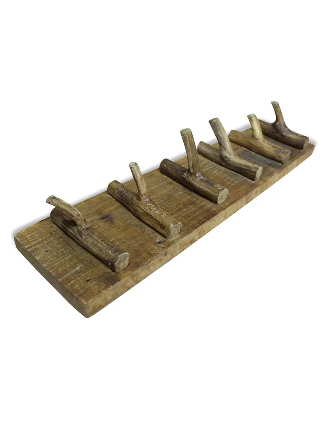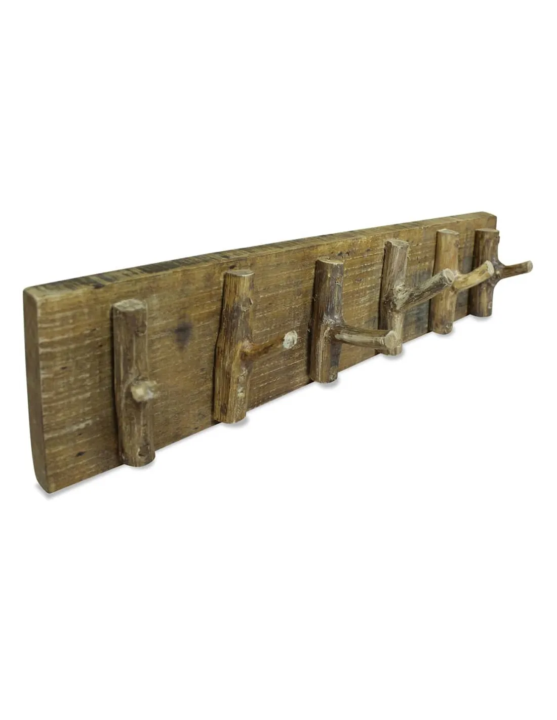 Ce porte-manteau en bois rustique sera un accessoire pratique et décoratif pour votre maison. Le porte-manteau est en bois de récupération massif, qui a les caractéristiques de différents bois comme l'acajou, le teck, le bois dur, le bois du manguier, l'acacia, etc. Vous pouvez trouver des cavités laissées par des clous, des vis ou des boulons avec d'autres imperfections, soulignant l'authenticité du matériau. Ces imperfections révèlent une histoire riche et ne sont jamais réalisées intentionnellement. Le bois provient d'arbres tombés naturellement, de bateaux en bois, de maisons en bois, etc. Chaque pièce de ce meuble est unique et légèrement différente de la suivante. Les signes d'usure et l'artisanat de ce porte-manteau entièrement fait à la main donnent à chaque pièce un look unique et s'ajoutent à son style vintage spectaculaire. Avec 6 patères, le support offre un espace suffisant pour accrocher vos écharpes, cravates, manteaux, sacs, chapeaux, clés, etc. Remarque importante : les couleurs peuvent varier d'une pièce à l'autre, rendant chacun de nos porte-manteaux unique. La livraison est aléatoire, ce qui garantit l'exclusivité et l'individualité de votre produit.