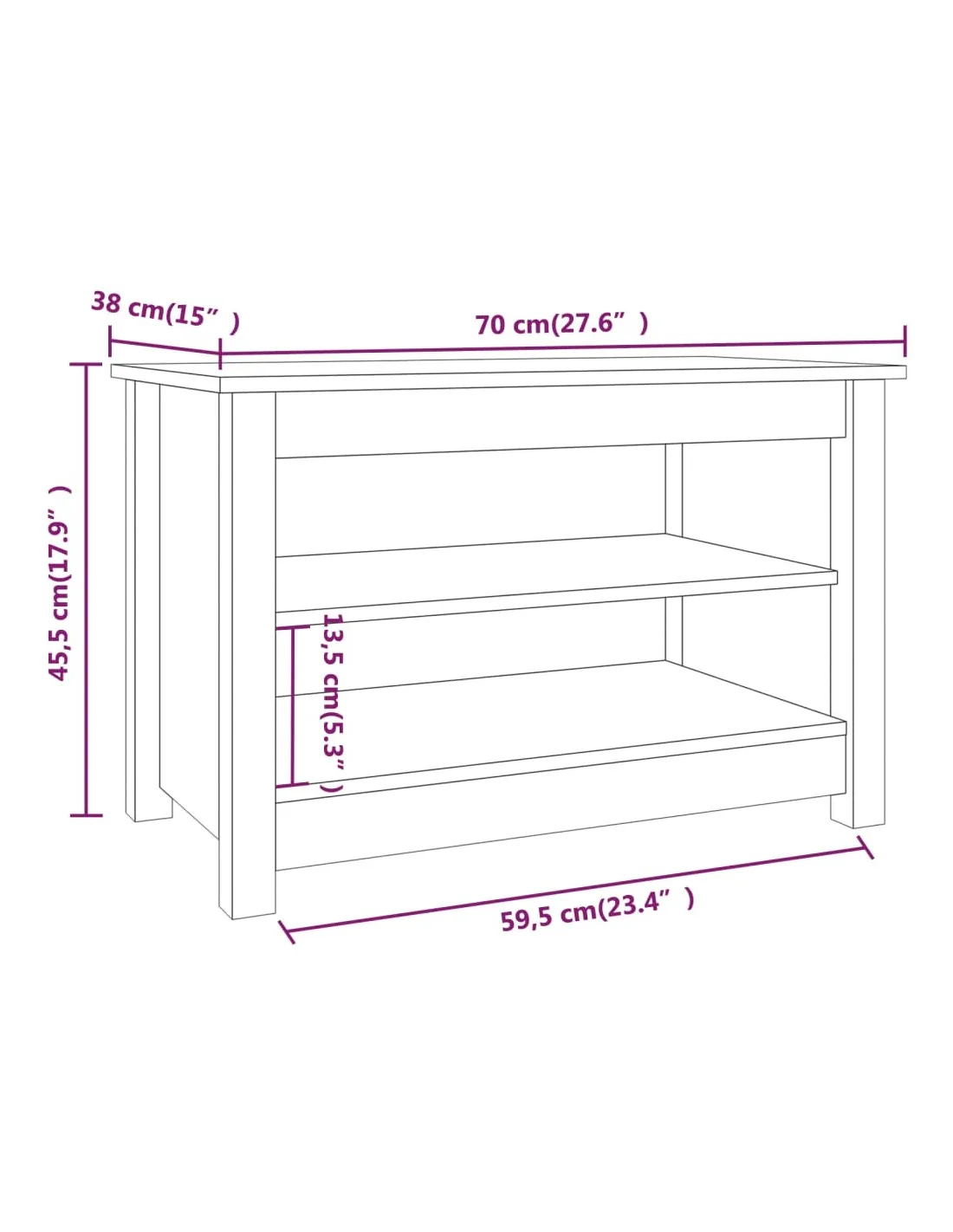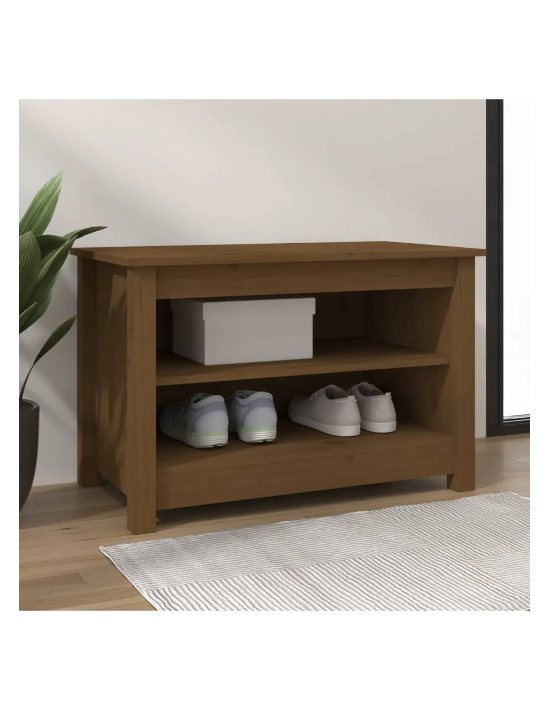 Ce banc à chaussures tendance est un endroit exceptionnellement pratique pour ranger soigneusement vos chaussures. Matériau de première qualité : le bois de pin massif est un matériau naturel magnifique. Le bois de pin a un grain droit et les nœuds donnent au matériau son aspect caractéristique et rustique.Grand espace de rangement : cette armoire à chaussures dispose de 2 étagères, offrant un grand espace de rangement pour ranger différents types de chaussures. Vous pouvez même placer des objets décoratifs sur son dessus tels que des vases, des plantes en pot, etc.Design élégant : ce meuble à chaussures au design élégant apportera une touche d'ambiance naturelle à votre décoration d'intérieur.