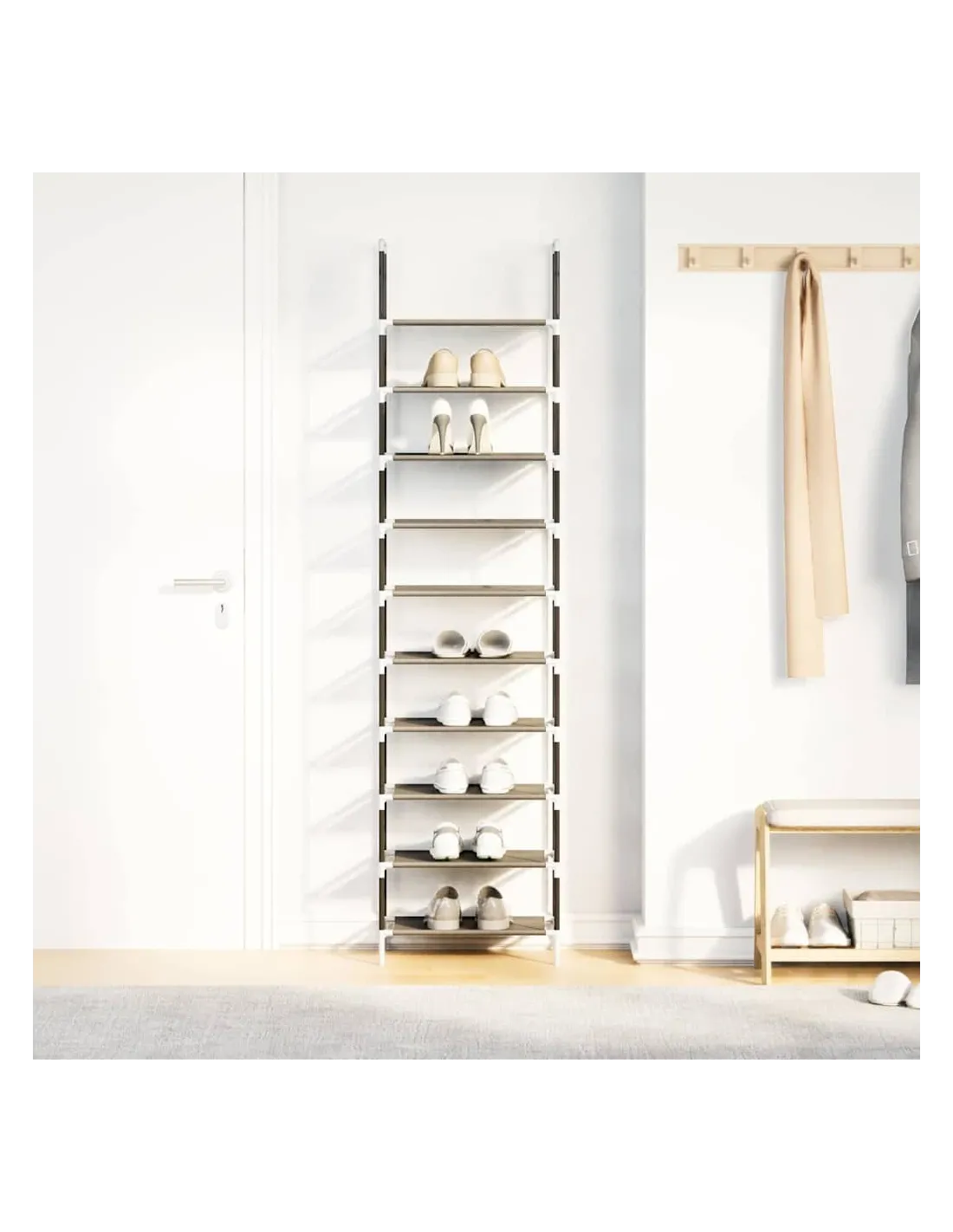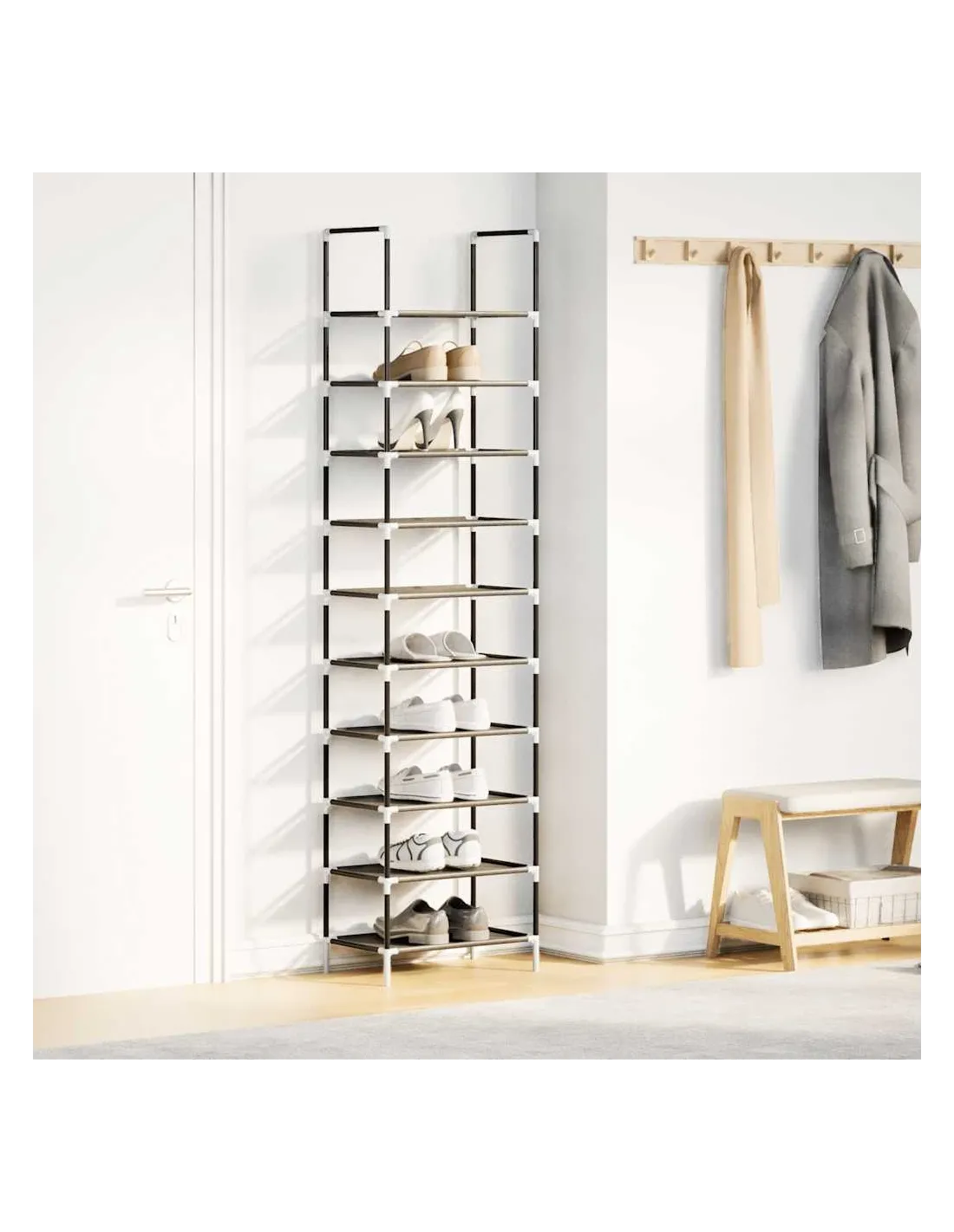 Gardez vos chaussures loin de l'encombrement pour créer un environnement bien rangé avec cette élégante étagère à chaussures ! Matériau respirant et durable : fabriquée en tissu non tissé, l'étagère est à la fois légère et solide, et offre une bonne respirabilité qui permet à vos chaussures de rester fraîches. Le matériau est résistant aux déchirures et peut être facilement nettoyé avec un chiffon humide, ce qui garantit une utilisation durable.Cadre robuste et stable : le cadre en acier enduit de poudre est solide, stable, durable et résistant à la corrosion et aux intempéries, ce qui garantit des performances durables.Grand espace de rangement : avec sa conception à 10 niveaux, ce rangement pour chaussures offre une capacité de stockage généreuse, vous permettant de garder toute votre collection de chaussures bien rangée et bien organisée dans un seul endroit pratique.Conception peu encombrante : l'étagère à chaussures peut contenir de nombreuses paires de chaussures sans prendre trop de place. Elle est parfaite pour être placée dans l'entrée, le couloir, à côté de la porte, dans la salle de bains, le salon ou tout autre endroit où vous avez besoin d'un rangement efficace.Solution de rangement multifonctionnelle : outre les chaussures, les étagères en tissu peuvent également être utilisées pour ranger d'autres articles tels que des sacs, des écharpes ou de petits bacs de rangement. Cette polyvalence offre une solution de rangement complète en une seule unité. Attention :Pour éviter qu'il ne bascule, ce produit doit être utilisé avec le dispositif de fixation murale (non fourni).