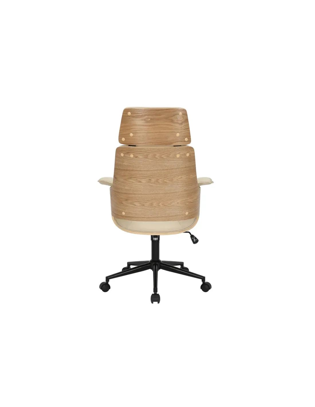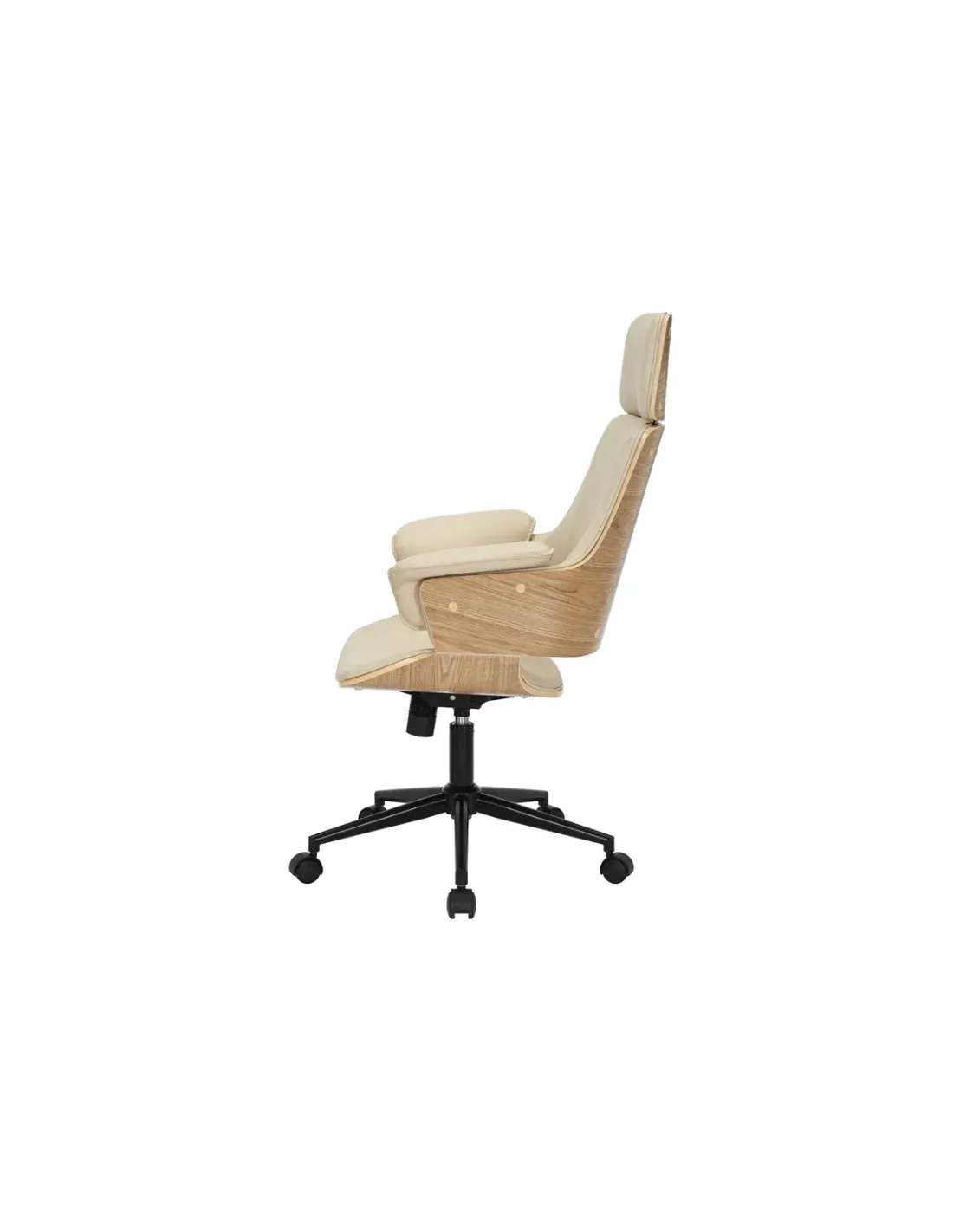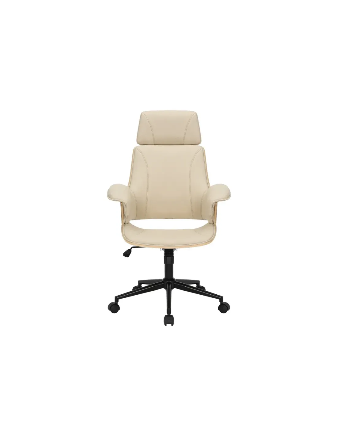 Alliant élégance et confort, la chaise de bureau Manhattan est conçue pour offrir une assise ergonomique et raffinée. Son revêtement en similicuir beige crème, associé à un placage en bois de chêne véritable, confère un style intemporel et chaleureux. Son dossier haut, son assise rembourrée et son mécanisme pivotant à 360° en font une chaise idéale pour le bureau ou l’espace de travail à domicile.