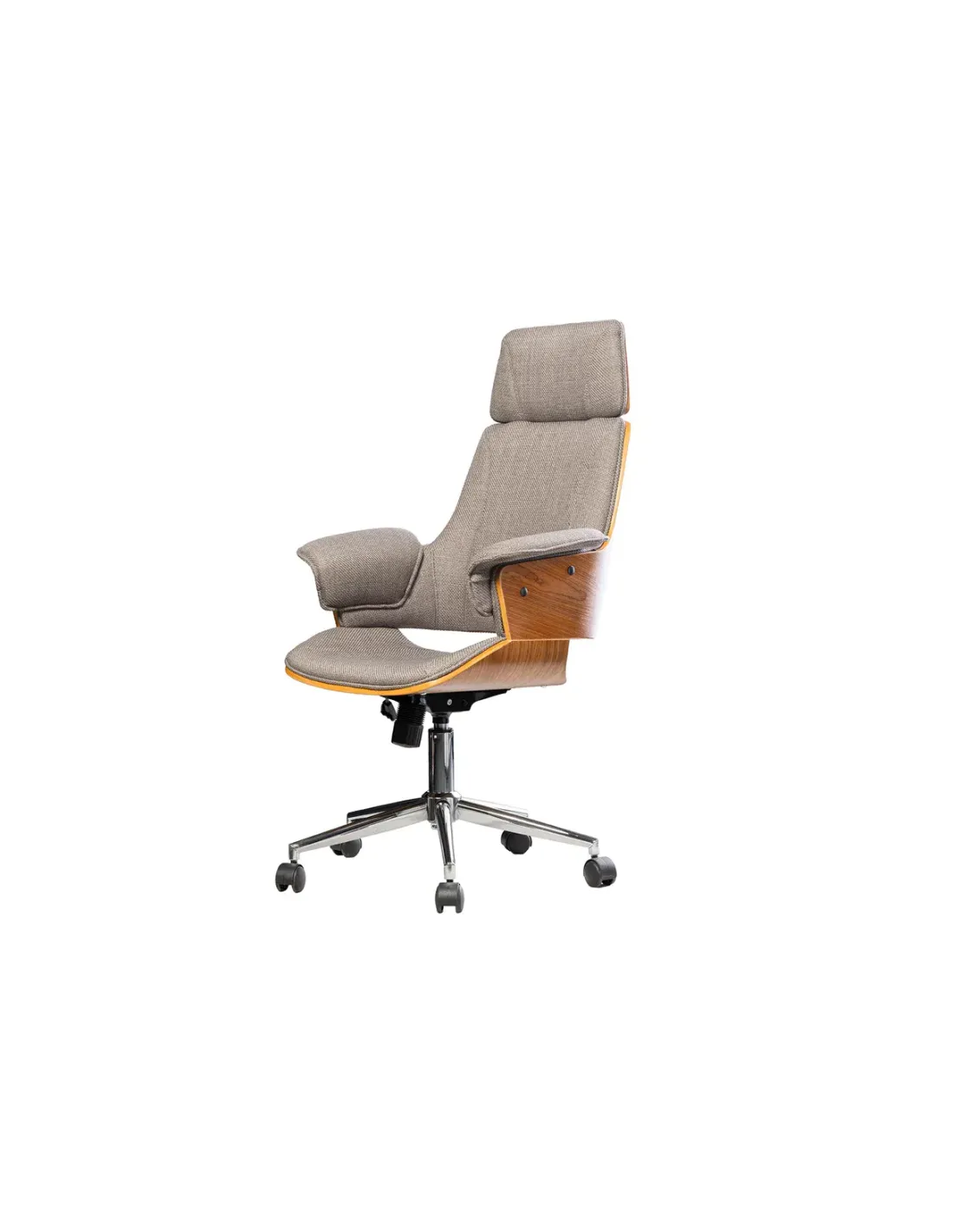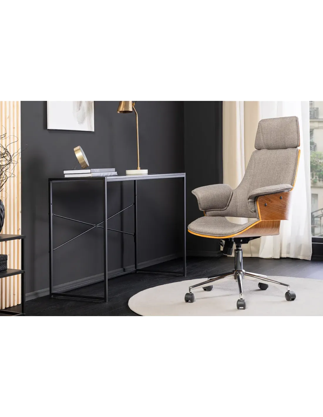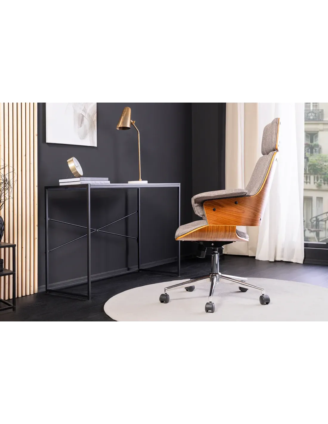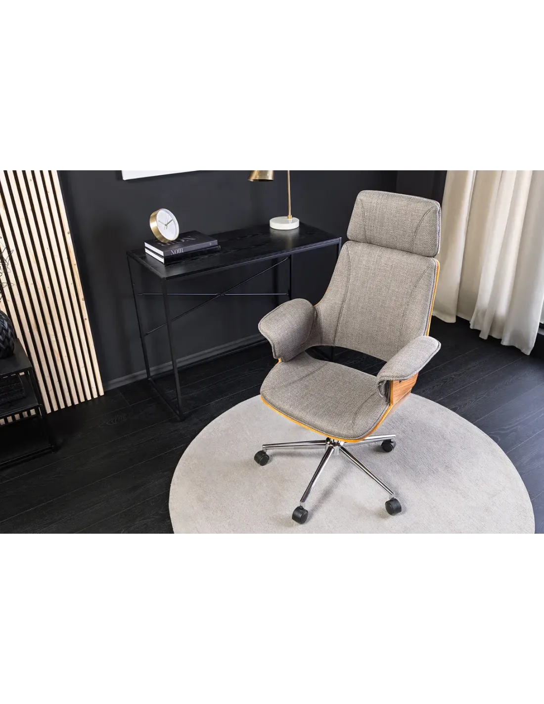 👉 La chaise de bureau Manhattan en tissu texturé gris et bois de noyer est le parfait compromis entre élégance, confort et praticité, idéale pour un bureau moderne et raffiné.